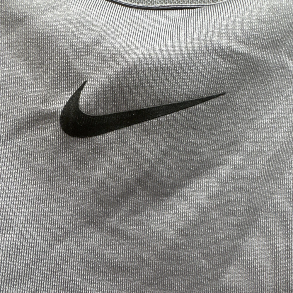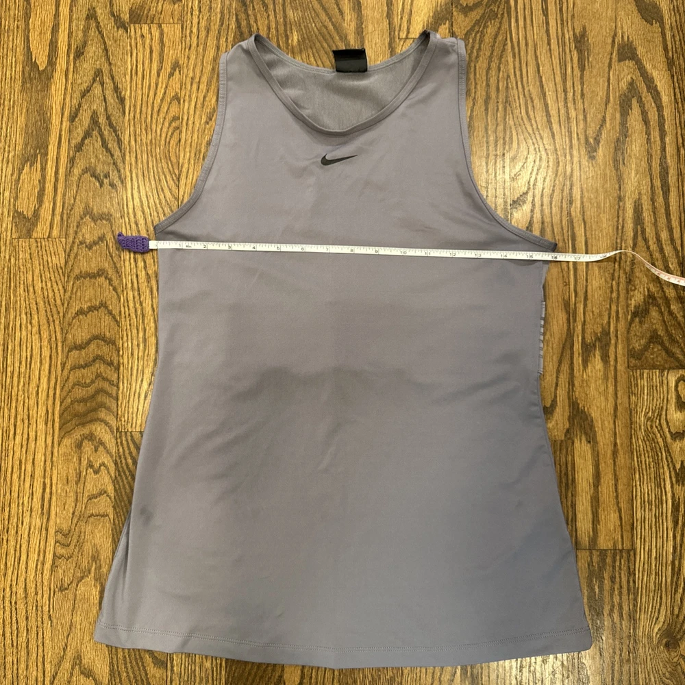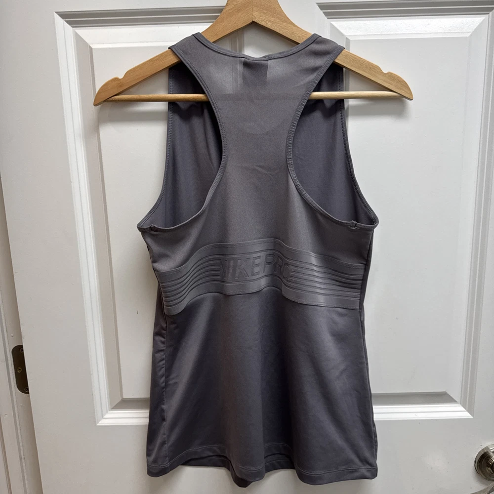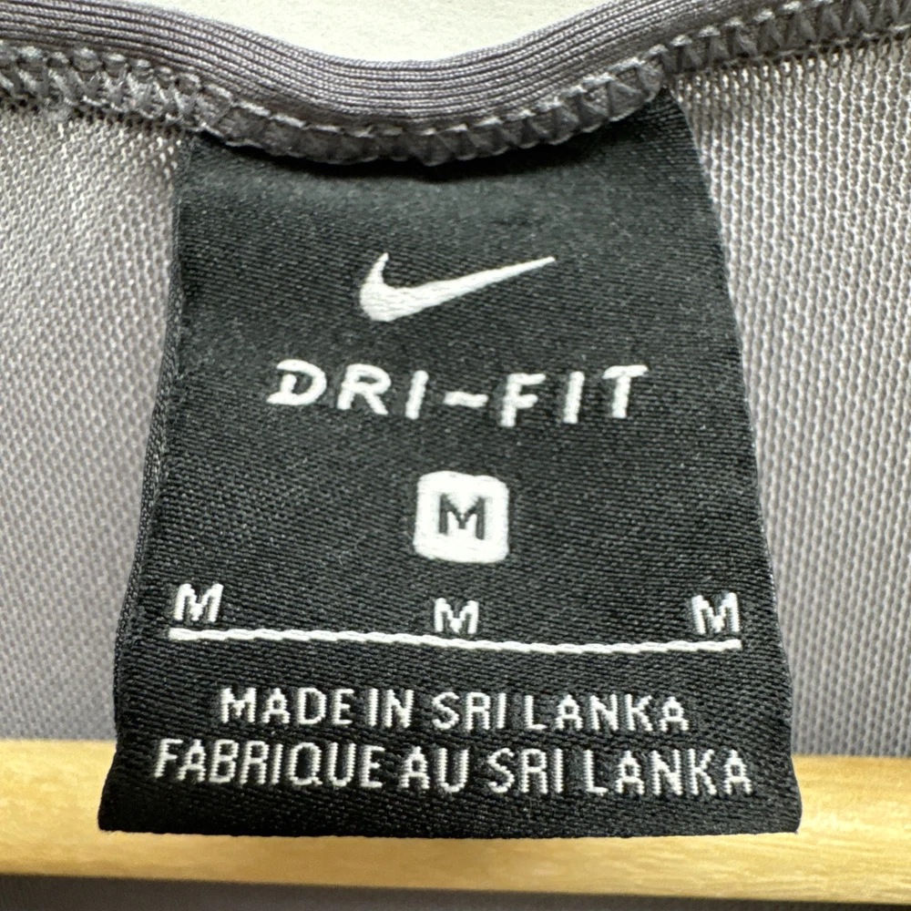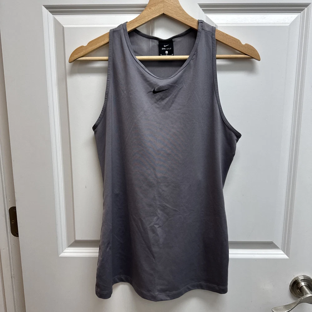 The Nike Pro Women's Dri-fit Tank Top in size Medium features a scoop neckline and racerback design in a grey color with a multicolor Nike logo. Made of a lightweight and breathable polyester blend fabric, this activewear top is suitable for various sports activities like tennis, volleyball, running, yoga, and more. The tank top offers a stretchy fit for comfort and is machine washable for easy care, making it a versatile and stylish choice for summer, fall, and spring seasons.