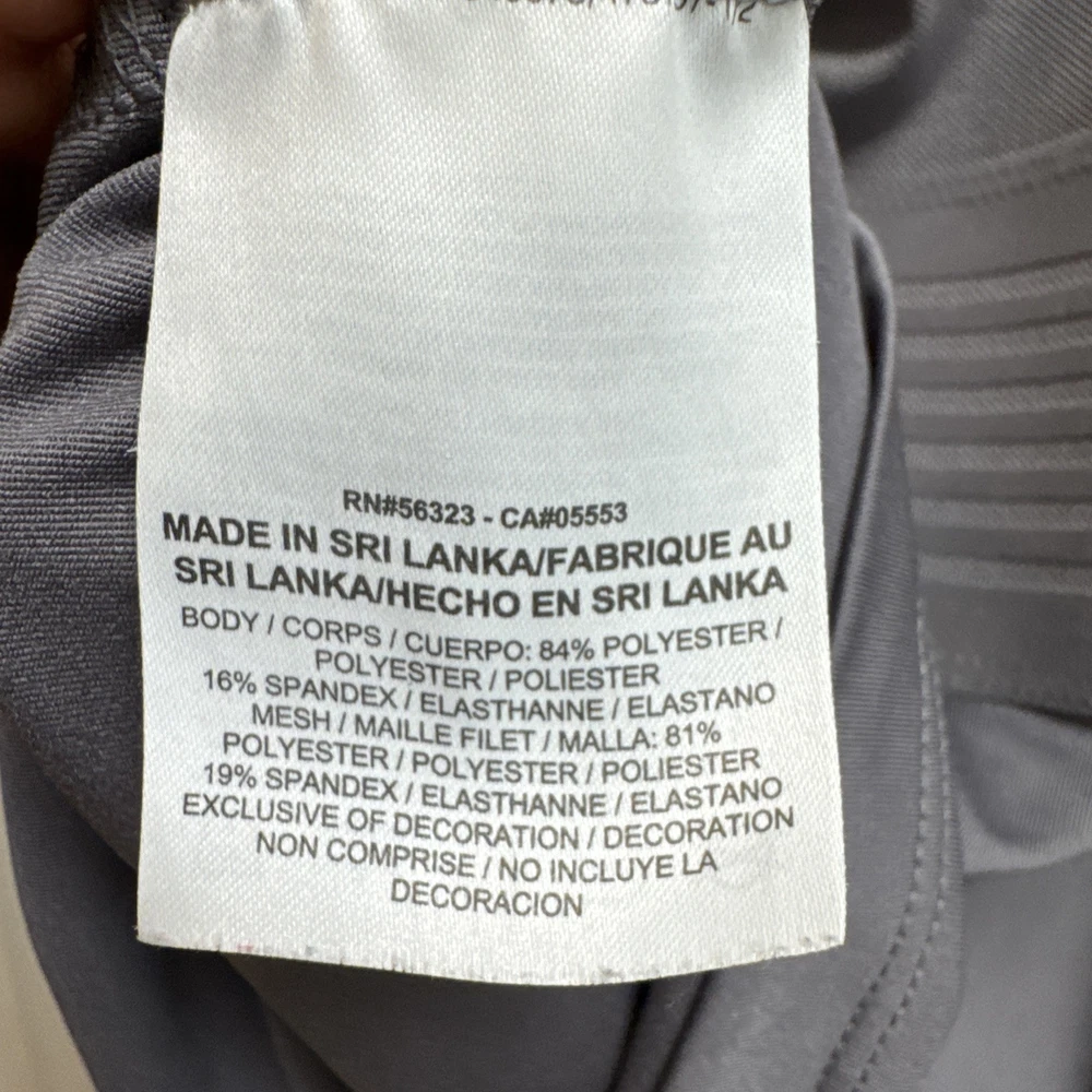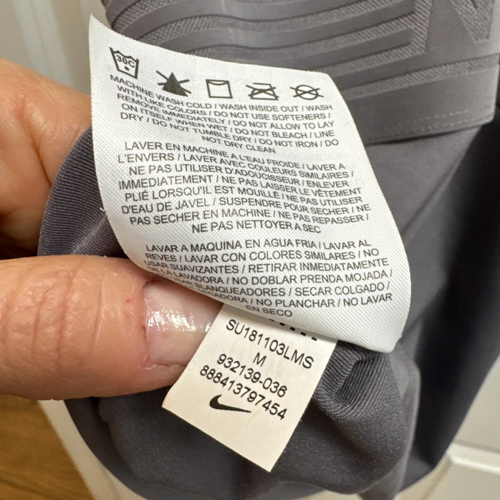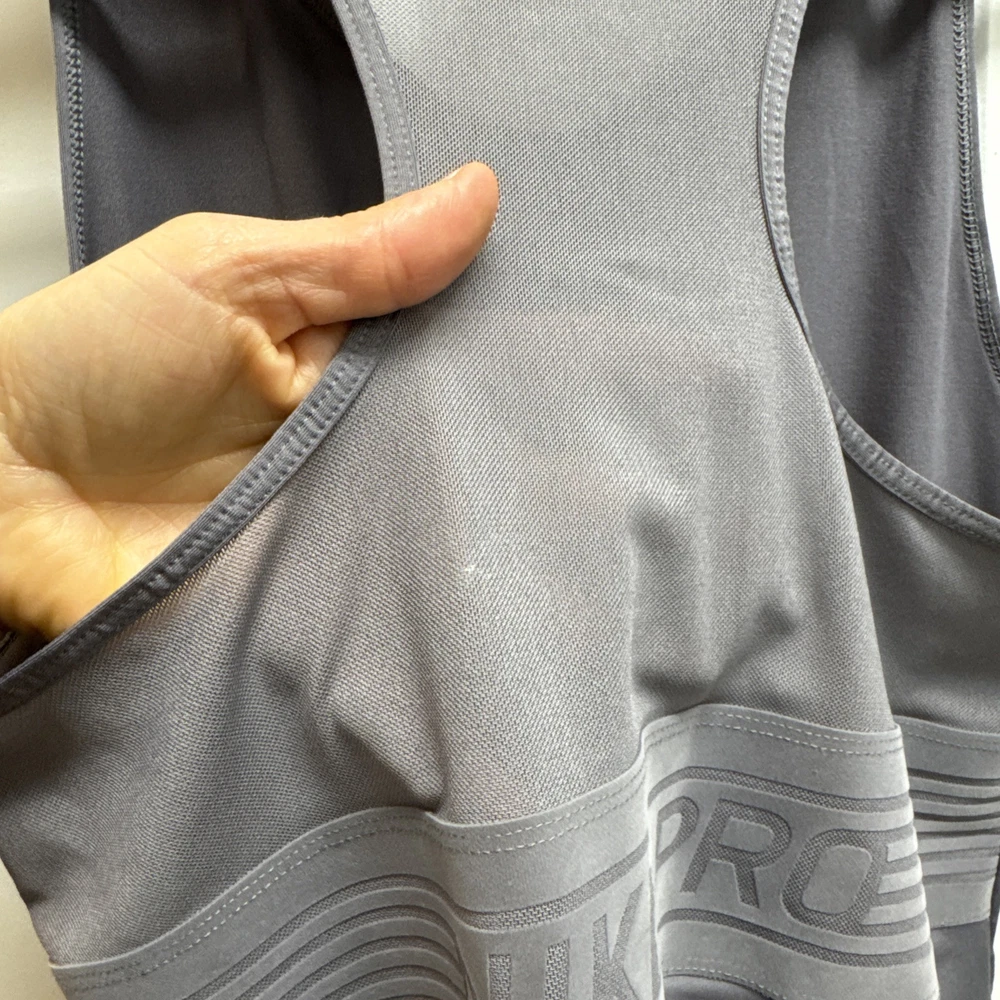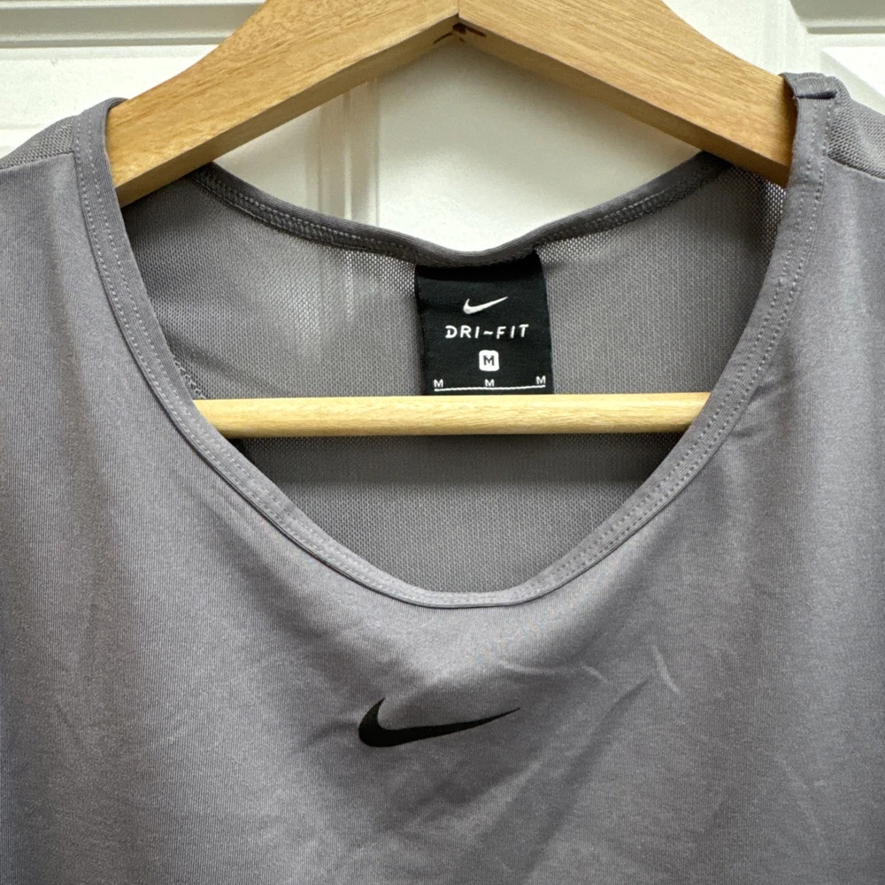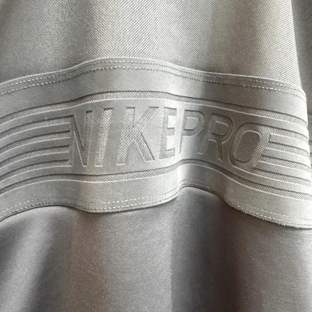 The Nike Pro Women's Dri-fit Tank Top in size Medium features a scoop neckline and racerback design in a grey color with a multicolor Nike logo. Made of a lightweight and breathable polyester blend fabric, this activewear top is suitable for various sports activities like tennis, volleyball, running, yoga, and more. The tank top offers a stretchy fit for comfort and is machine washable for easy care, making it a versatile and stylish choice for summer, fall, and spring seasons.