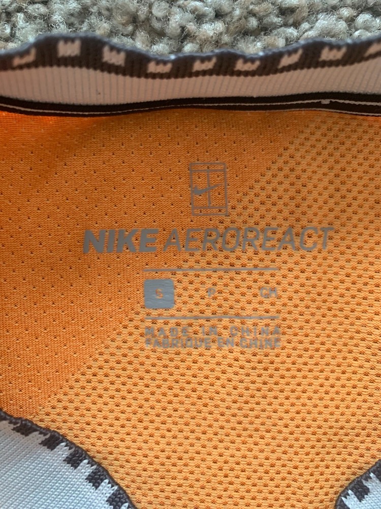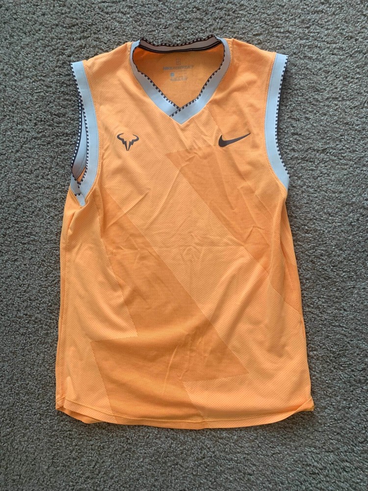This Nike Rafa Nadal sleeveless shirt is a must-have for tennis fans and athletes alike! The bold orange color and iconic bull design make it stand out, while the Aeroreact fabric keeps you cool and comfortable during intense matches. The fit is perfect—lightweight, breathable, and unrestricted for full mobility. Whether you're hitting the court or just want a stylish, sporty look, this tank delivers. The V-neck adds a classic touch, and the quality is top-notch, just like Rafa’s game. Highly recommend for performance and style!