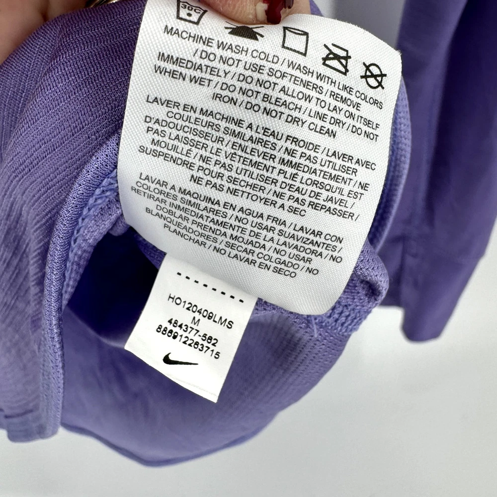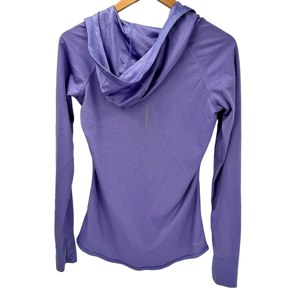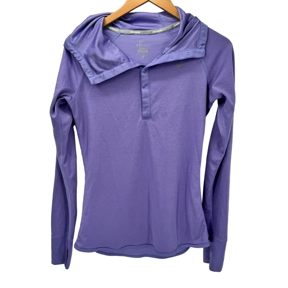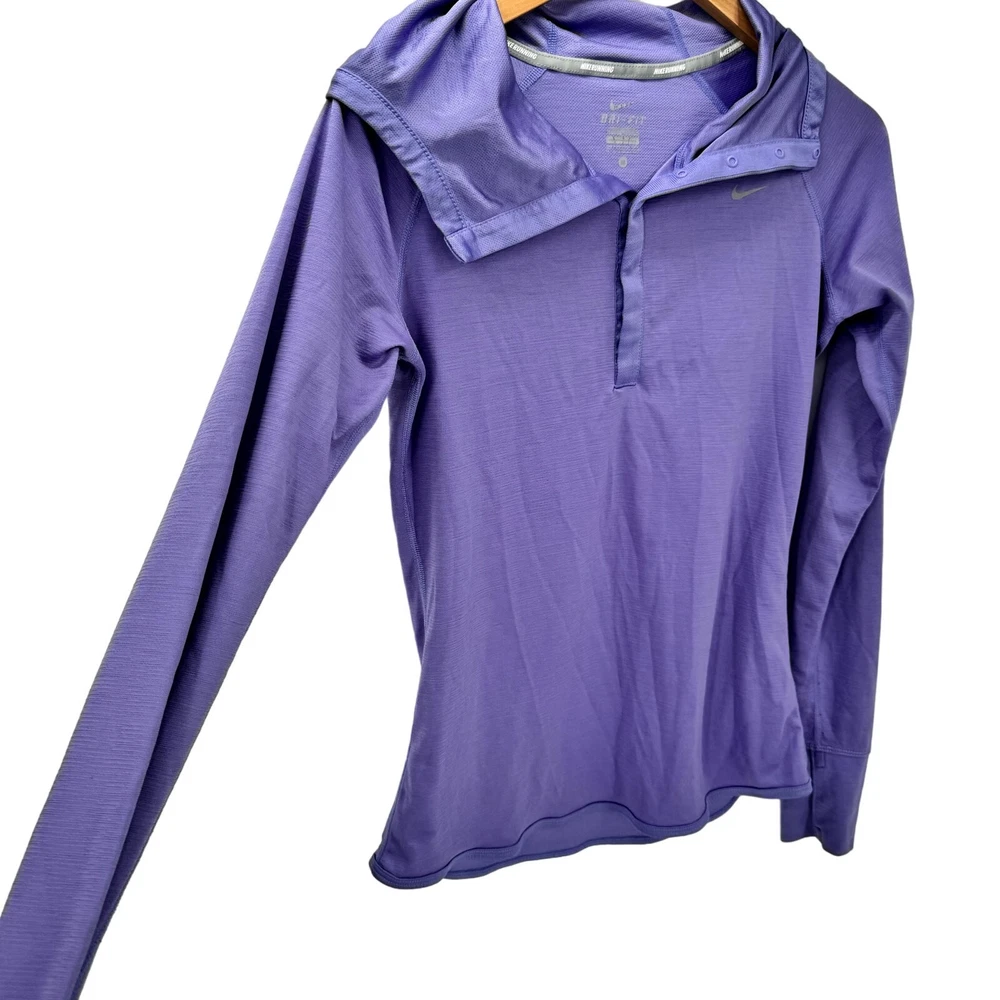 Nike Running Hoodie Womens Medium Purple Pullover Snap Neck Dri Fit + Thumbholes Activewear Long Sleeves Wool Blend Very good condition, see all pictures for views. •Pit to pit: 17" •Shoulder to hem: 26" Ships out same day or next open postal day. Thank you for your purchase, we appreciate you!