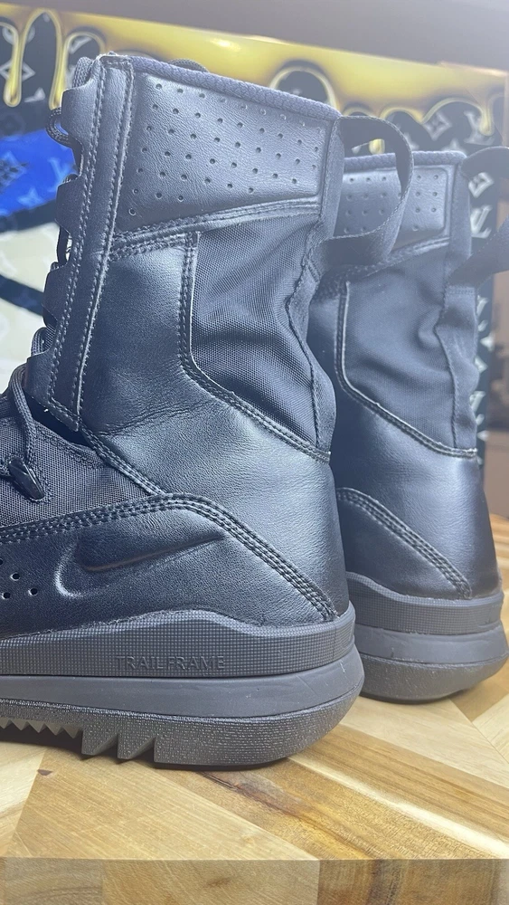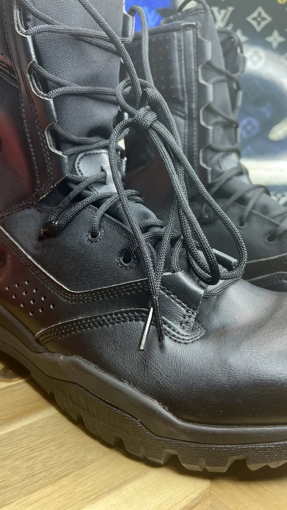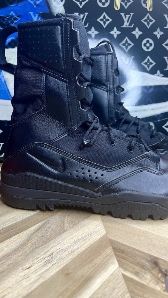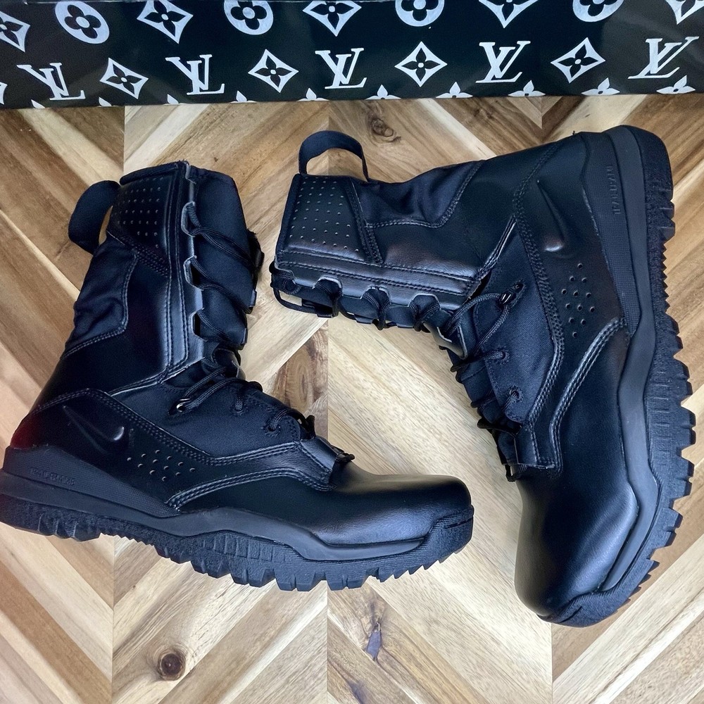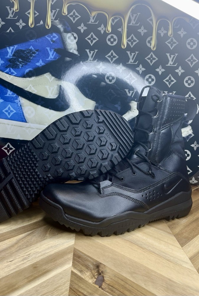 The Nike Special Field Systems SFS Tactical Boots in black are designed for men in size 12.5 (UK size 11.5). Featuring a high top shoe shaft style, these boots have lace-up and pull-on closure options. The boots are lightweight, cushioned, slip-resistant, breathable, and water-resistant, making them suitable for various seasons and activities such as tactical and military use. With a mix of leather and synthetic materials, a Nike SFB product line model is known for its comfort and performance, perfect for army, navy, and other military-inspired themes.