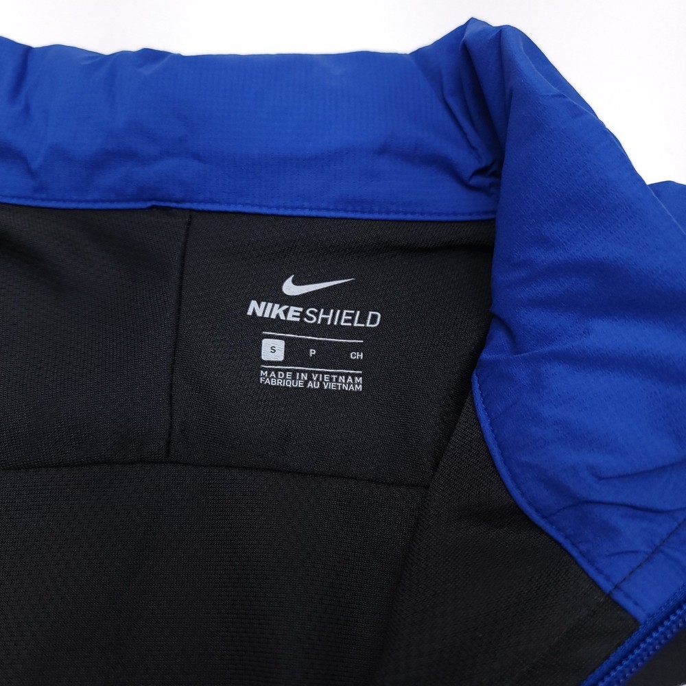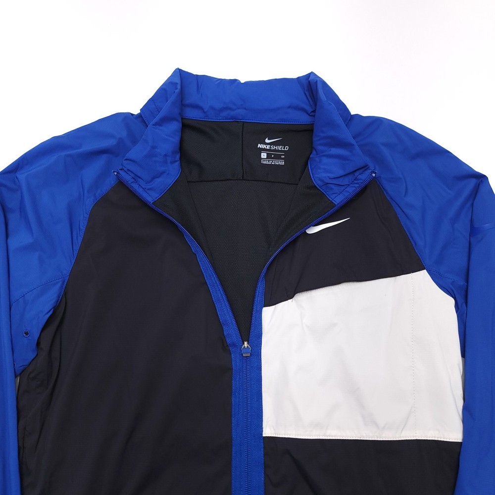 Occasion: Casual, Travel Model: Nike Shield MPN: AJ5444011 Type: Jacket Vintage: No Country of Origin: Vietnam Performance/Activity: Gym & Training, Hiking, Running & Jogging, Walking Pattern: Geometric Product Line: Nike Dri-FIT Style: Windbreaker Features: Full Zip, Hooded, Lightweight, Windproof, Zipped Pockets Fit: Regular Outer Shell Material: Nylon Fabric Type: Softshell Theme: Outdoor, Sports Accents: Logo, Zipper Department: Men Jacket/Coat Length: Short Closure: Zip Brand: Nike Size Type: Regular Collar Style: Stand-Up Size: S Color: Blue Lining Material: Polyester