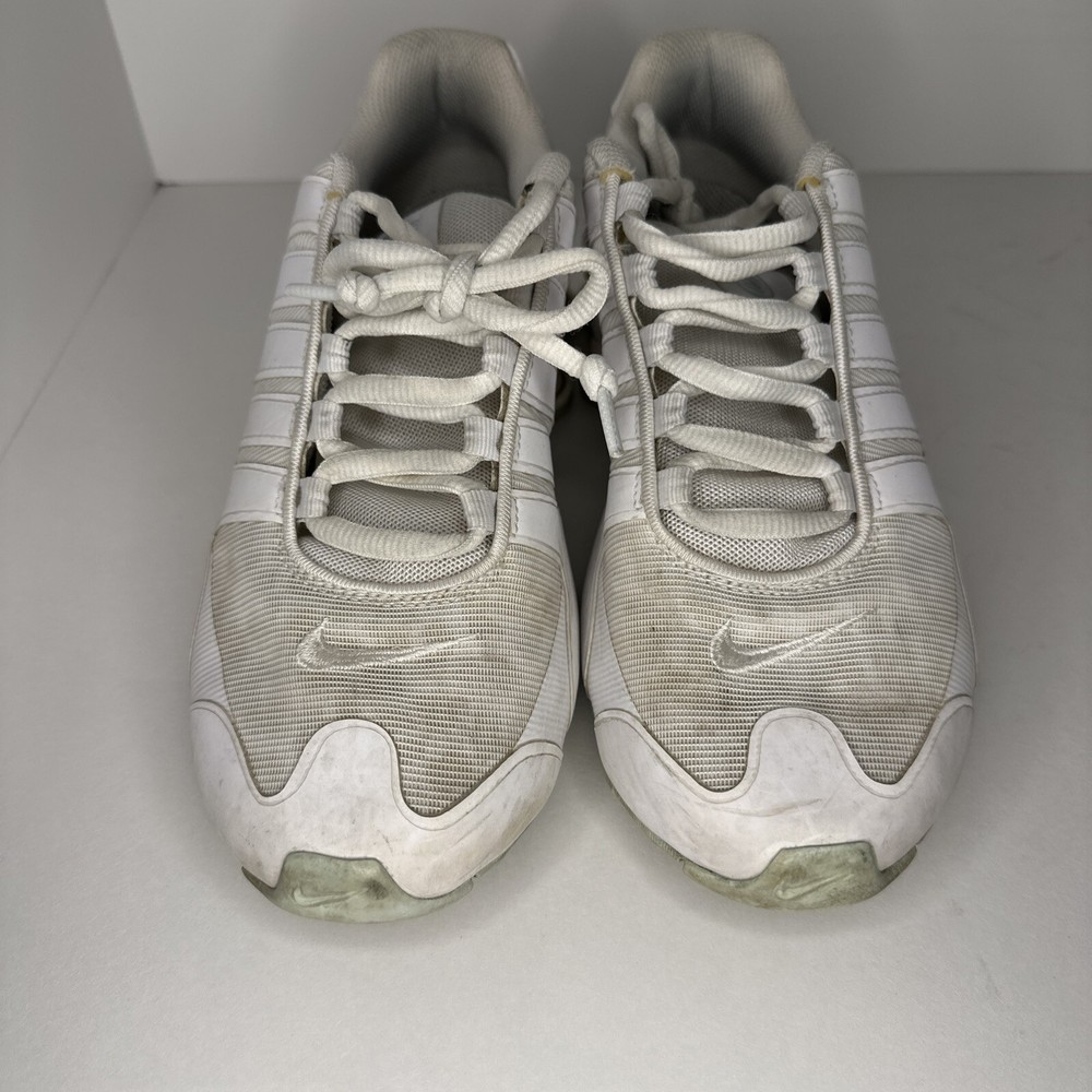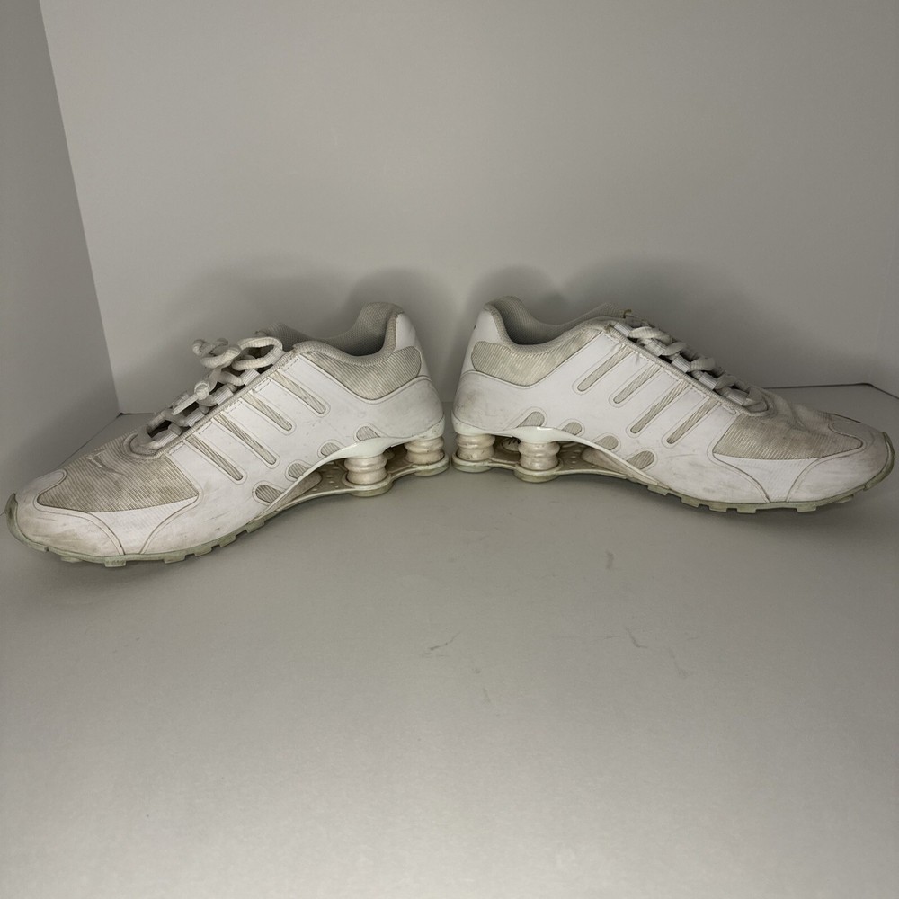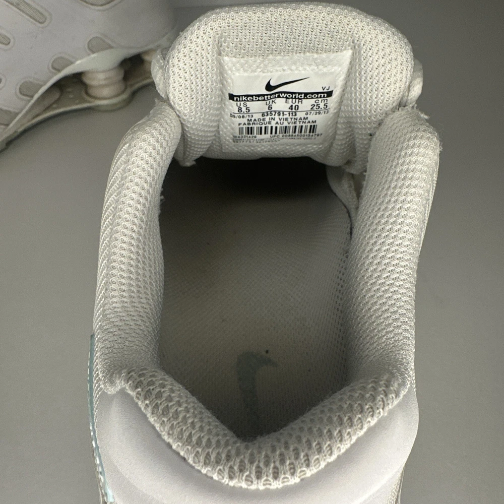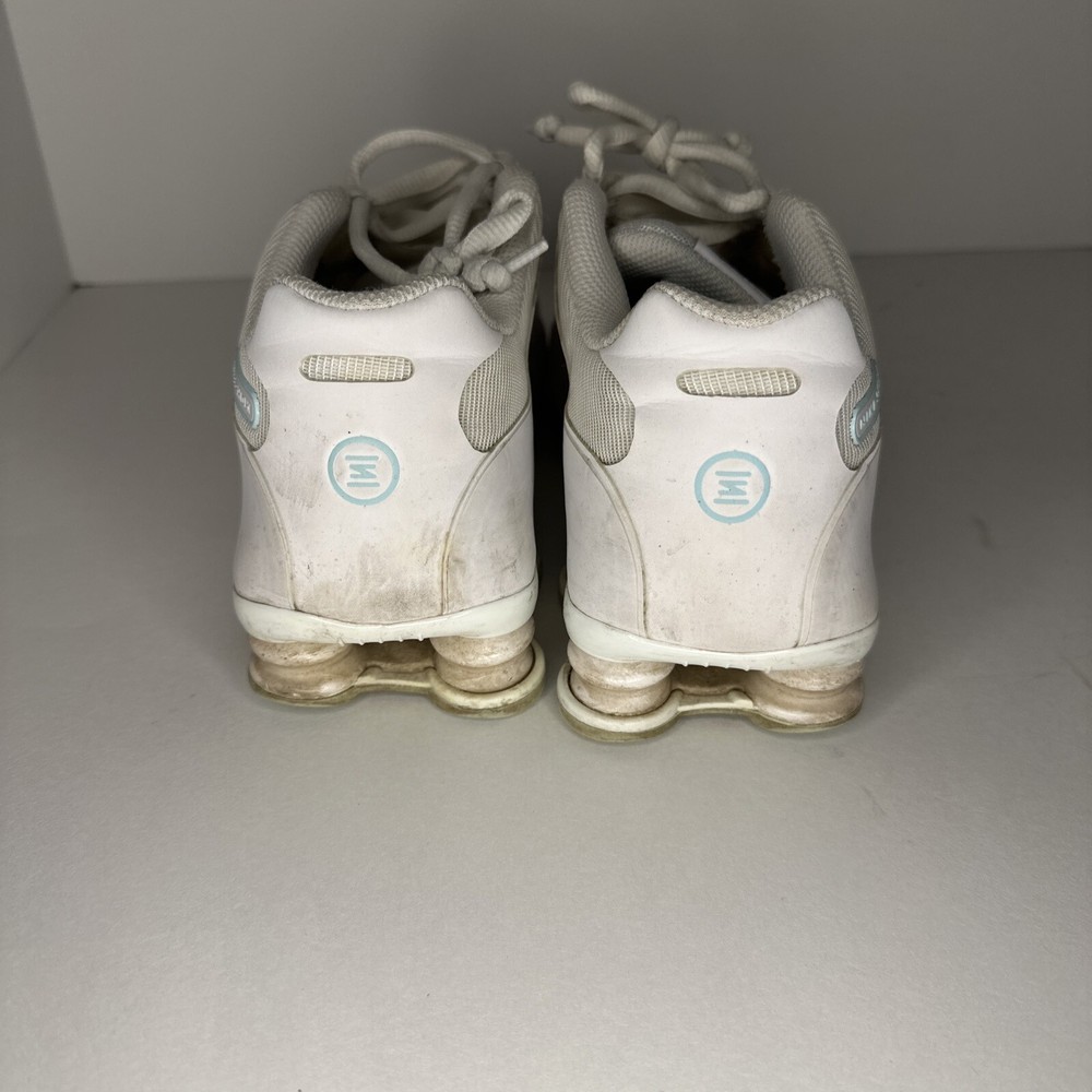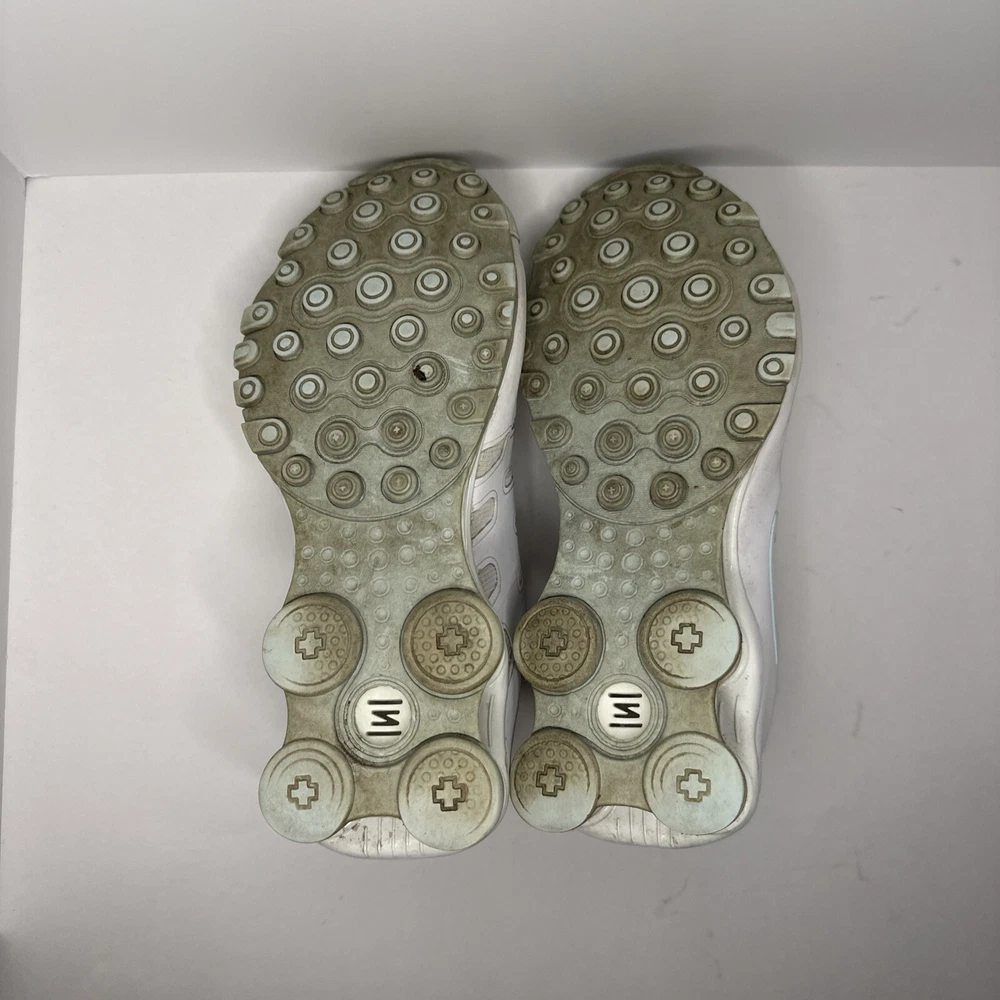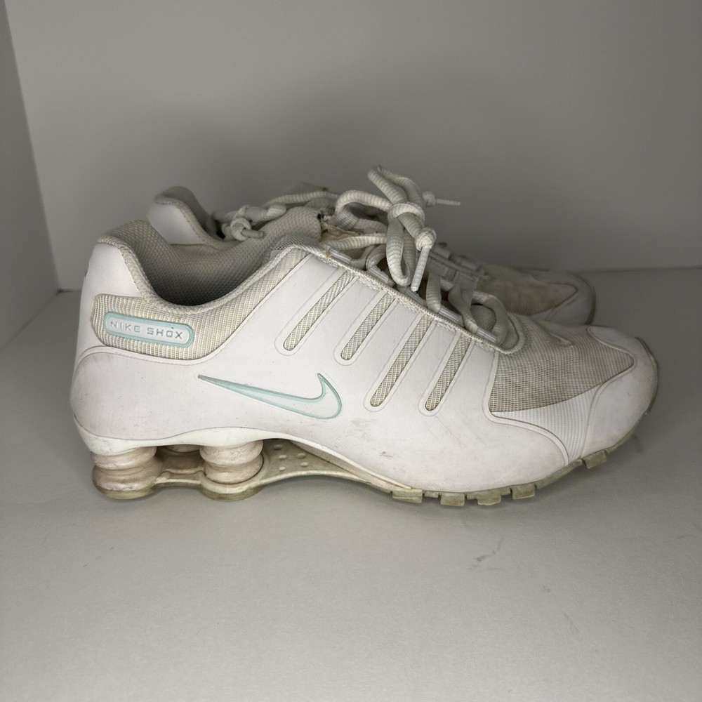 In very good condition! The discoloration in on the toe in the pictures is the glow in the dark leopard print. Not sure if it’s still glows or not. Did not test it. Experience the thrill of the darkness with these Nike Shox NZ NS sneakers. With a solid white pattern and mint accents, these shoes glow in the dark and make a statement wherever you go. They're perfect for any occasion, from activewear to casual wear, and are designed to keep you comfortable during any activity. These women's shoes are lace-up and have a synthetic upper material, making them durable and long-lasting. They are available in US size 8.5, UK size 6, and EU size 40. The Nike Shox NZ model is part of the Nike Shox product line, known for its athletic design and performance-enhancing features. Get ready to conquer the darkness and step into the light with these stylish and functional sneakers.