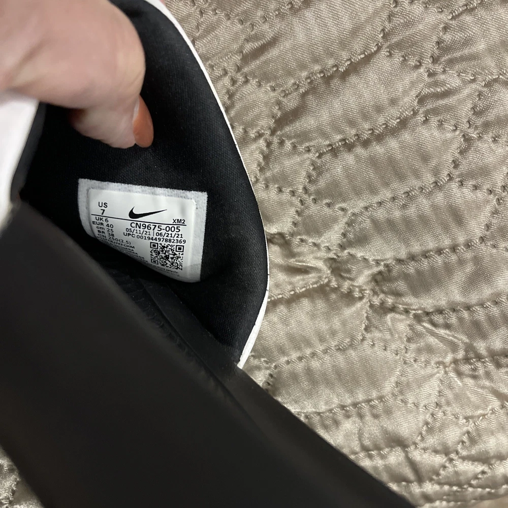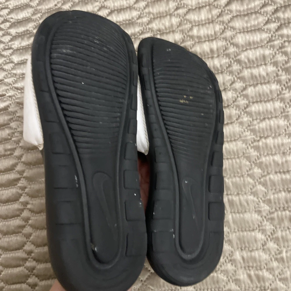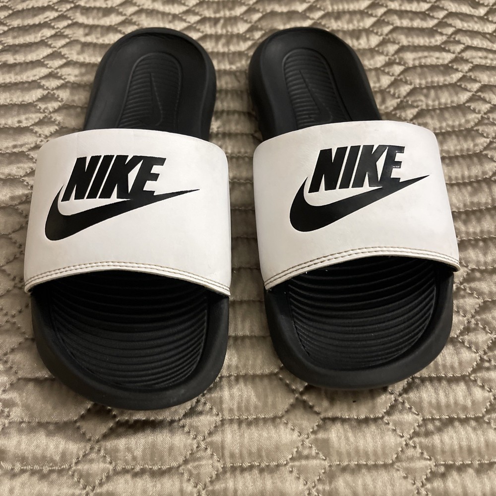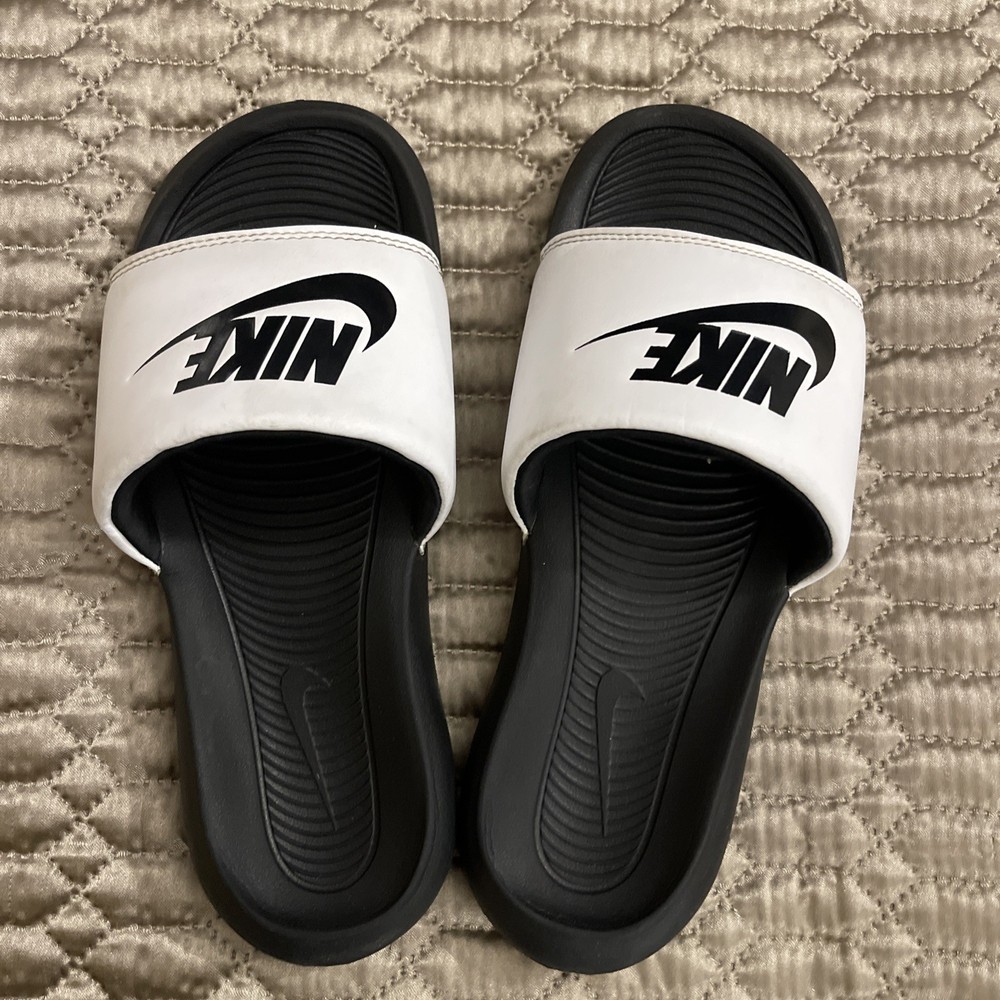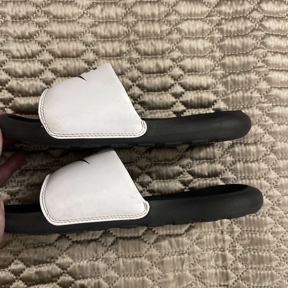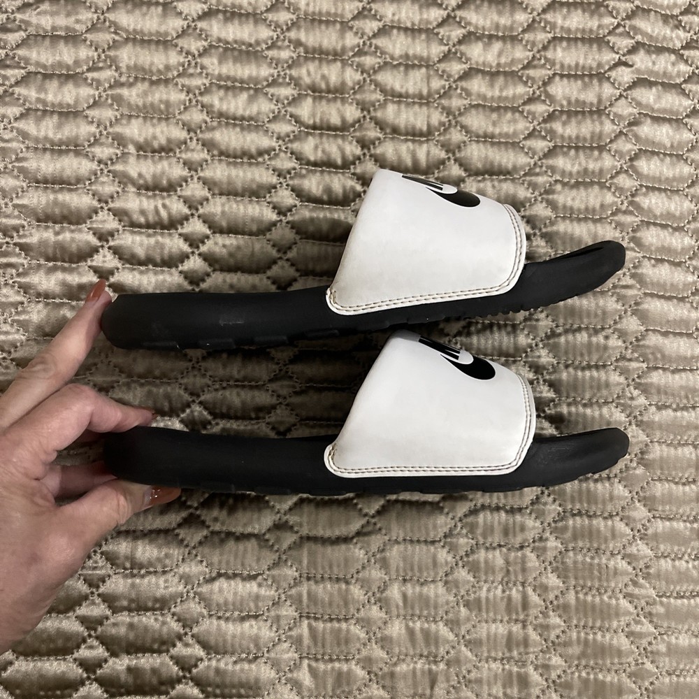 The product is a pair of Nike slides for men in size 7, featuring a white and black color scheme. These sandals are designed in a comfortable slide style with a synthetic upper material. The Nike Benassi Just Do It model offers a sporty and casual look suitable for various occasions. Perfect for those looking for a stylish and comfortable footwear option from a well-known brand like Nike.