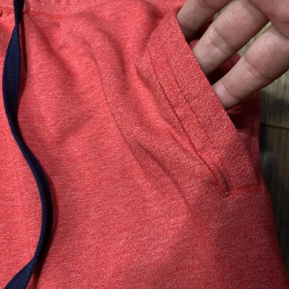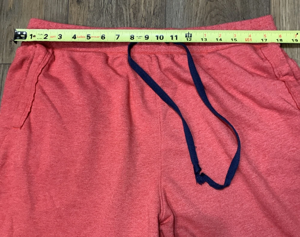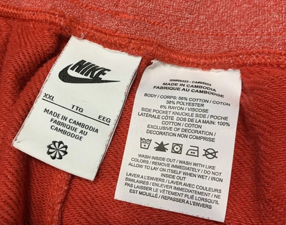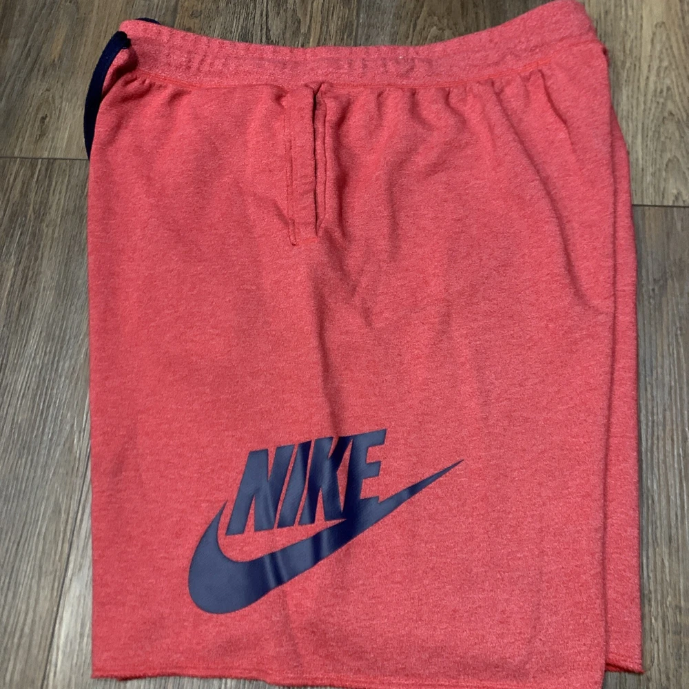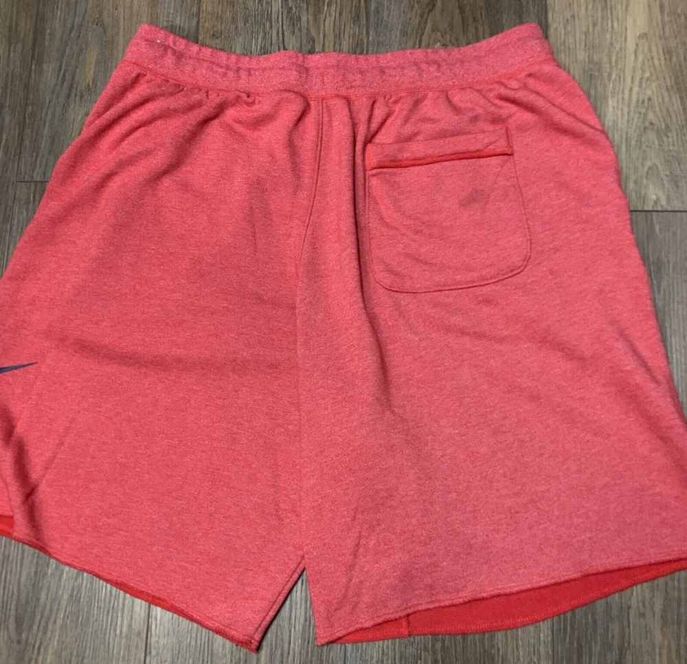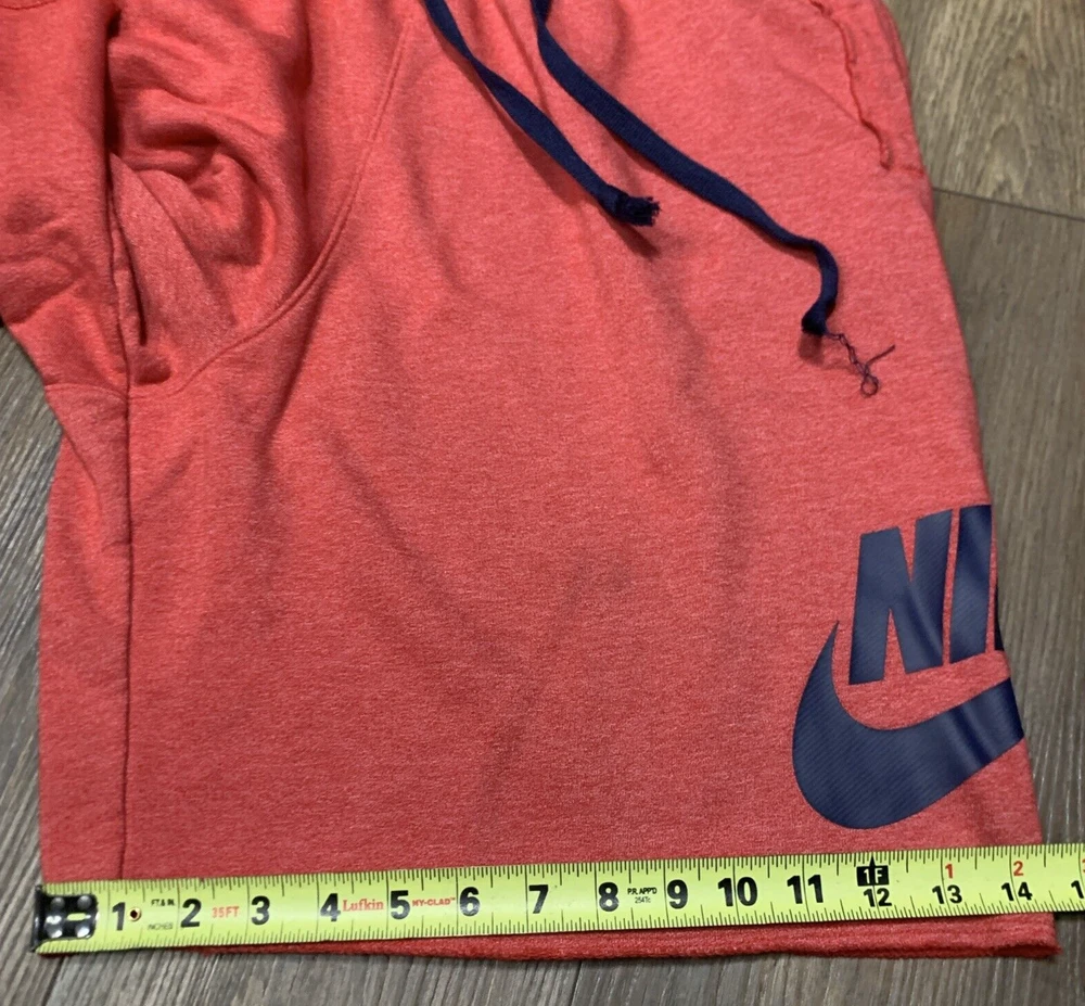 Look stylish and comfortable with these Nike sweat shorts in red. The drawstring closure and elastic waist make them easy to wear and perfect for casual occasions. These shorts have a solid pattern and a flat front with a high rise of greater than 12 inches. Made from a cotton blend fleece fabric, these shorts are machine washable with a medium fabric wash. They feature a Nike logo accent, slash pockets, and are athletic fit. The inseam measures 14 1/2 inches and the waist size is 36 inches. These shorts are perfect for sports and can be worn in any season - winter, summer, fall, and spring.