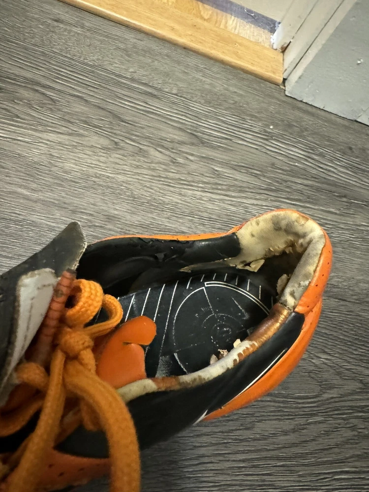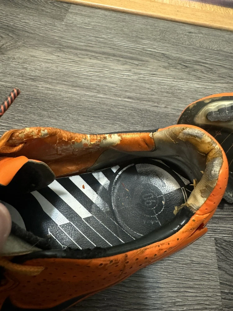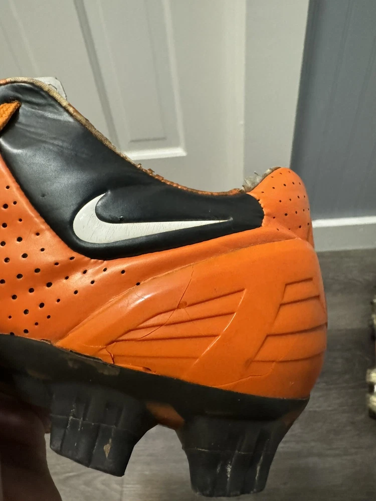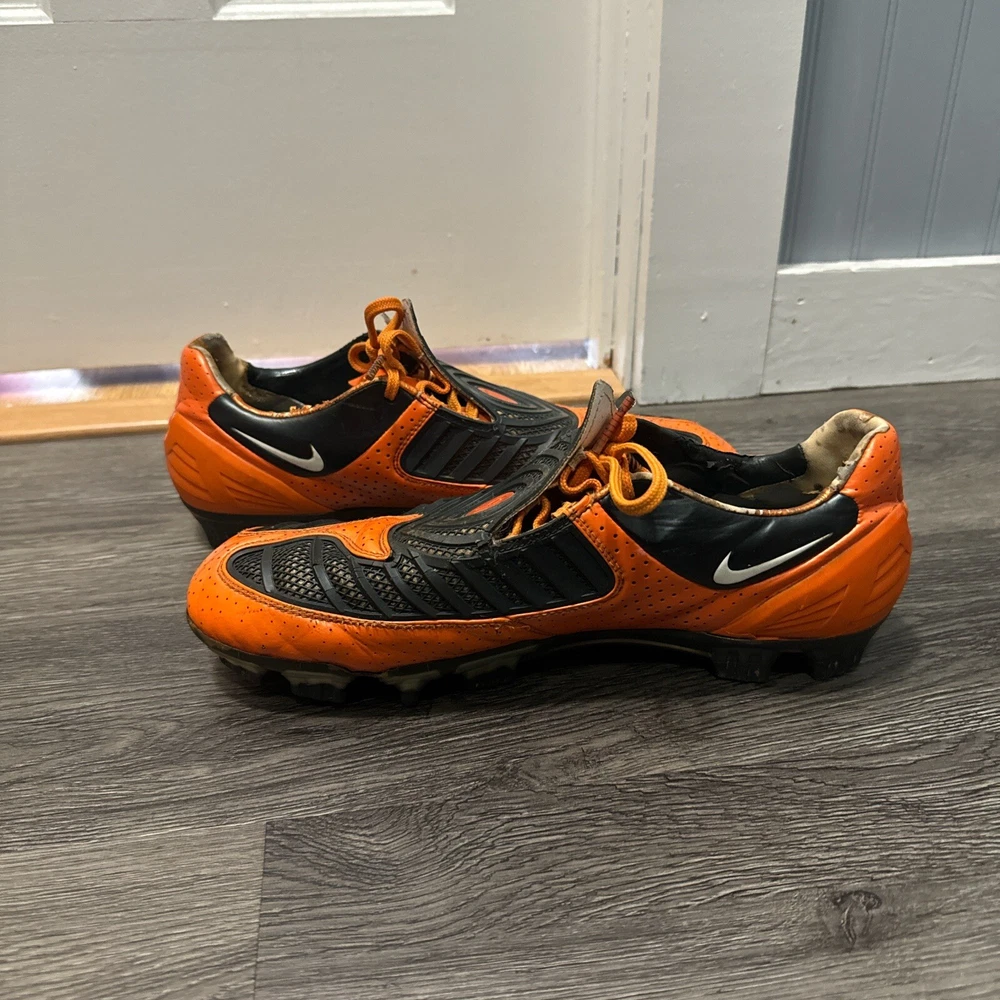 Nike T90 Laser Football Soccer Boots Cleats Orange Blaze US Size 11 2009 Rare Extremely Rare 2009 Nike T90 Laser Orange Blaze Soccer Cleats Boots Used Condition, exterior soft and in good used shape, some cracking on outside plastic part. Interior by heel has peeling and wear like most used T90 laser Cleats. Bottoms are in great shape Priced Cheap for Quick Sale #nike #cleats