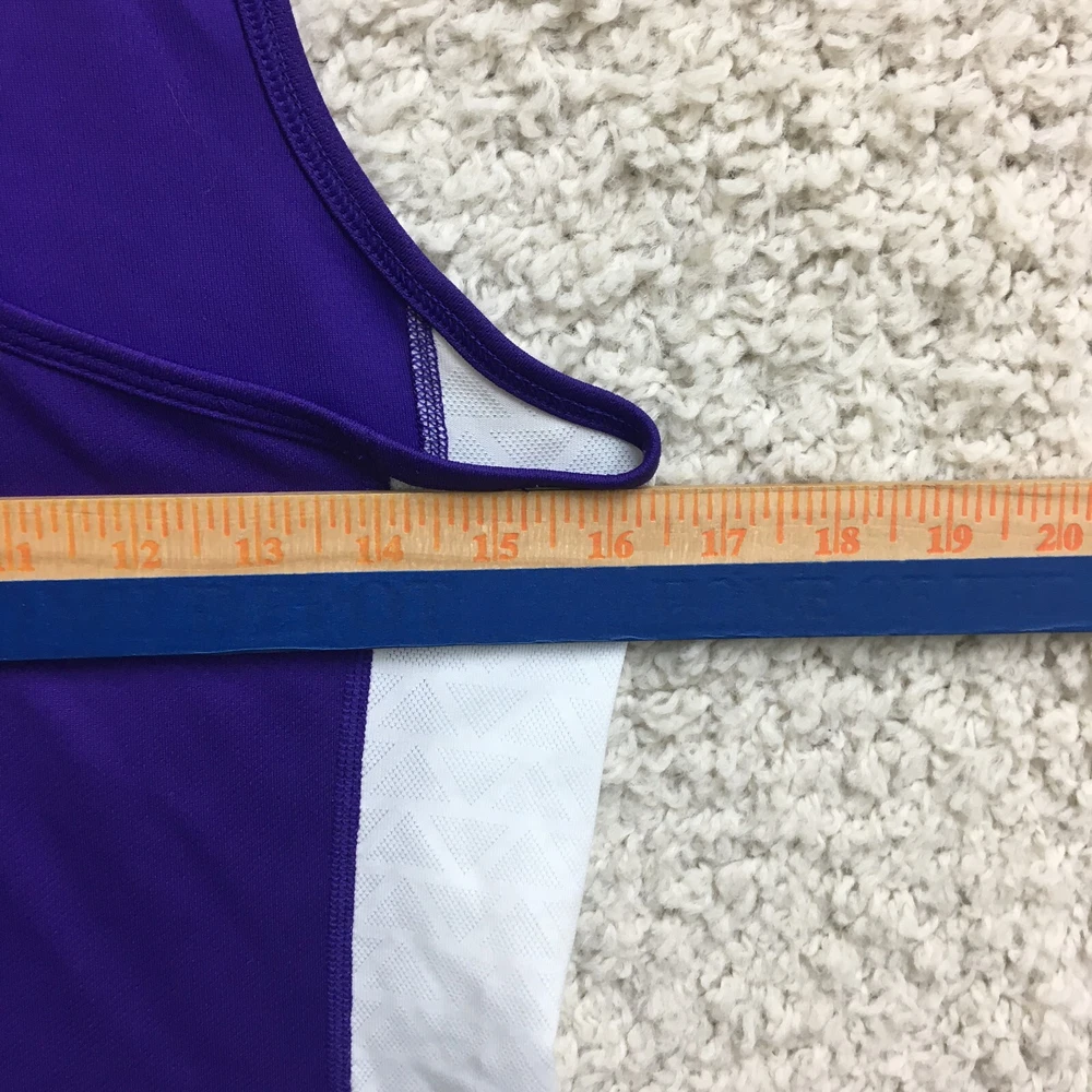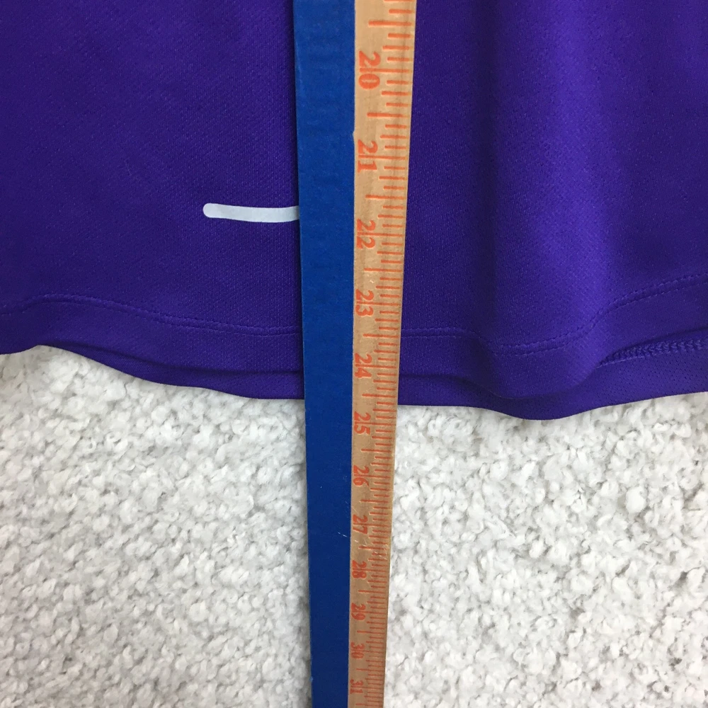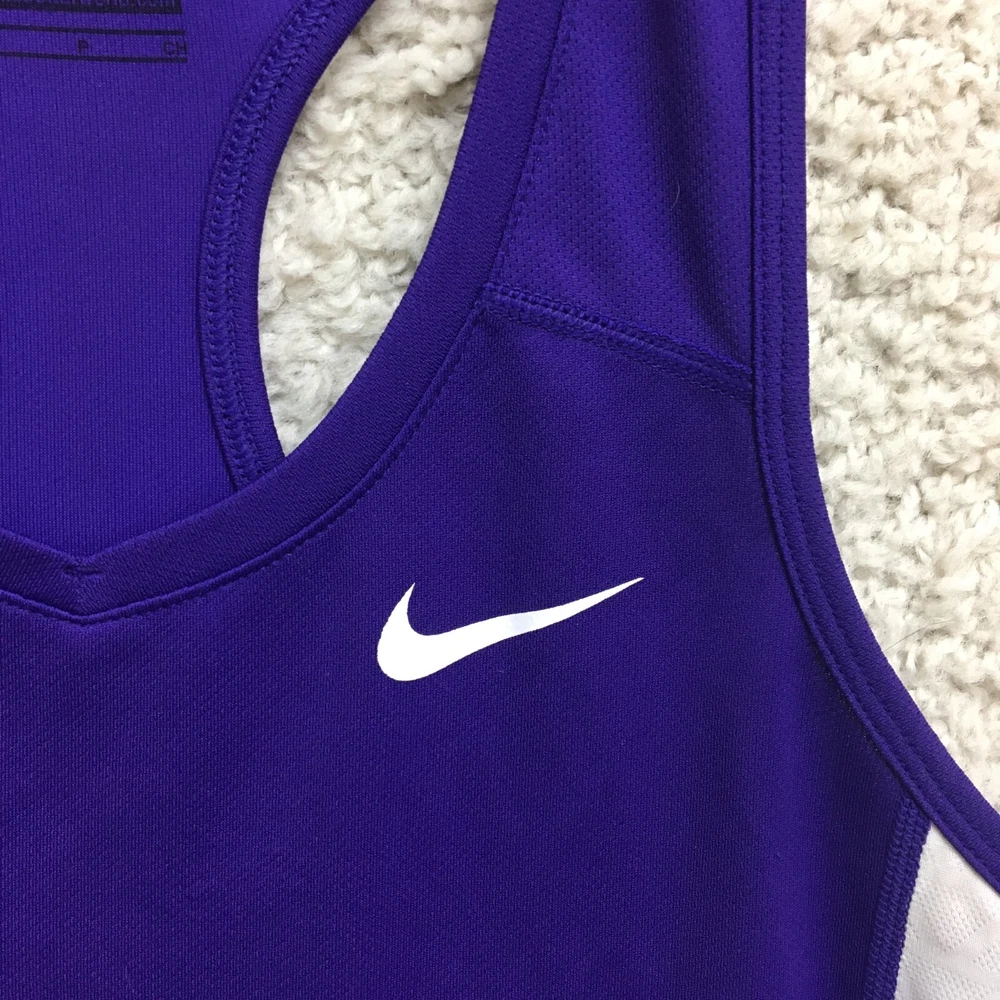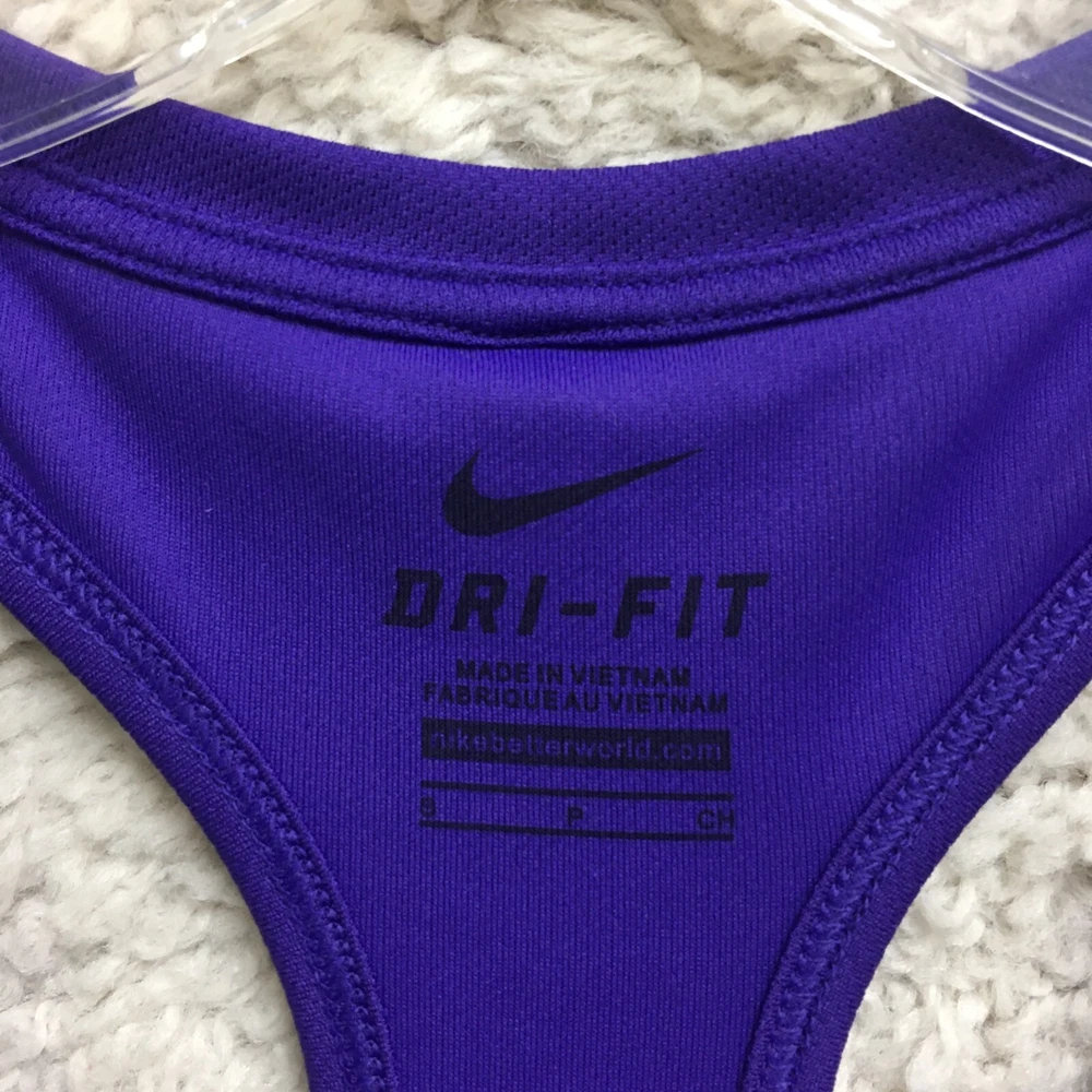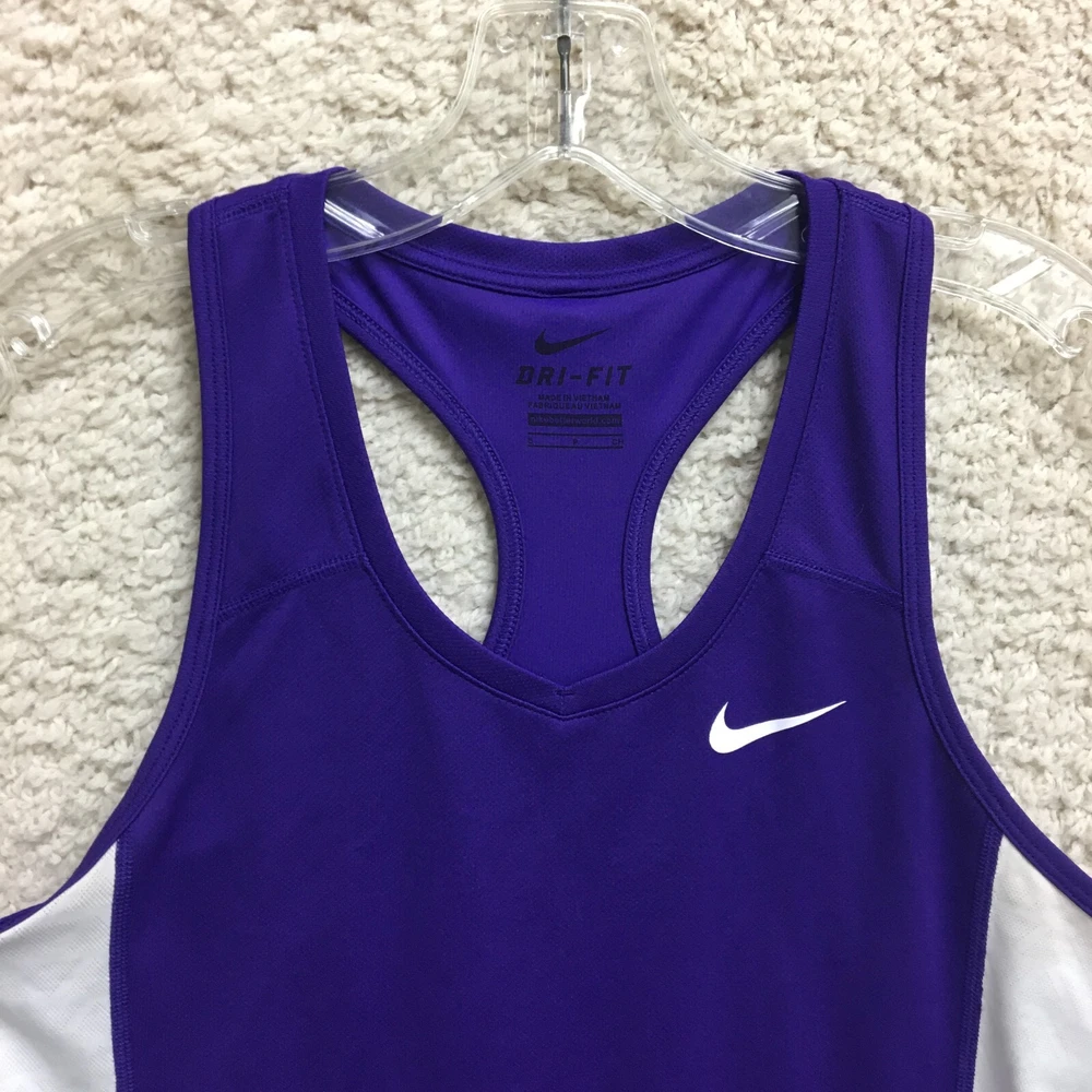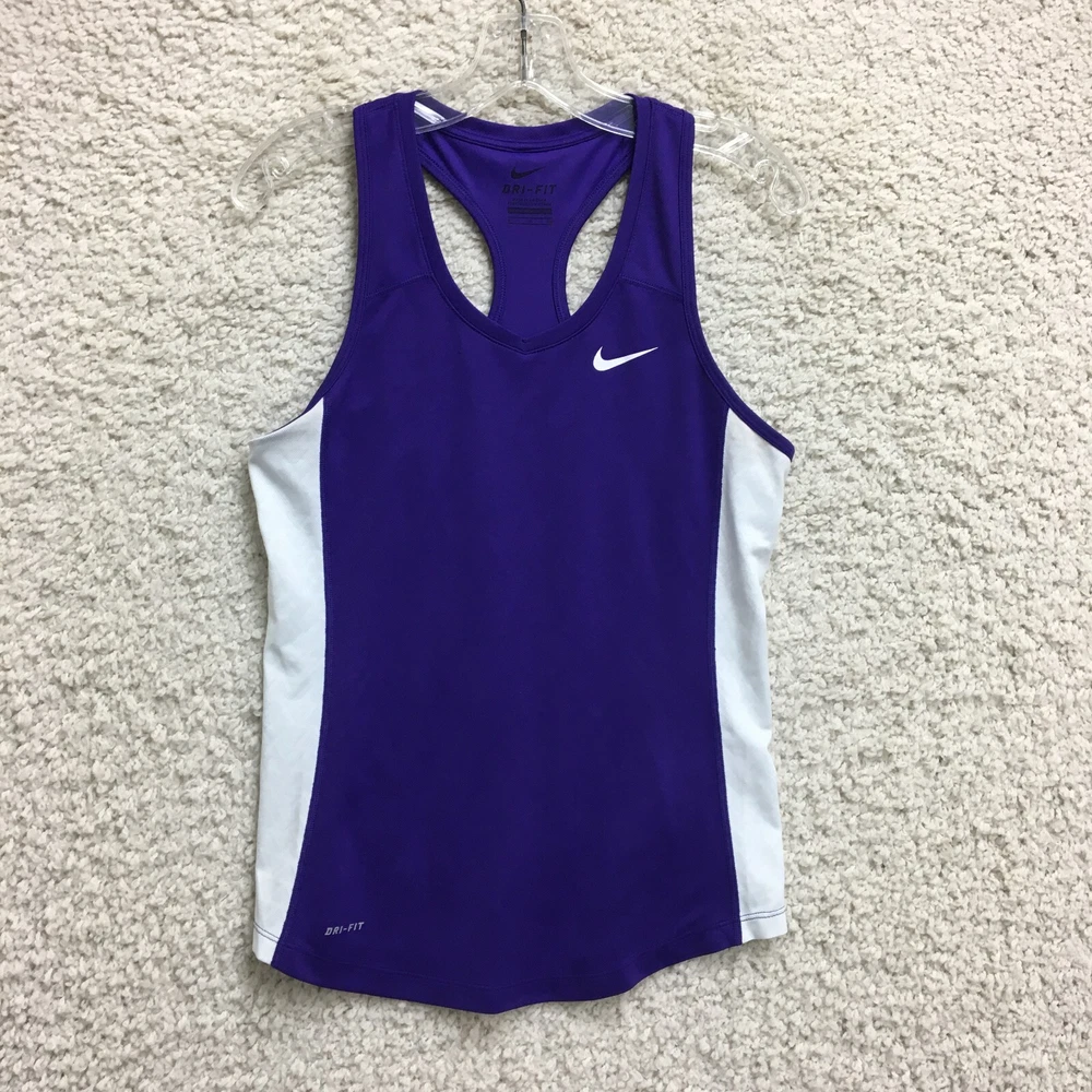Features: All Seasons, Easy Care, Stretch Garment Care: Machine Washable Occasion: Activewear, Casual Model: Nike Dri-Fit Seller Notes: “Good Used Condition. Please, See Pictures for Full Condition and Measurements.” Color: Purple Department: Women Material: Polyester Fabric Type: Blended Fabric Neckline: Round Neck Type: Tank Strap Type: Racerback Theme: Logo Pattern: Solid Season: Fall, Spring, Summer, Winter Fit: Athletic Product Line: Nike Dri-FIT Size Type: Regular Country/Region of Manufacture: Vietnam Sleeve Length: Sleeveless Style: Basic Fabric Wash: Medium Performance/Activity: Gym & Training, Running & Jogging, Walking Size: S Brand: Nike Closure: Pullover