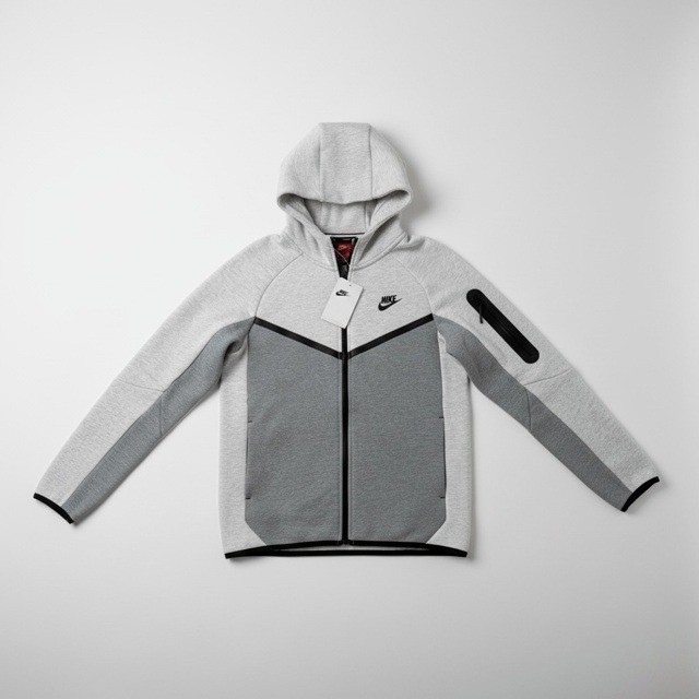 Nike Tech Fleece Full-Zip Hoodie and Joggers Tracksuit Full Set offers the ultimate blend of sport-inspired style and lightweight warmth. This two-piece set features a color-blocked gray design with the iconic chevron chest line, a zippered sleeve pocket, and a multi-panel hood for extra coverage. The matching joggers provide a tapered fit with ribbed cuffs and the signature vertical zippered pocket, ensuring a modern silhouette for athletic performance or casual streetwear. Crafted from smooth, breathable Tech Fleece fabric, this set provides premium comfort without the bulk.