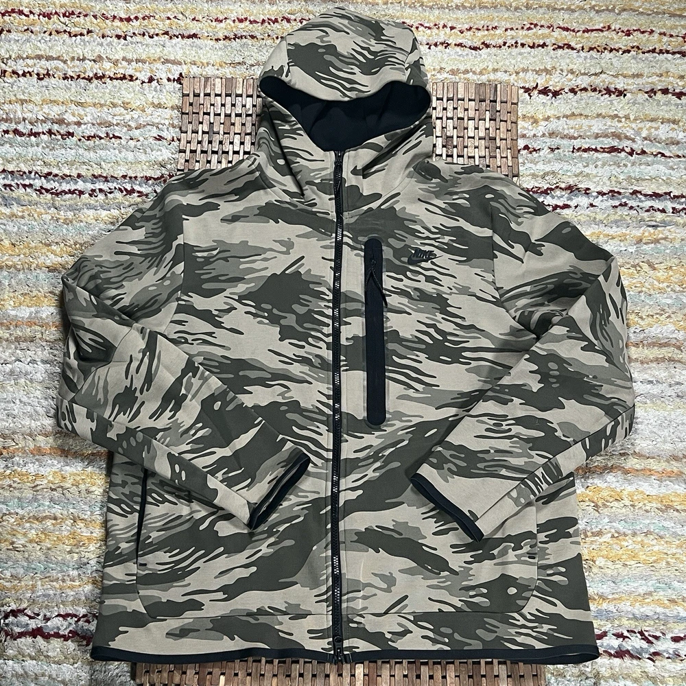 Stay comfortable and stylish during your workouts with this Nike Tech Fleece Hoodie. Featuring a green camouflage pattern, long sleeves, and a full zip closure, this hoody is perfect for gym & training, cross training, CrossFit, skateboarding, basketball, hiking, and running & jogging. The hoodie is made from a soft and durable 66% cotton and 34% polyester blend, and it comes in a regular fit and size XL. The Nike Tech Fleece Hoodie also features a hood, pockets, and the Nike Sportswear product line, making it a great addition to your activewear collection. It's machine washable and easy to care for, so you can focus on your workouts instead of worrying about laundry. Get ready to elevate your athletic style with this comfortable and fashionable hoody.