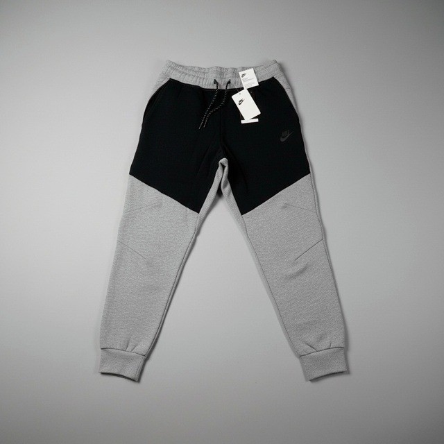 Nike Sportswear Tech Fleece full-zip hoodie and matching jogger sweatpants full set in a sleek grey and black colorblock design. This modern tracksuit features the signature chevron chest panel, bonded zippered pockets on the sleeve and leg, and a high-neck scuba hood for maximum coverage. Crafted from lightweight yet insulating Tech Fleece fabric, the set offers a slim, tapered fit with ribbed cuffs and an adjustable drawstring waistband for a clean, athletic silhouette. Perfect for streetwear styling or active recovery.