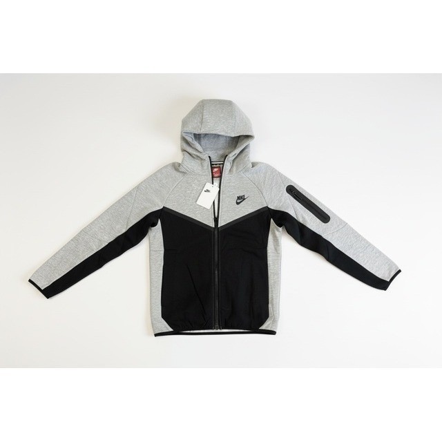 Nike Sportswear Tech Fleece full-zip hoodie and matching jogger sweatpants full set in a sleek grey and black colorblock design. This modern tracksuit features the signature chevron chest panel, bonded zippered pockets on the sleeve and leg, and a high-neck scuba hood for maximum coverage. Crafted from lightweight yet insulating Tech Fleece fabric, the set offers a slim, tapered fit with ribbed cuffs and an adjustable drawstring waistband for a clean, athletic silhouette. Perfect for streetwear styling or active recovery.