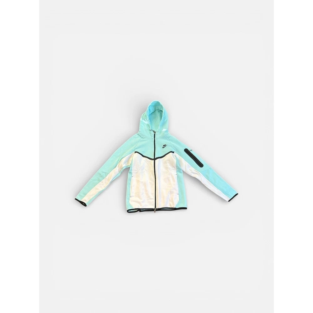 Nike Tech Fleece tracksuit set in a striking Baltic Blue and White colorway. This two-piece set includes a full-zip hoodie and matching jogger pants, both constructed from lightweight yet warm Tech Fleece fabric. The hoodie features the signature chevron design on the chest, a bonded zip pocket on the sleeve, and a scuba hood for extra coverage. The joggers offer a slim fit with an elastic waistband, internal drawstring, and the iconic vertical zippered pocket on the right hip. Both pieces are finished with black trim accents and the classic Futura logo.