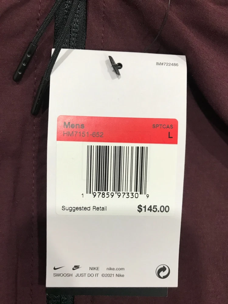 Description: Nike Tech Sportswear Men's (Size L) Burgundy Crush Long Sleeve Full-Zip Windrunner Woven Jacket. (See pictures) Brand: Nike Gender: Men's Size: L Color: Burgundy Crush Pattern: Solid Material: 92% polyester/8% spandex MSRP: $145 Buy It Now Price: $74.99 Shipping: Plus $8.50 for padded flat rate envelope shipping Note: Picture Accuracy is about 90%. Slight variance in color may result, due to lighting and camera default settings.