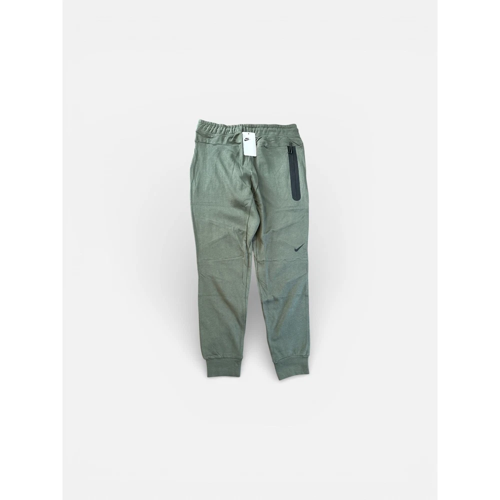 Nike Tech Fleece tracksuit full set in a two-tone olive green and cream colorway offers a modern athletic aesthetic with premium lightweight warmth. The full-zip hoodie features a high neck, chevron chest design, and a zippered sleeve pocket, while the matching joggers include an elastic waistband with drawstrings and tapered cuffs for a streamlined fit. Signature Nike Futura logos appear on both pieces, making this a versatile choice for streetwear or active recovery.