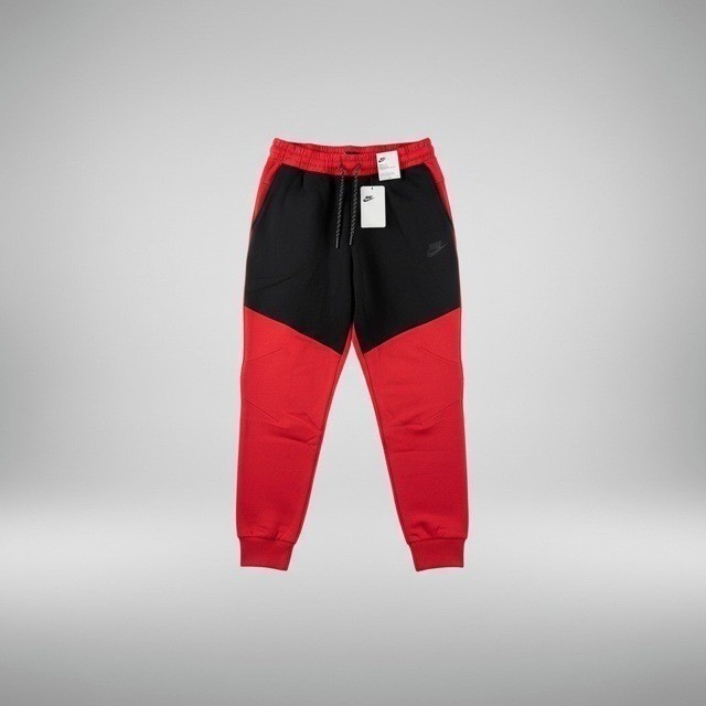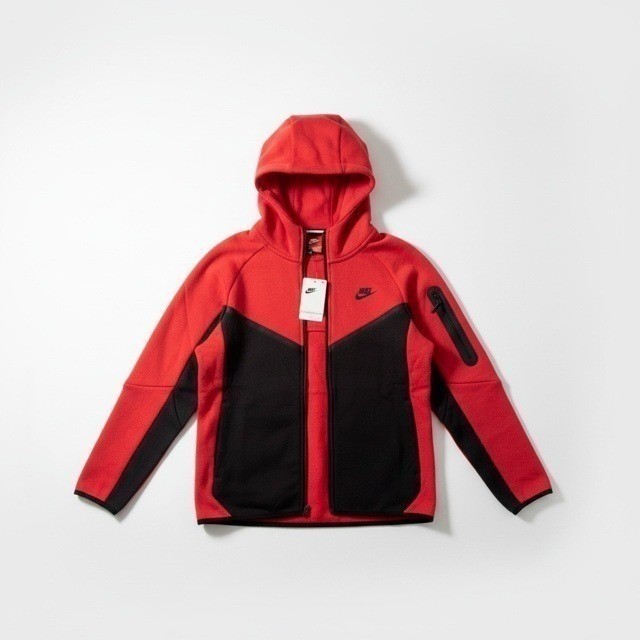 Nike Tech Fleece Full Zip Hoodie and Jogger Pants Tracksuit Full Set in a bold red and black colorblock design. Crafted from lightweight yet warm Tech Fleece fabric, this set includes a hooded jacket with a vertical zippered chest pocket and matching tapered joggers with ribbed cuffs. The iconic chevron design on the chest and sleek athletic fit make it a standout choice for both performance and casual streetwear. Perfect for layering or wearing as a coordinated set, this tracksuit offers a modern silhouette with functional storage and premium comfort.