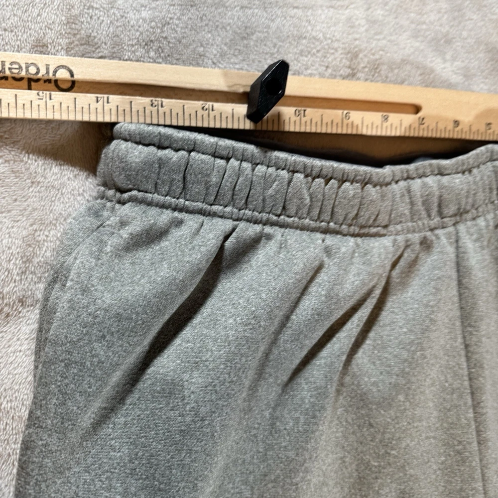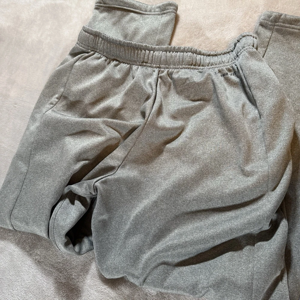 Elevate your activewear game with these Nike Therma-Fit sweatpants. Designed with a drawstring closure and adjustable waist, these pants ensure a comfortable fit for any occasion, whether it's a casual day out or a gym session. The gray fleece fabric with Nike logo accents and solid pattern make these pants a versatile addition to your wardrobe. Featuring pockets and a straight leg style, these pants are perfect for outdoor, athleisure, and sports activities like running, walking, basketball, and school. The Nike Activewear character family and Nike Therma product line add to the brand's reputation for quality and style. Get your hands on these athletic fit pants in size medium today.