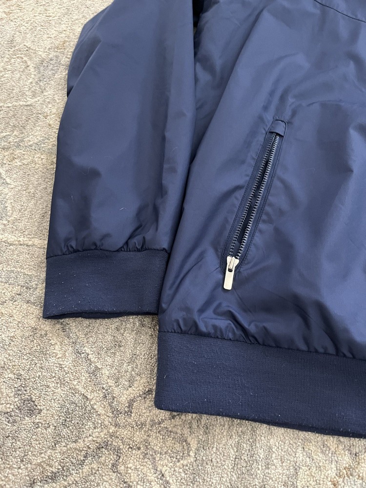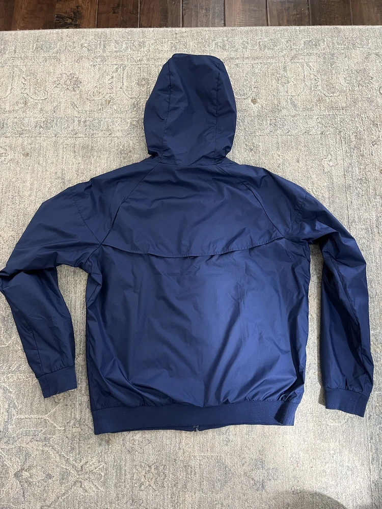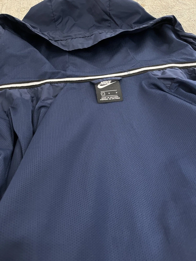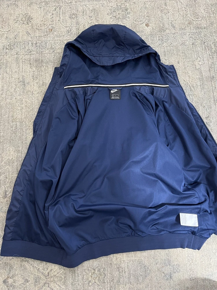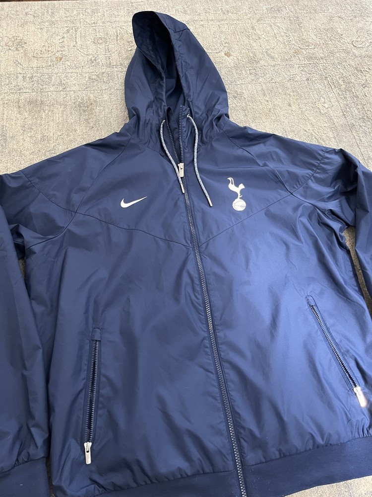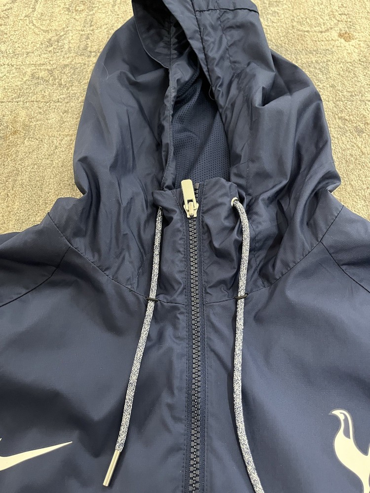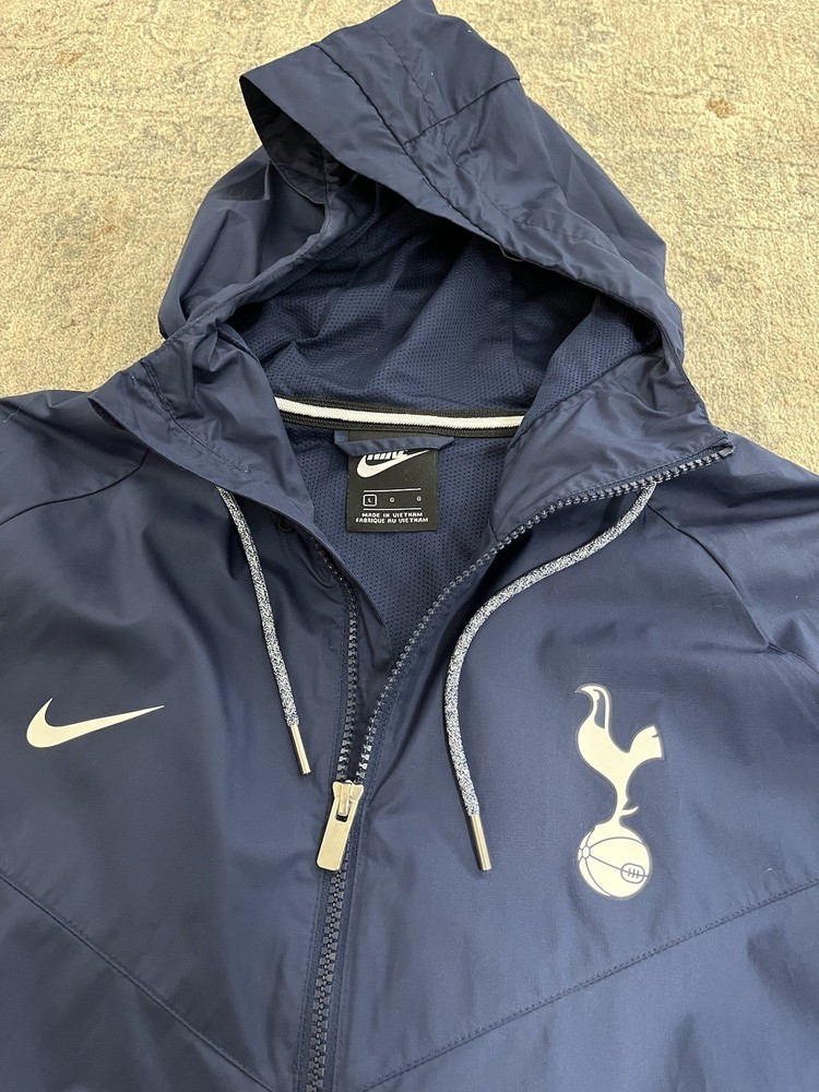 size large, officially licensed apparel Navy Blue Nike Hooded full-zip jacket w/ zipper close front pockets Tottenham club crest on chest Weather resistant outer material Only worn twice Original Retail price: $150