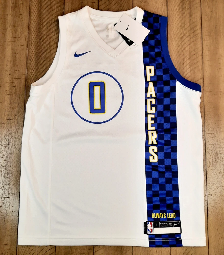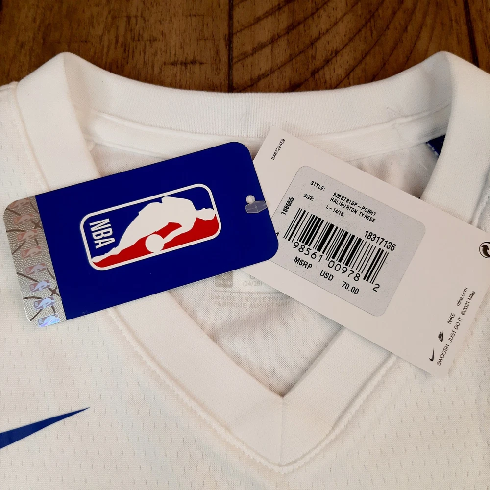 The product is a Nike youth City Edition jersey of Tyrese Haliburton from the Indiana Pacers, featuring the number 0. Officially licensed by the National Basketball Association (NBA), this white jersey is designed for unisex children in size L (14/16). It is made in Vietnam and is suitable for basketball fans looking to support the player and team during the regular season.