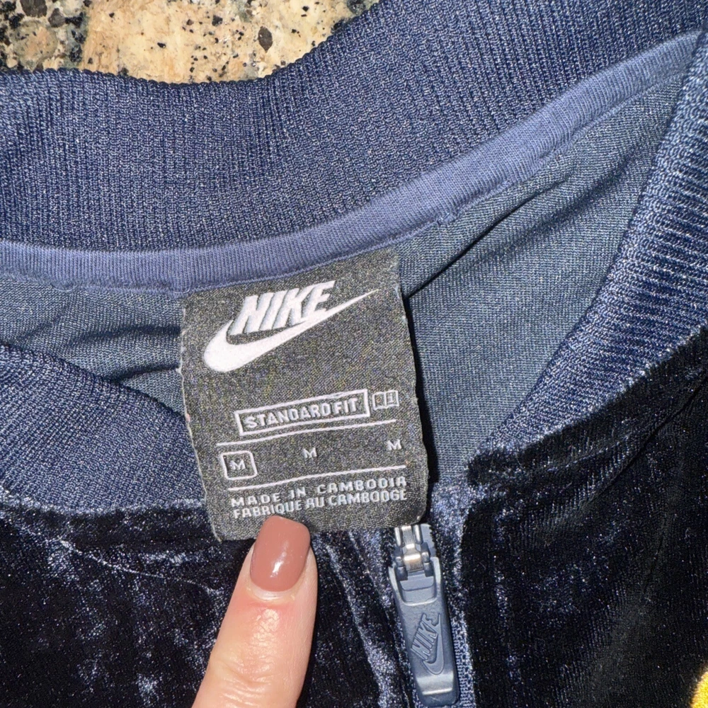 Nike Velour VTG Y2K 80s Style Velour Women’s Medium (fitted, Small) Tracksuit Navy blue (not black!) This is a fitted women’s/juniors size. Sized Medium (will fit an XS or S sized women depending on style wanted) Stretch, soft velour Striped sleeve with sewn ribbon and gold accent Elastic waist can allow for a short look if wanted