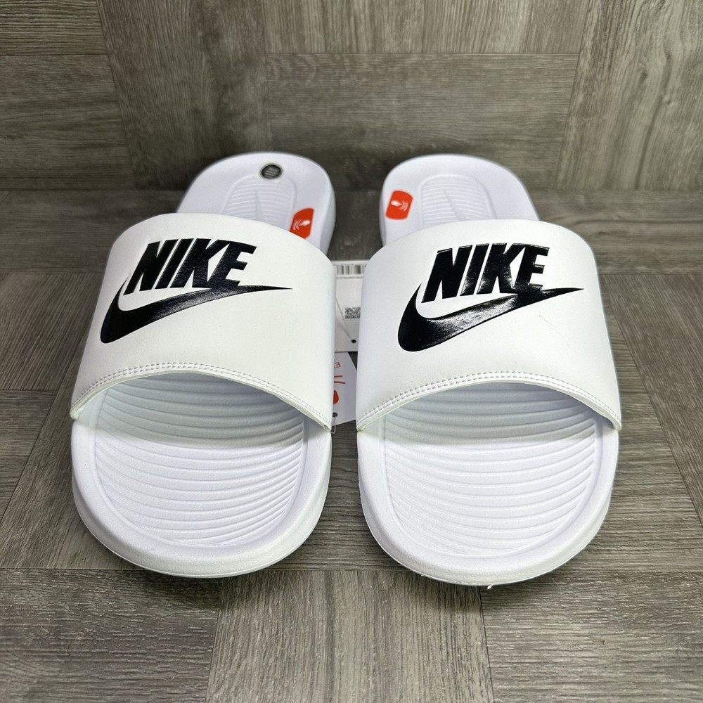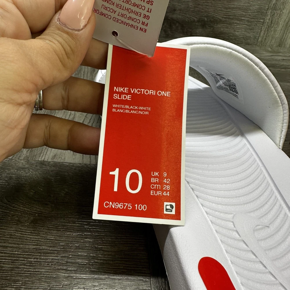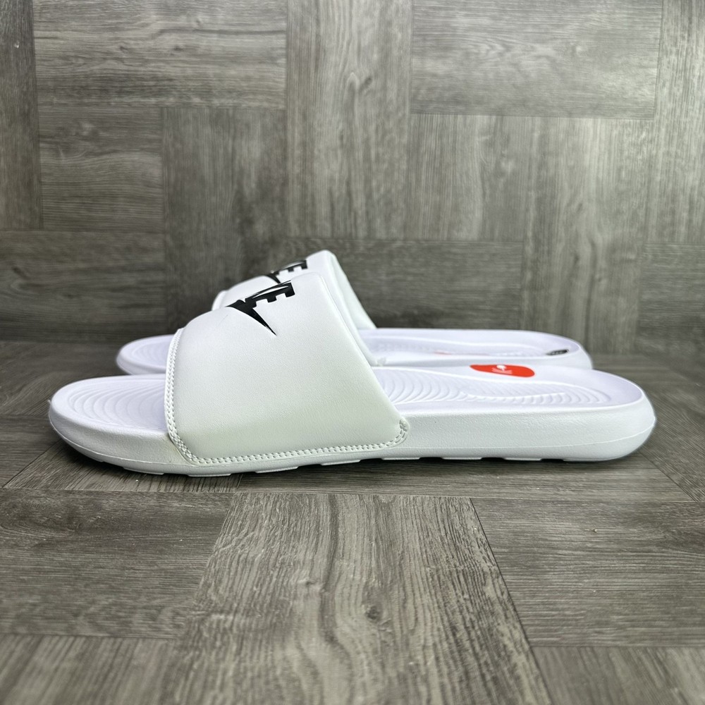 The Nike Victori One Men's size 10 White Black Comfort Slide is a stylish and comfortable slip-on sandal perfect for casual occasions. The black synthetic upper material with a solid pattern and logo accents is ideal for men who appreciate a sporty look. Featuring a rubber outsole for durability, this Nike slide is designed for all-day wear during the summer and spring seasons. The synthetic lining and comfortable design make it a great choice for everyday use. Made in Indonesia, this Nike Victori One model is a must-have for any man looking for both style and comfort in their footwear.