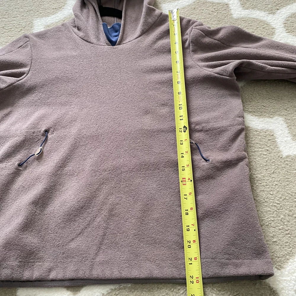 Nike Woman’s Brown French Terry Cloth Navy Accent Active Hoodie Sweatshirt Small Pullover style Drawstring cord waist Navy blue sleeve collar and hood accents Brim on hoodie Zip pockets No stains Small pull on collar Small rip on wrist logo Comes from a smoke free pet free house Size small measures 19.5” pit to pit and 22” in length laying flat