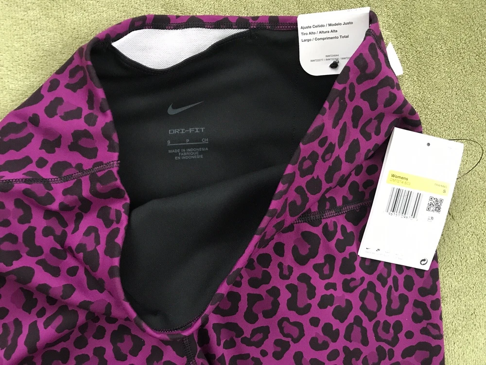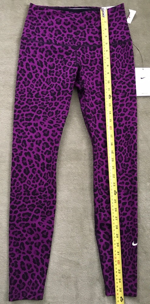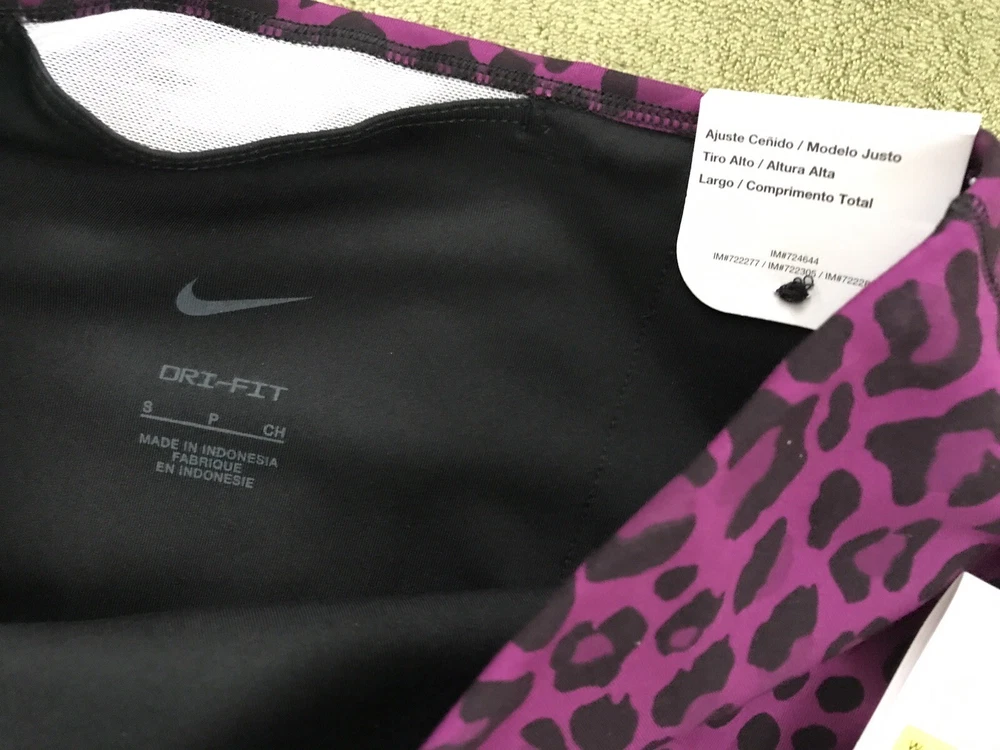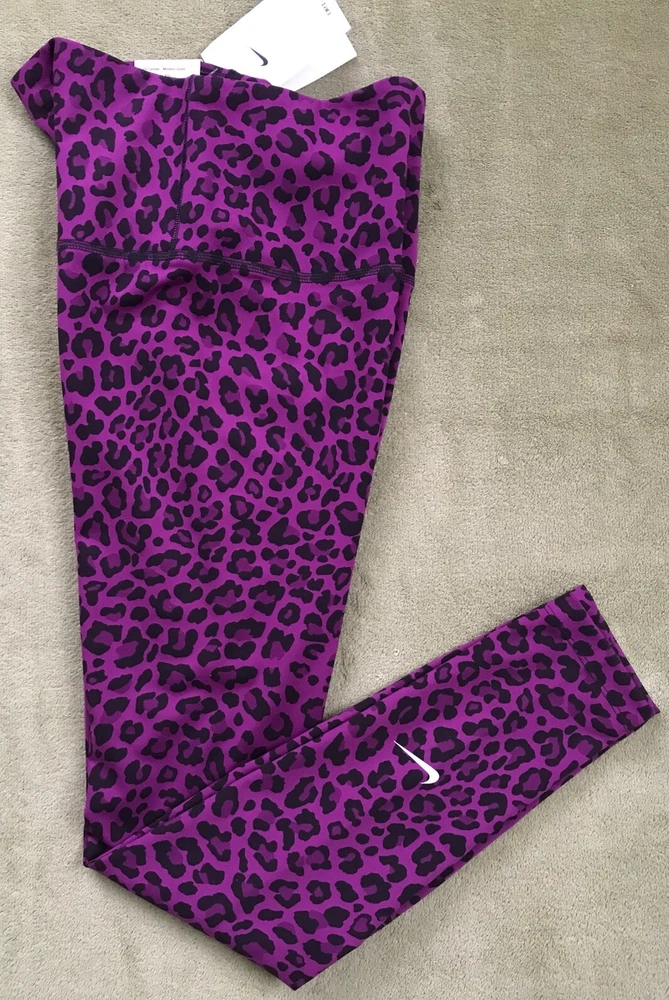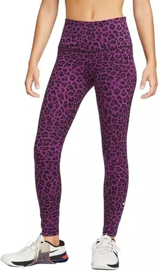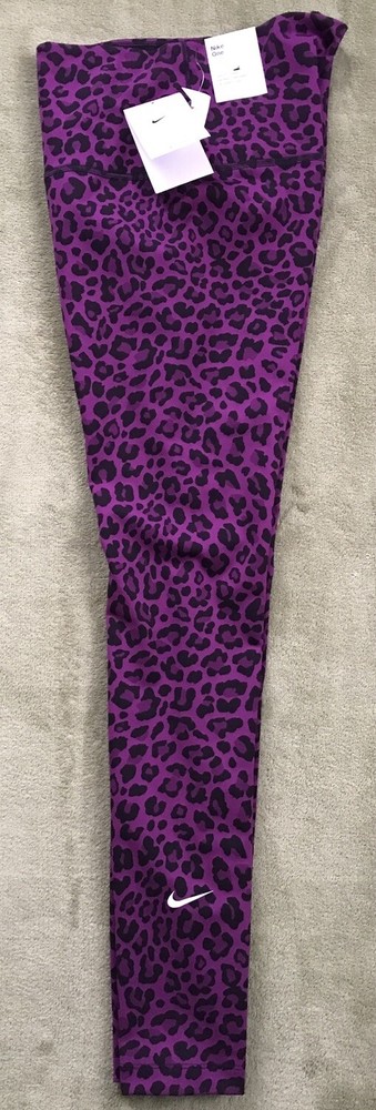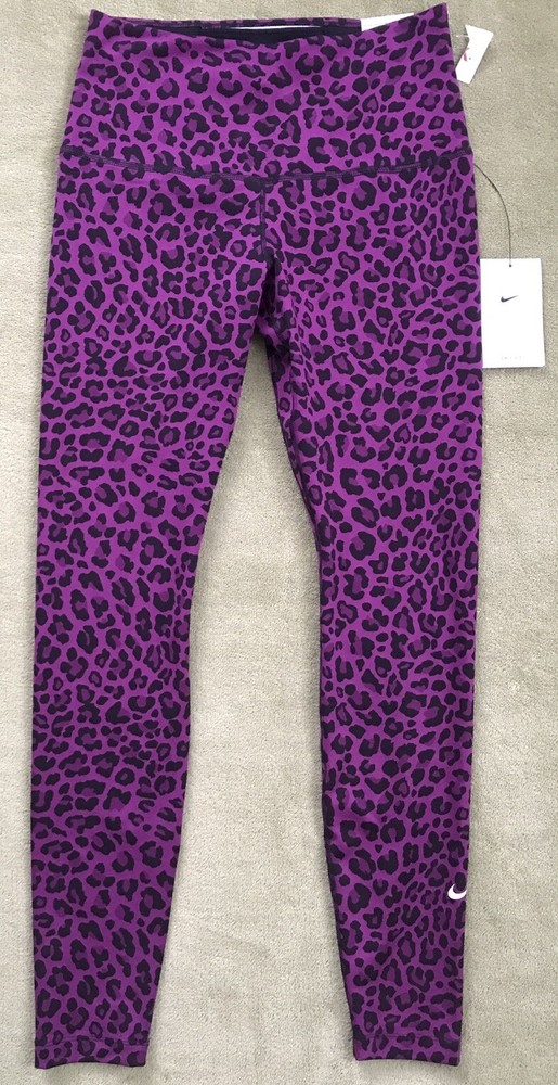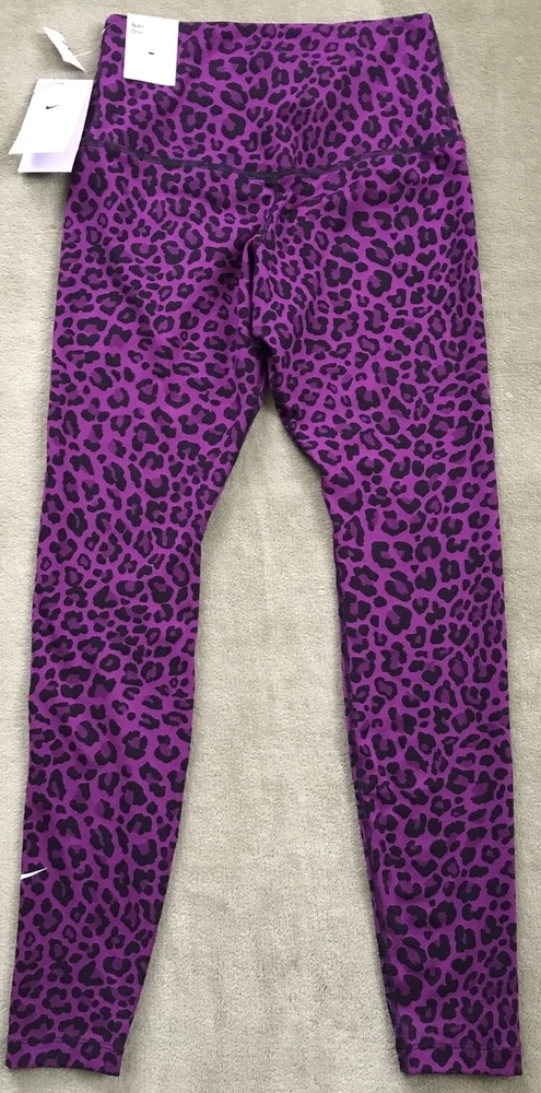 Nike Women's Dri-FIT One High-Waisted Printed Leggings New with tags. Store display. The tags may show sticker residue, scratches, folding marks. Style#DM7274-503 Purple/Black Women’s S Animal print pattern Mid-rise: ~9.5” ~27.5” inseam Stretchy fabric with Dri-FIT technology moves sweat from your skin for quicker evaporation to help you stay dry and comfortable Non-sheer fabric passes the squat test to keep you covered The sides are seamless and the waistband is contoured with a V shape on the back to give you a smooth silhouette The design includes 2 hidden pockets in the mid-rise waistband to keep you ready for whatever you tackle in a day 79% Polyester, 21% Spandex