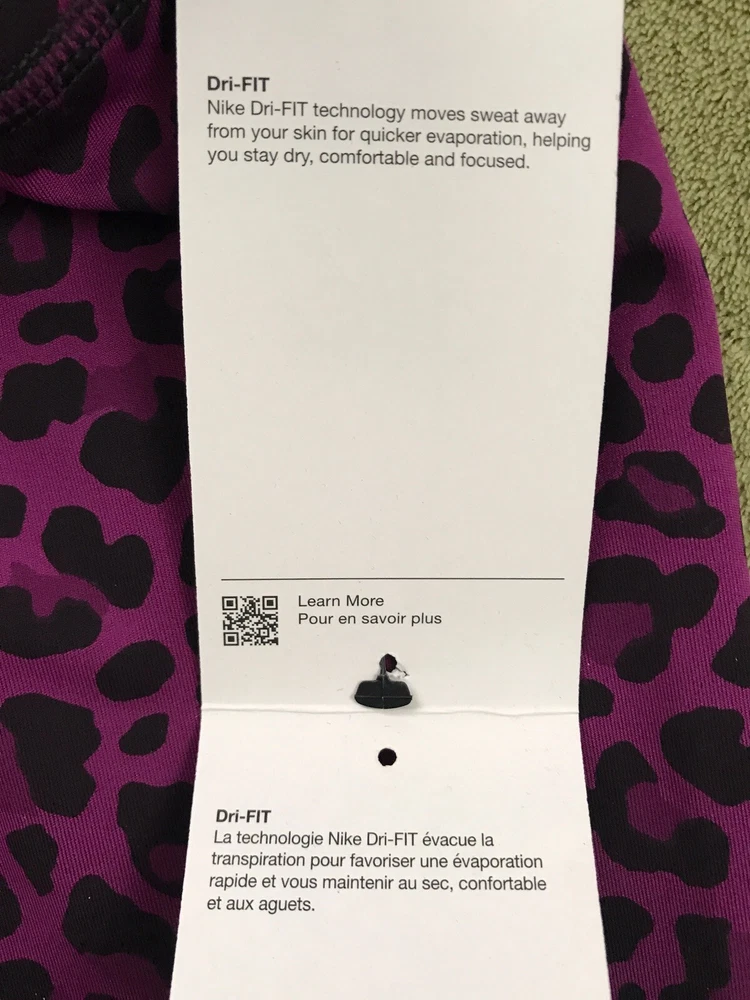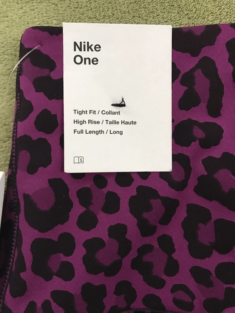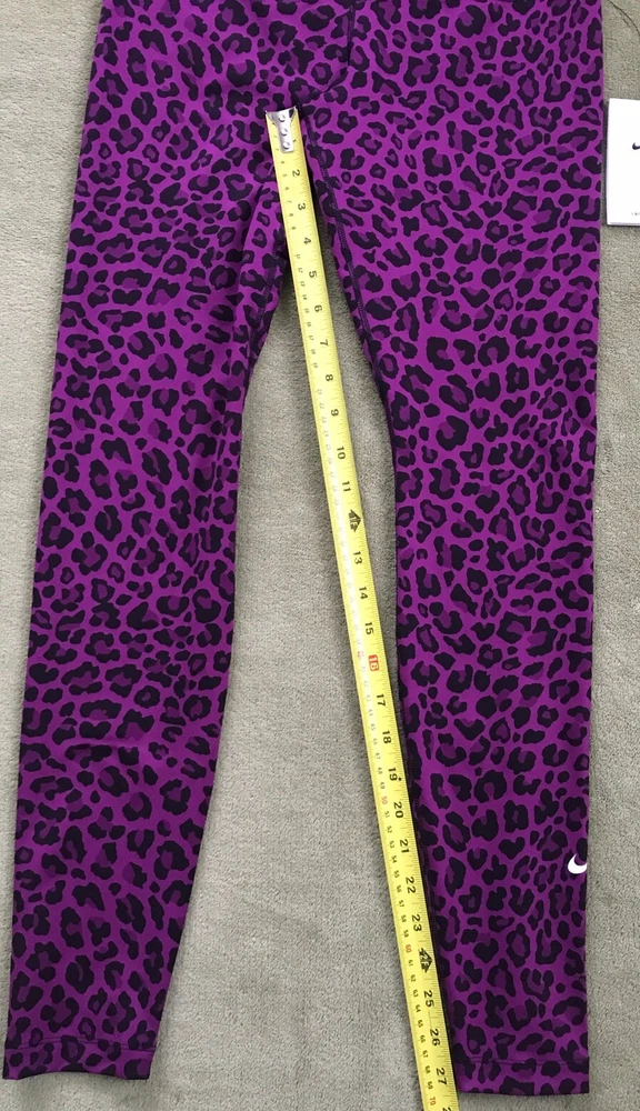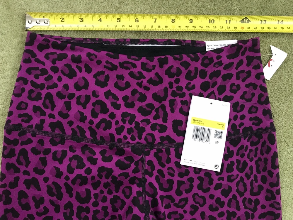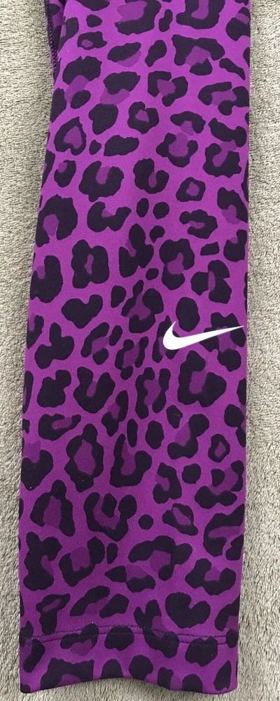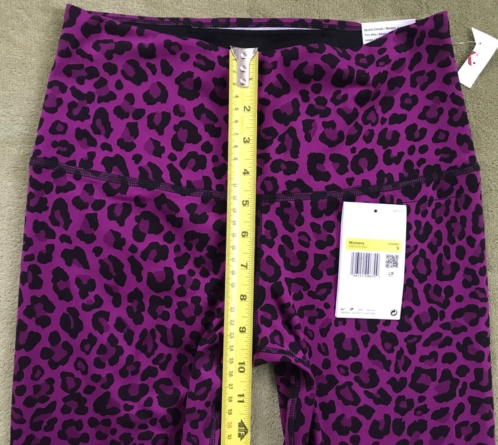 Nike Women's Dri-FIT One High-Waisted Printed Leggings New with tags. Store display. The tags may show sticker residue, scratches, folding marks. Style#DM7274-503 Purple/Black Women’s S Animal print pattern Mid-rise: ~9.5” ~27.5” inseam Stretchy fabric with Dri-FIT technology moves sweat from your skin for quicker evaporation to help you stay dry and comfortable Non-sheer fabric passes the squat test to keep you covered The sides are seamless and the waistband is contoured with a V shape on the back to give you a smooth silhouette The design includes 2 hidden pockets in the mid-rise waistband to keep you ready for whatever you tackle in a day 79% Polyester, 21% Spandex