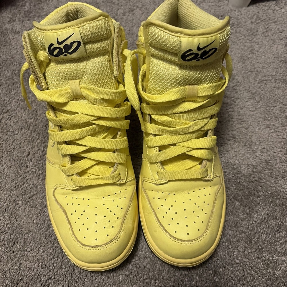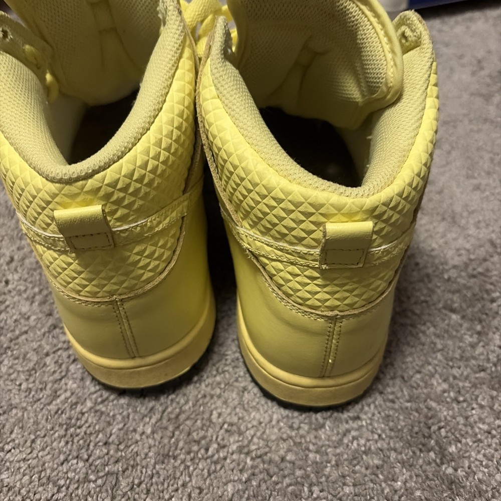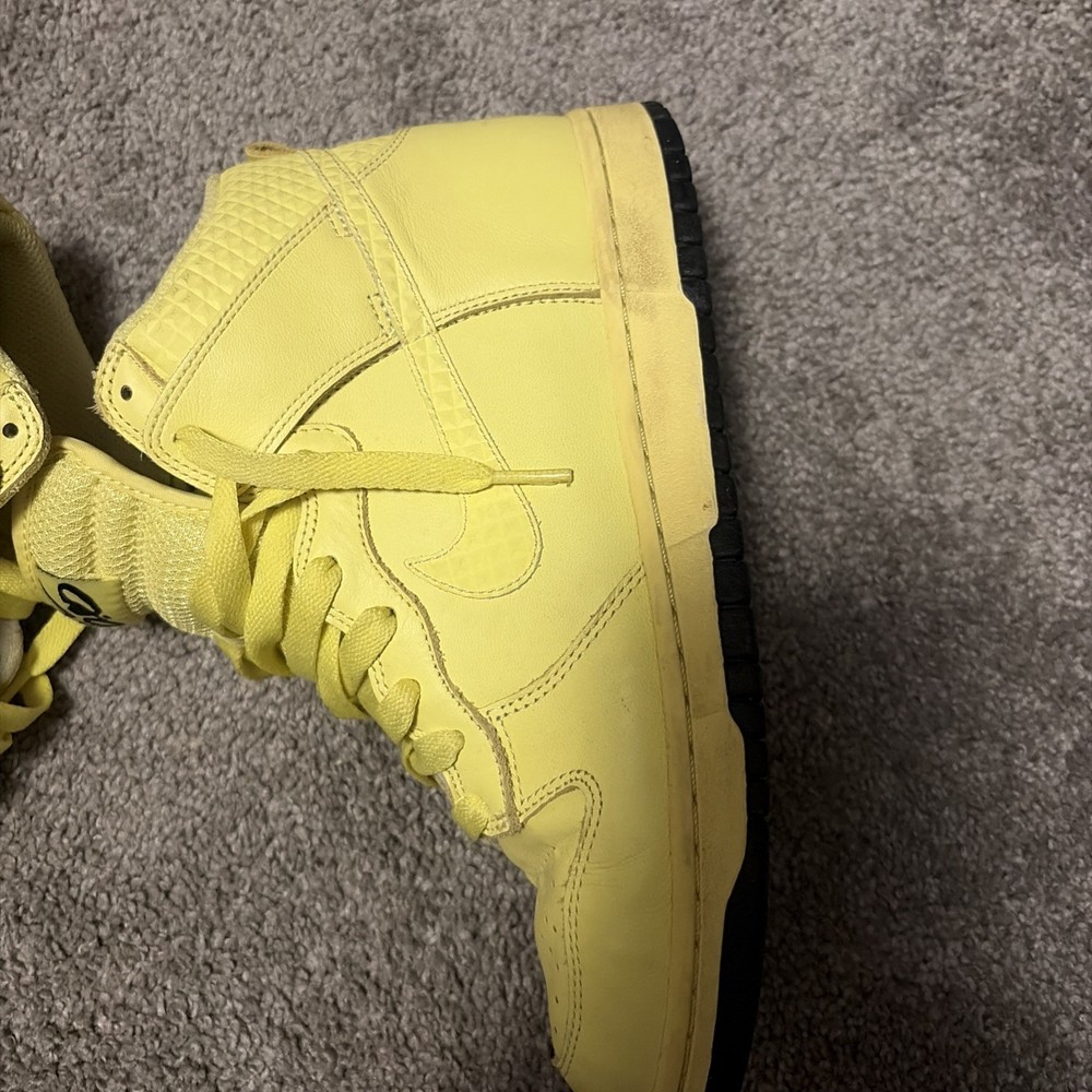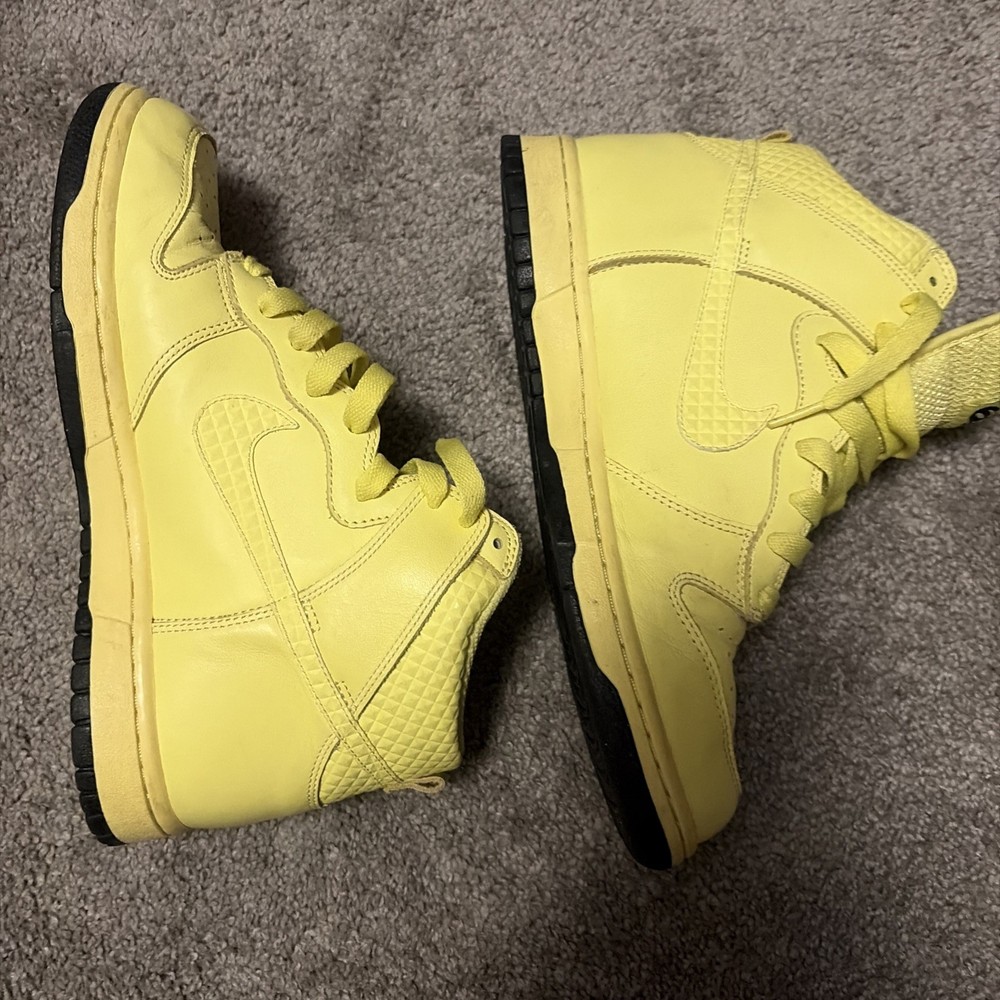 The Nike Women’s 6.0 Dunk High Lemon Frost in size 9.5 is a stylish and sporty athletic shoe designed for women. Featuring a high top shaft style with a lace up closure, this sneaker is perfect for casual occasions and will surely make a statement with its vibrant yellow color. Made with leather upper material and a foam insole for comfort, this Dunk model also boasts a rubber outsole for durability. Perfect for the summer, fall, or spring seasons, these Nike Dunks are a trendy and practical choice for any woman looking to elevate her shoe collection.