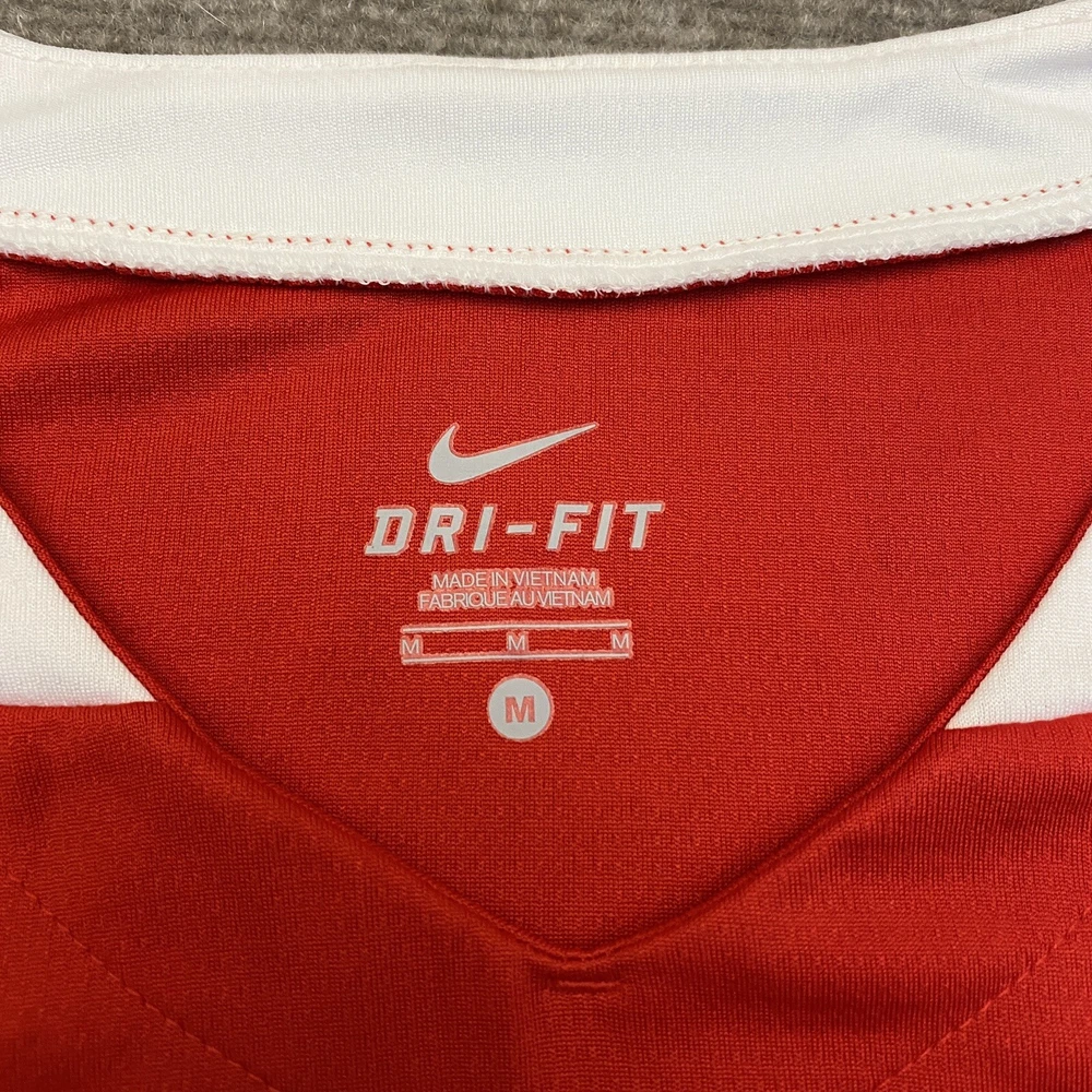 Fabric Type: Jersey Garment Care: Machine Washable Style: Jersey Model: Nike Dri-Fit Size: M Color: Red Theme: Sports Fit: Athletic Brand: Nike Character: Nike Pattern: Striped Sleeve Length: Sleeveless Neckline: V-Neck Vintage: No Department: Women Material: 100% Polyester Performance/Activity: Basketball, CrossFit, Cross Training, Volleyball Product Line: Nike Dri-FIT Season: Spring, Summer Occasion: Activewear Features: Breathable, Collarless, Contrasting Trim Fabric Wash: Medium Type: Tank Size Type: Regular