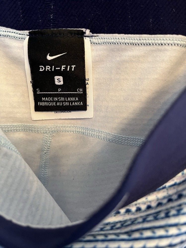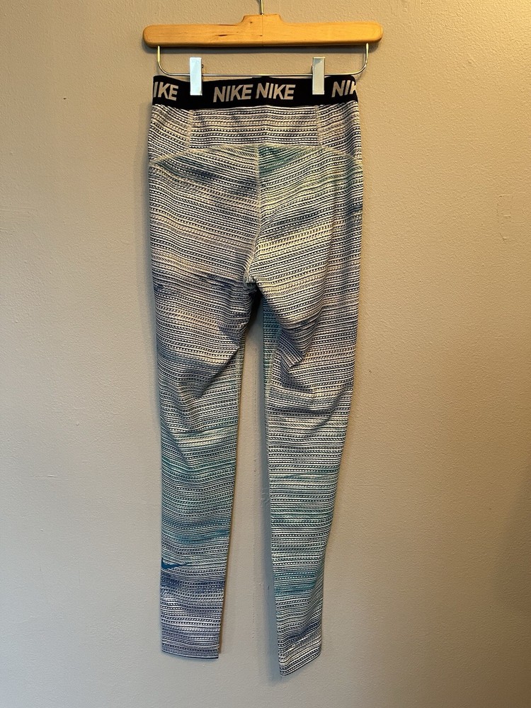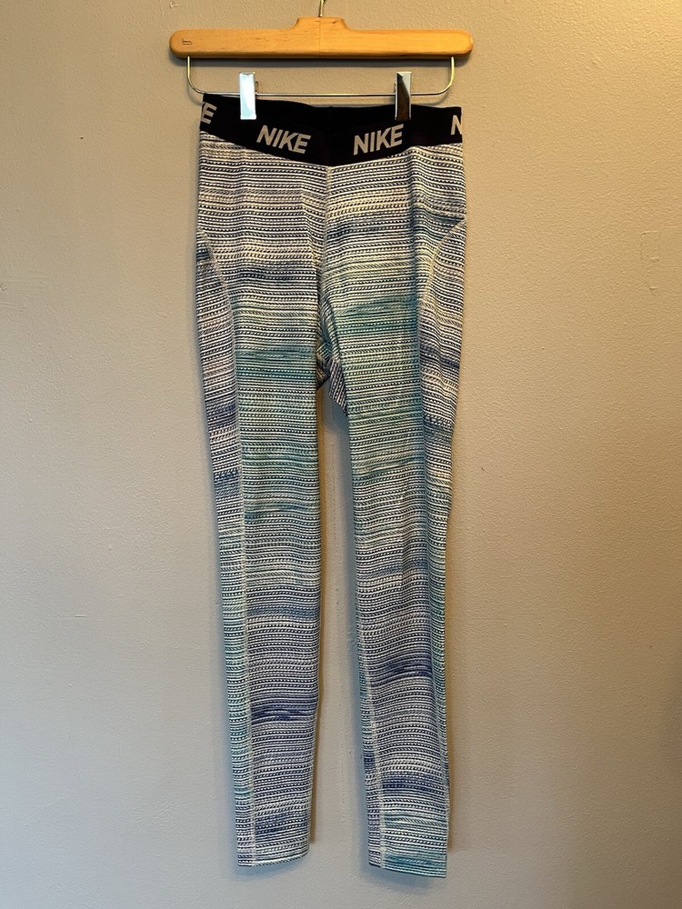 Nike Women’s Size Small Dri-Fit Athletic Workout Leggings Stretch Blue & White Pattern. Leggings are in excellent pre-owned condition.