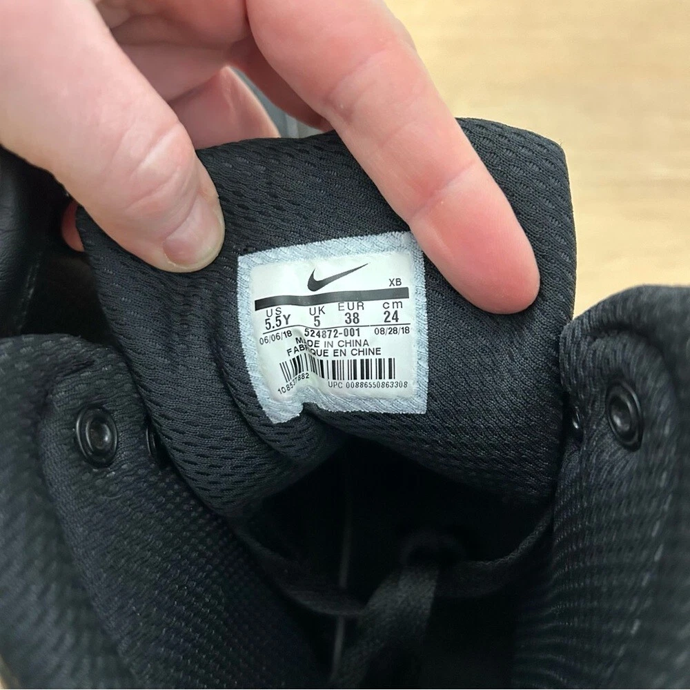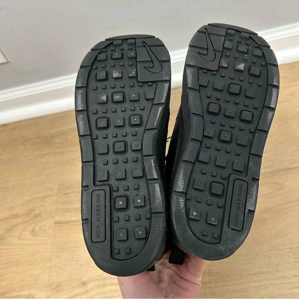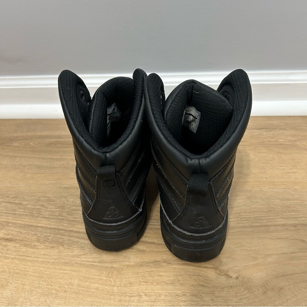 These Nike black boots feature a high ankle design, providing excellent support and a sleek, monochromatic look. Crafted with a textured upper, they offer both style and durability. The sturdy sole ensures comfort and stability, making them perfect for various activities.