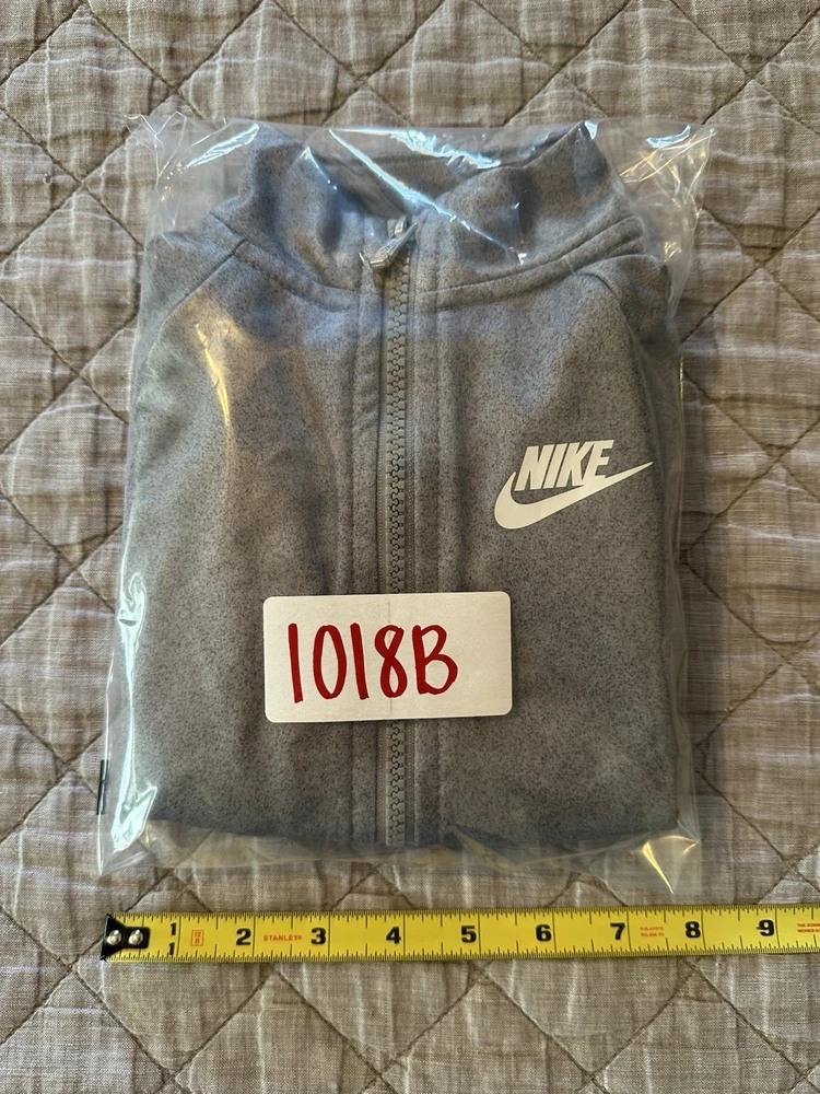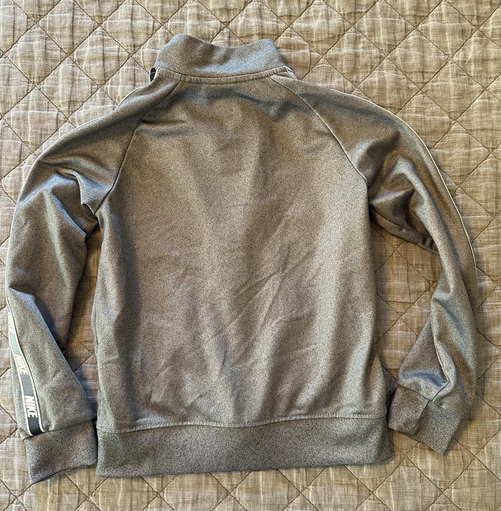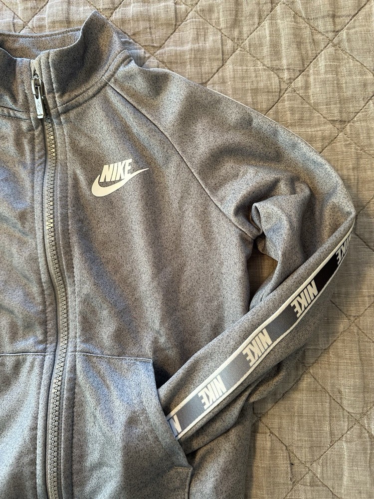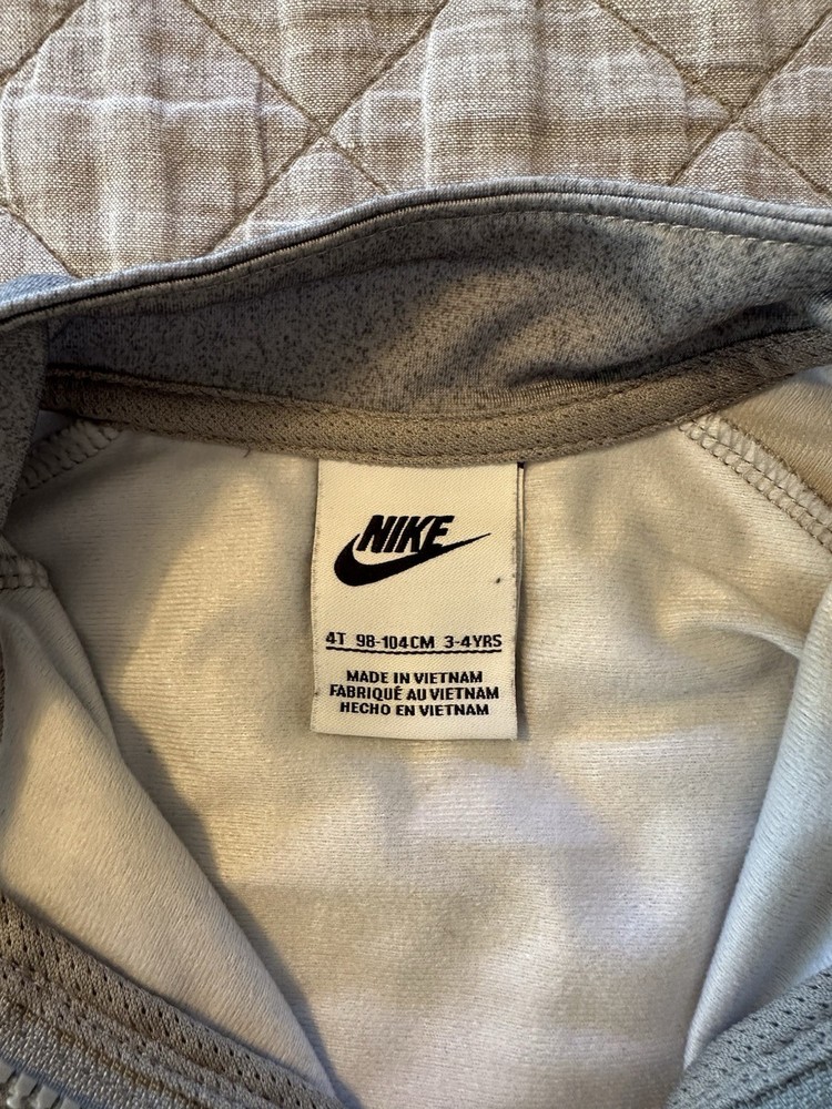 The Nike Youth Boys 4T Gray Full Zip Sweatshirt Track Jacket is a stylish and comfortable outerwear option for young boys. Made from a durable blend of polyester and elastane, this sweatshirt features a solid gray color with sleeve spellout accents and logo taping. The full zip design, crew neck, and long sleeves make it easy to layer over outfits, while the pockets add functionality. Perfect for active kids, this Nike sweatshirt is machine washable and features the iconic Swoosh logo, making it a versatile and trendy addition to any boy's wardrobe.