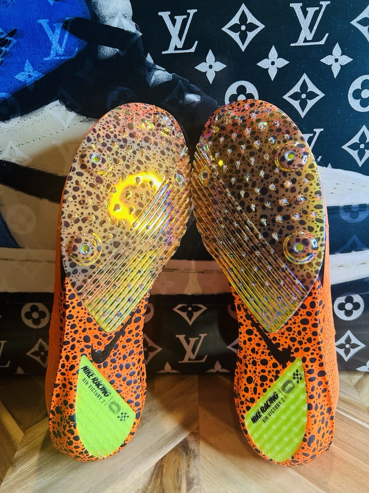 This is a pair of Nike ZoomX Victory 2 track spikes in a vibrant orange color, featuring spikes for track and field events. The shoes have a low top design with mesh upper material, a standard shoe width, and are designed for men in size 12 UK, 13 US, and 47.5 EU. The style code is FV2325-900, and they are part of the Nike ZoomX product line, with a release year of 2024.