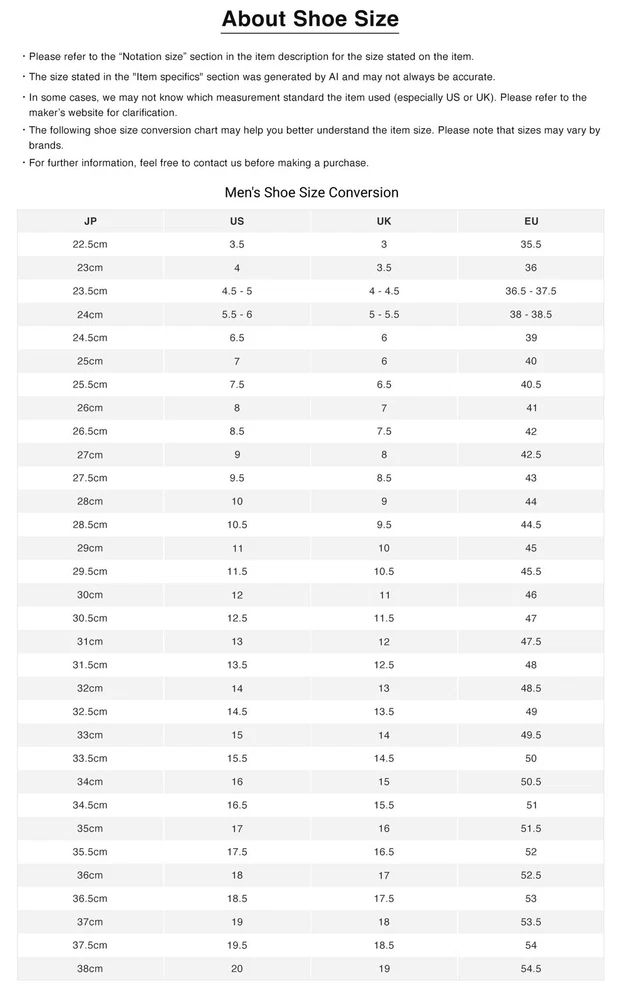 • Before purchasing, please read this page in conjunction with the notes at the bottom of the page, and by placing an order and making payment, you agree to be bound by the product conditions and notes. • International shipping will be facilitated through our central shipping center in Japan. Please allow approximately 10 business days for us to handle the item, from dispatching it from our local store to preparing it for international shipping in our central shipping center. • Tracking number will be provided only after the item reaches our central shipping center in Japan. • Item details and descriptions have been translated by AI, so occasional mistakes may occur. If you encounter any issues, please don't hesitate to reach out to us. PRODUCT INFORMATION Brand Nike Style Sneaker Department Men Type Athletic Color White Product Line Others Character Others Vintage No Customized No Theme Others Model Others Country/Region of Manufacture Unknown Shoe Shaft Style Low Top Upper Material See Description US Shoe Size 8.5 UK Shoe Size 8 EU Shoe Size 42 Others ■Product name Nike NIKE low top sneakers 26.5 ■Damage Details ・Outsole Sole: Stain ■Item Details Brand: Nike Model: Waffle Racer Accessories: - *Since this is a used item, accessories such as ribbons and replacement belts may not be available when purchasing a new product. Part Number: CD8180-100 Category: Mens-Fashion-Shoes-Sneakers-M Color: White Other ■Size Details Notation size: 26.5 Measured size: M Outsole 28cm (11.02 in) Case width 11cm (4.33 in) About size Measurements are taken while lying flat. *Two sizes are listed: the size shown (size announced by the manufacturer) and the measured size (size measured by our company). *We apologize for the inconvenience, but we do not re-measure products once they have been posted. *Please allow slight differences due to measurement size. Material: - *Materials may be described in product images Control number: IT03N0KJV8SW [Please note] *Negotiations for price reductions are not accepted. About Us BOOKOFF is one of Japan's leading second-hand chain, with more than 700 stores across the country. We offer a wide selection of premium branded items, including designer bags, wallets, jewelry, watches, fashion clothing, and more. All items will be thoroughly inspected, carefully packed, and shipped directly from Japan. BOOKOFF is also a member of the AACD (Association Against Counterfeit Product Distribution), an organization which aims to prevent the distribution of counterfeit and fraudulent products, hence buyers can purchase genuine brand items with confidence at our store. All of our items are selected and authenticated by professional authenticators to ensure their authenticity. About Payment • Only eBay managed payments are accepted. • We do not do transactions outside of eBay. Shipping & Taxes • Free Shipping Worldwide. • All items will be shipped via Japan Post with tracking service (EMS or ePacket). • All orders will be shipped from Japan to the registered address on the buyer's eBay account. • Shipments may be delayed due to bad weather, public holidays, customs office delays, and other conditions beyond our control. • All customs duties, import taxes or related fees occurred during shipping are the responsibilities of the buyer. If you have any concerns, please inquire directly with your local customs office before making a purchase. Return & Cancellation Policy • All listed items are also available at our retail store and multiple online platforms in Japan. In the event that an item is out of stock or sold, we will issue a cancellation along with a full refund. • If you wish to return an item for a refund, please contact us directly before initiating a return or opening a case. • For damaged items or discrepancies with the item description, please reach out to us directly within 10 days of receiving the item, providing pictures of the damaged area or issues. • Unless the item is damaged or does not match its description, buyers will be responsible for the return shipping fee. > All returns must be shipped to our address in Japan with a tracking number. > Refunds will be processed once the returned item has arrived safely. • Buyers who violate eBay policies or misuse eBay's Money Back Guarantee will be reported and blocked from future purchases. click here to see our store