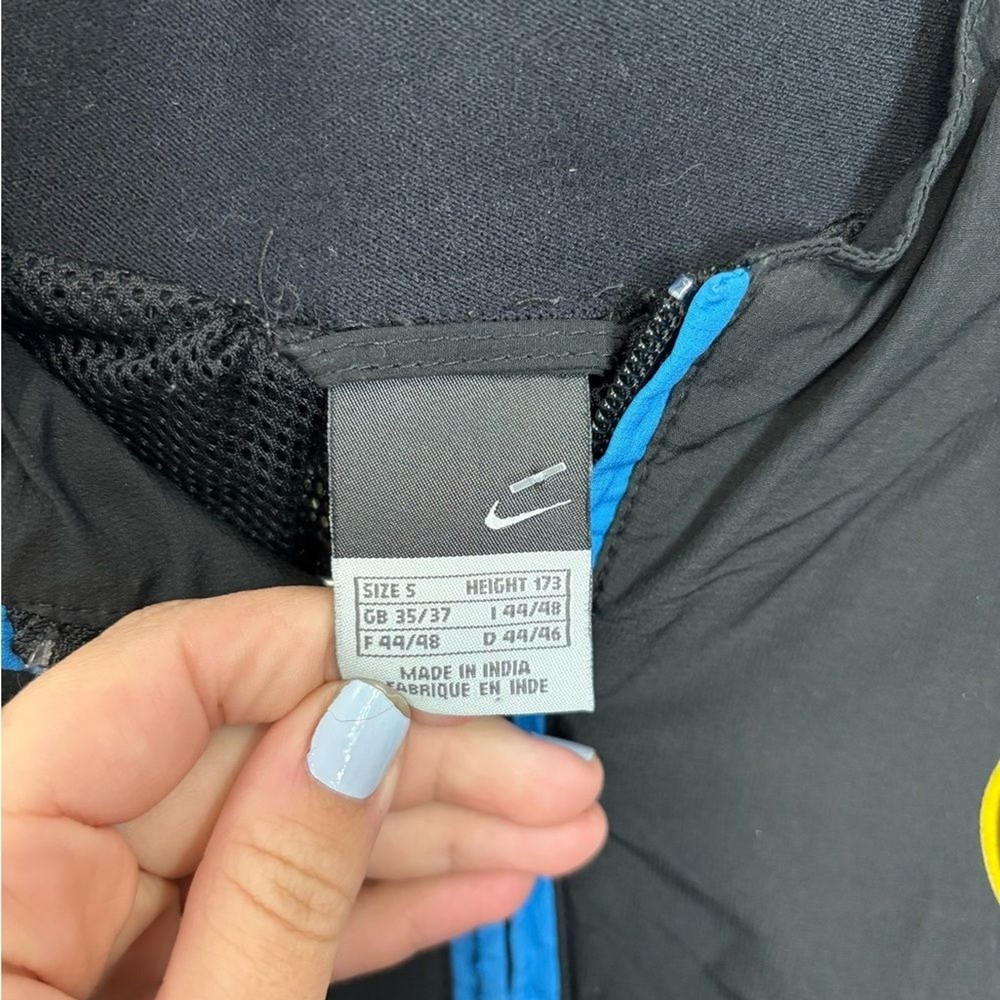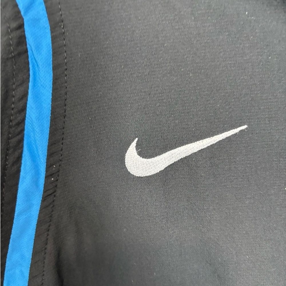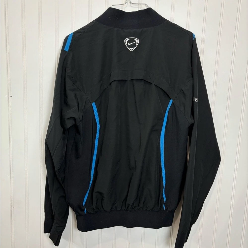 Nike windbreaker for men. Black with blue trim. Lightweight and sporty. Size small