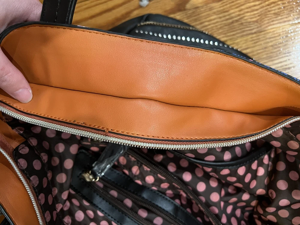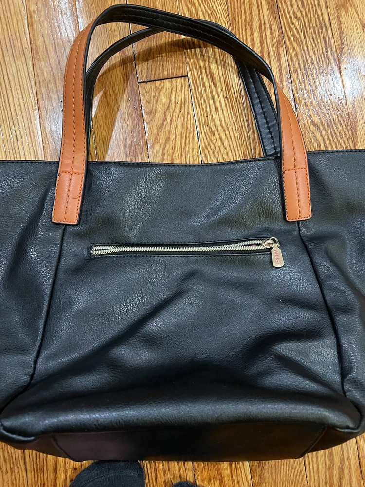 Nikky by Nicole lee shoulder tote bag. The bags exterior is in great condition, has no rips or tears. The design is as it’s supposed to be. The inside has has some wear on the lining but there is no rips. Has multiple pockets inside and one zipper pocket in the outside. The shoulder strap is missing.
