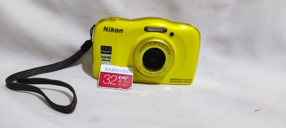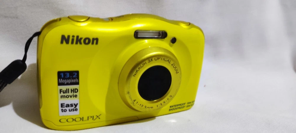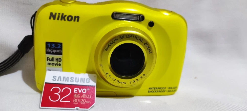 Tested and working Nikon Coolpix W100 comes with 32GB SD card no charger or case included. It typically includes a 13.2-megapixel CMOS sensor, 3x optical zoom lens, and a 2.7-inch LCD screen. It's waterproof up to 33 feet (10 meters), shockproof from falls up to 5.9 feet (1.8 meters). Its design is compact and colorful, often appealing to kids and families. It's easy to hold and operate, with large buttons and straightforward menus. While it's not meant for professional-grade photography, it's capable of capturing decent quality images and videos, especially in outdoor and underwater settings. It usually features built-in Wi-Fi and NFC for easy sharing of photos and videos to compatible devices. no damaged body major scratches as you can see If you have any questions please contact me