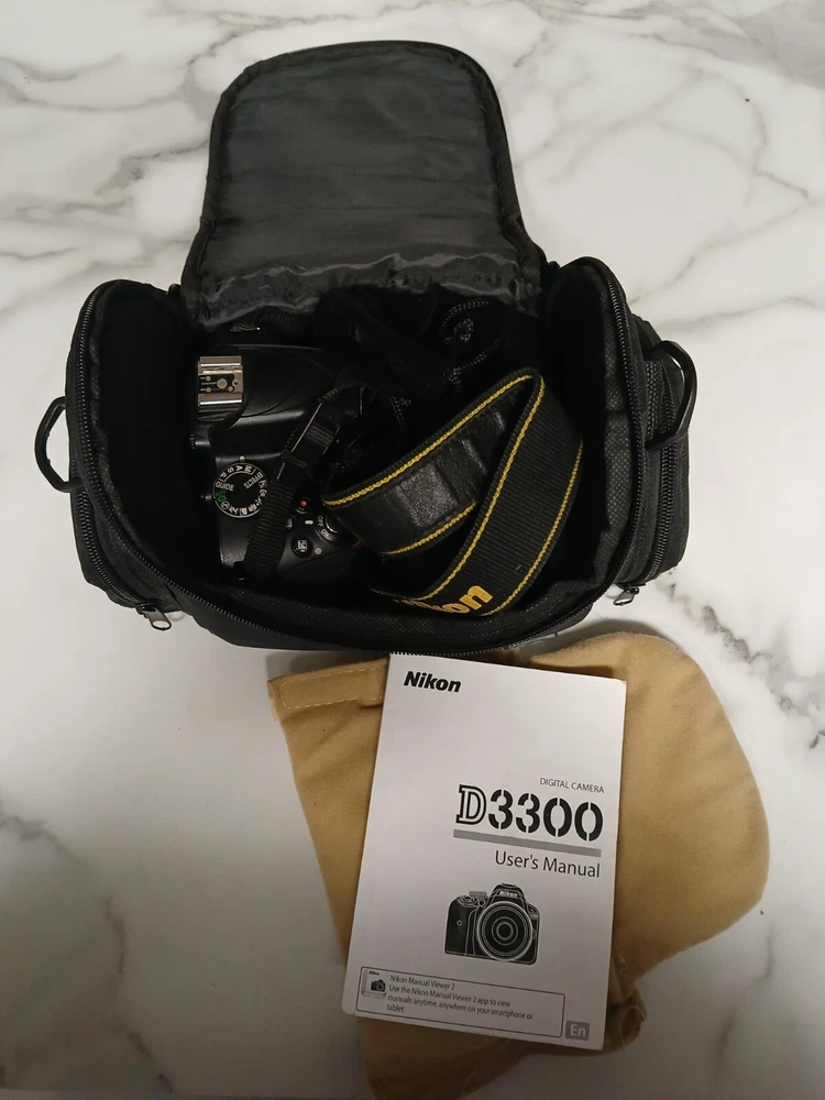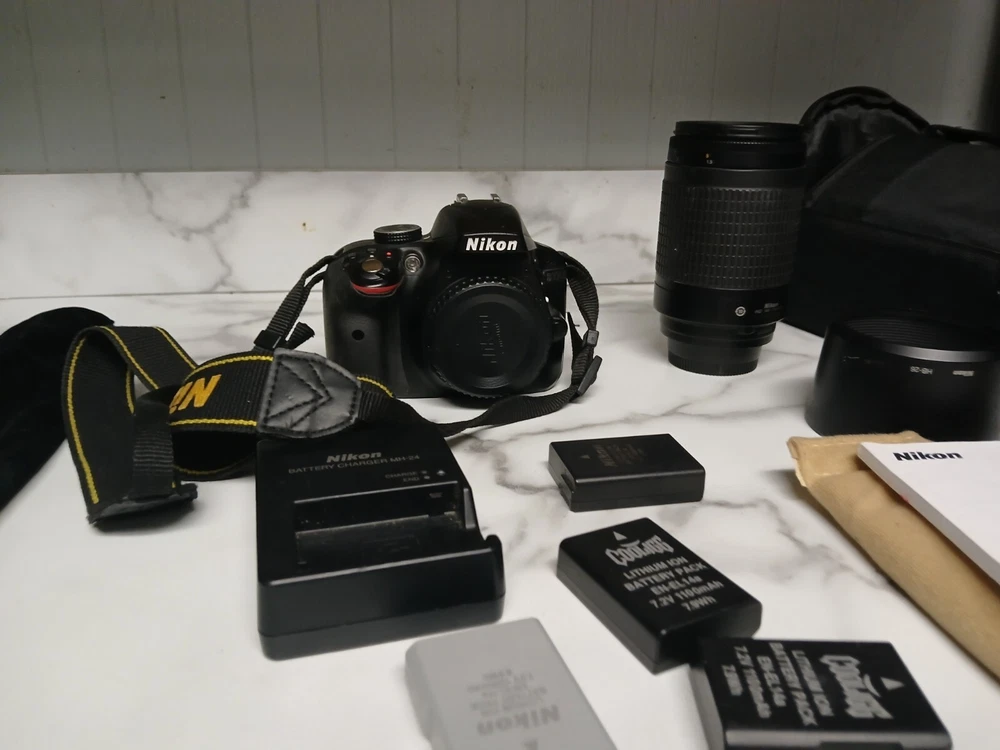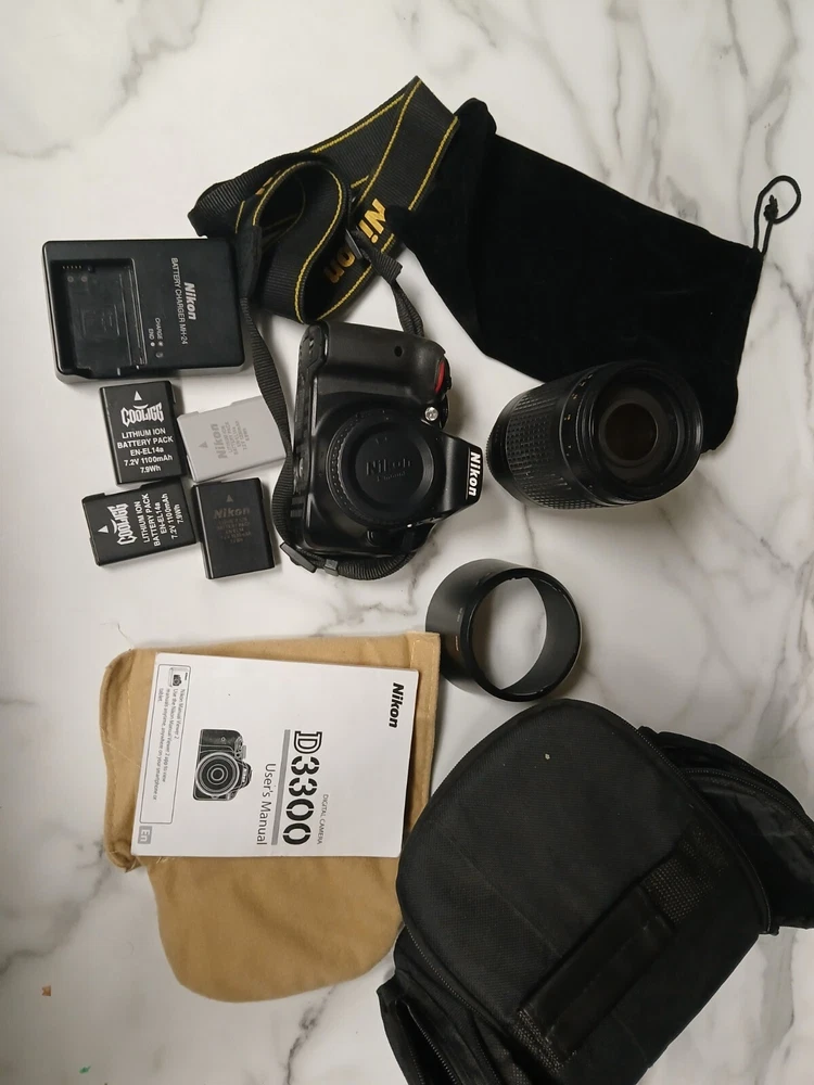Kit includes: - Nikon d3300 Camera (missing rubber around viewing window) -Nikkor 70-300mm 1:4-5.6G mechanical lens (missing front lens cover. Comes with bag and guard) -Nikon battery charger - 4 batteries -camera bag -manual