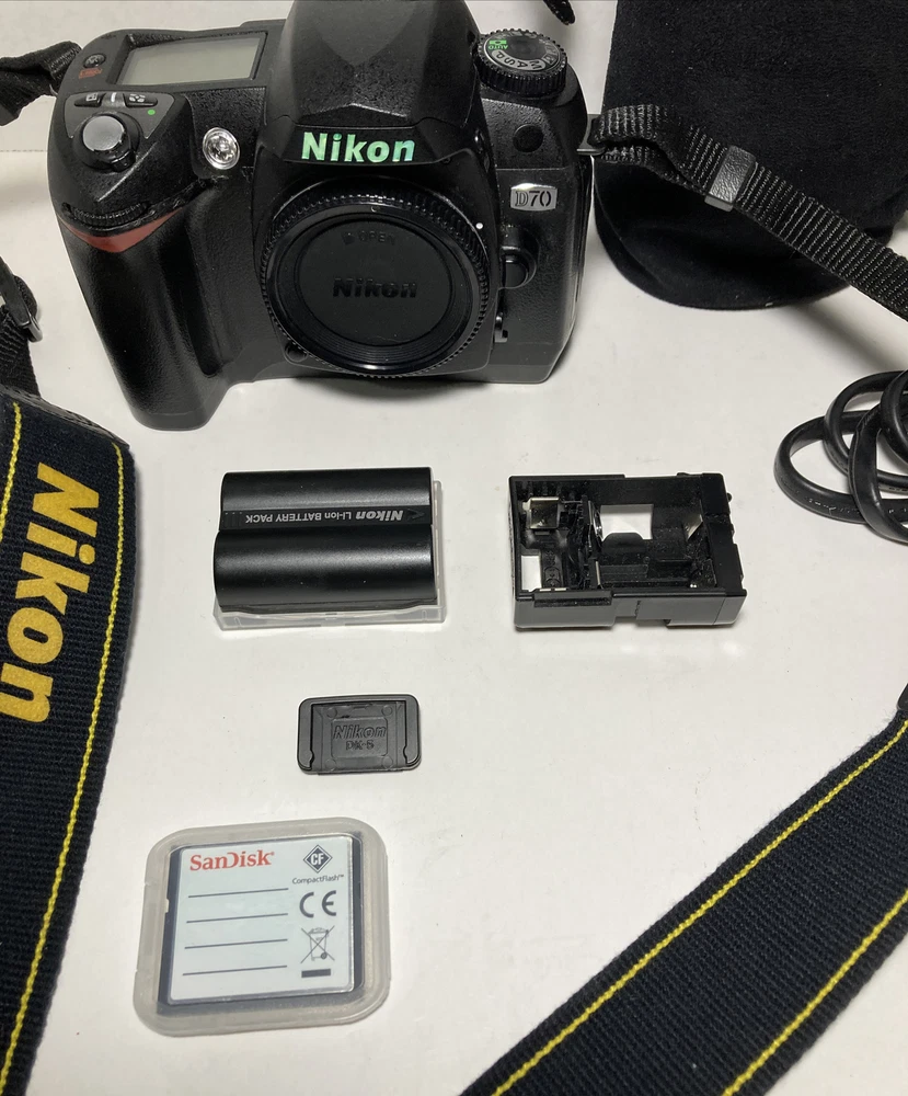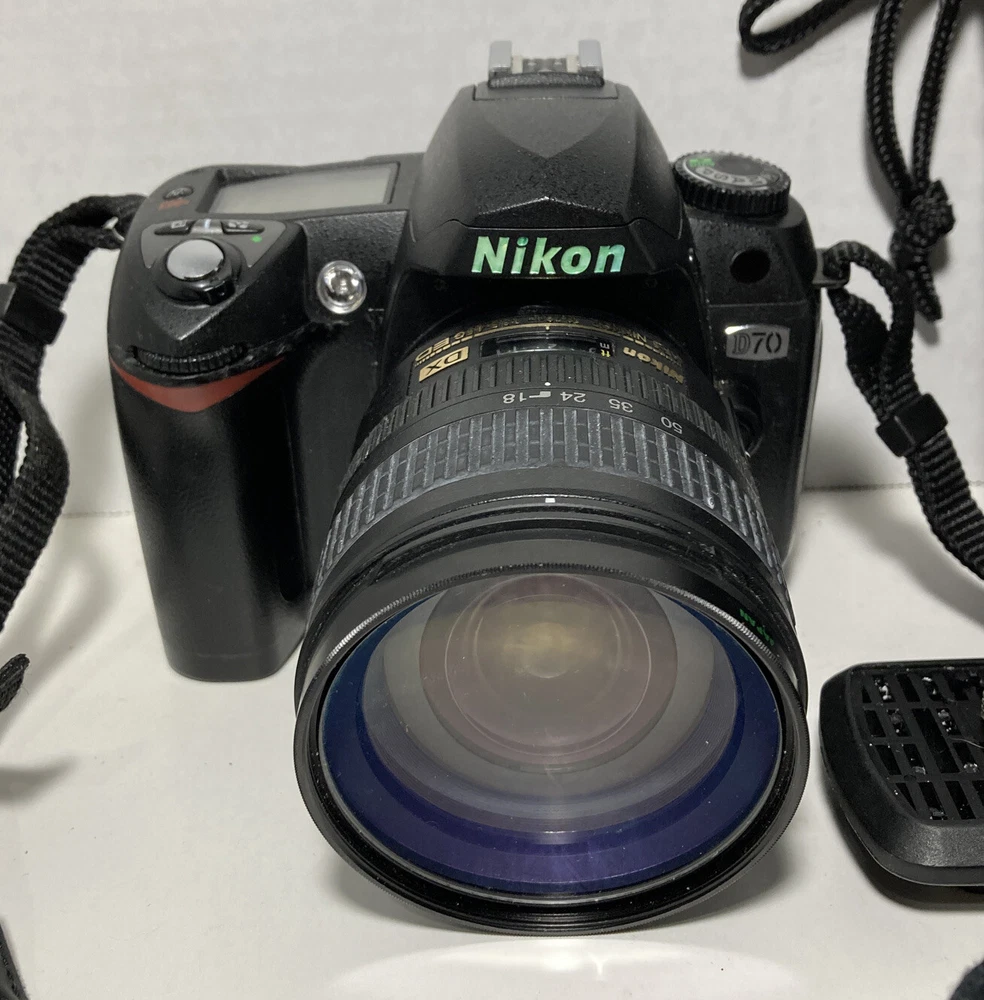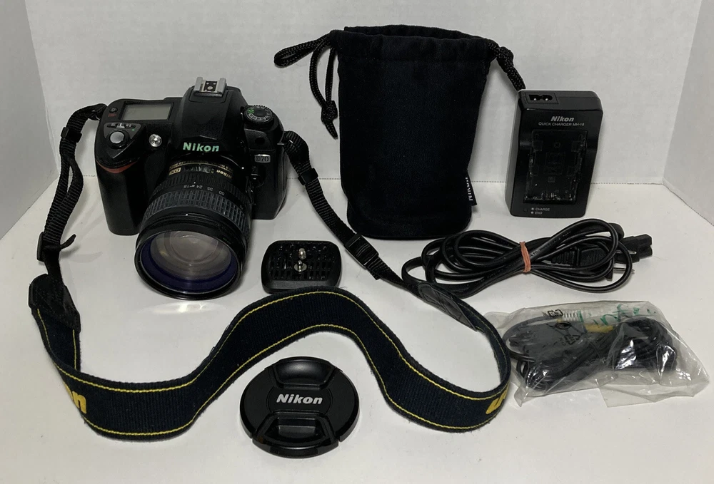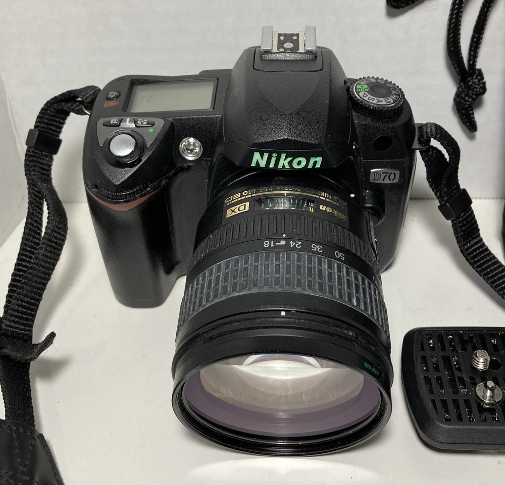 This Nikon D70 DSLR camera comes with an AF-S DX 18-70mm lens and has been tested to ensure proper functionality. It has a maximum resolution of 6.1 MP and features auto-focus capabilities for easy use. The camera is black in color and uses a lithium-ion battery for power. The Nikon D70 is part of the Nikon D series and weighs 21.2 oz. It includes USB connectivity for easy transfer of photos and is a great option for anyone in need of a reliable digital camera. The Nikon letters on the front of the camera have been colored in with a green marker. The camera includes everything pictured. The item will ship out safely and securely the same or next business day.