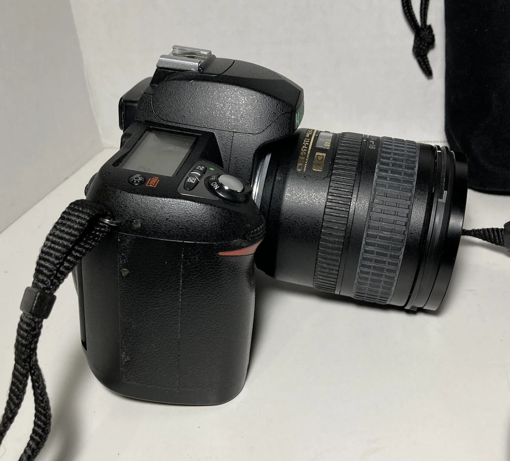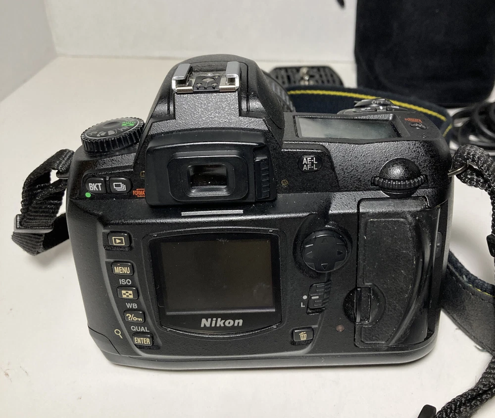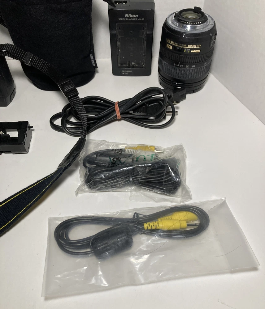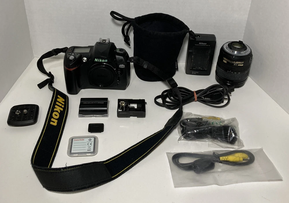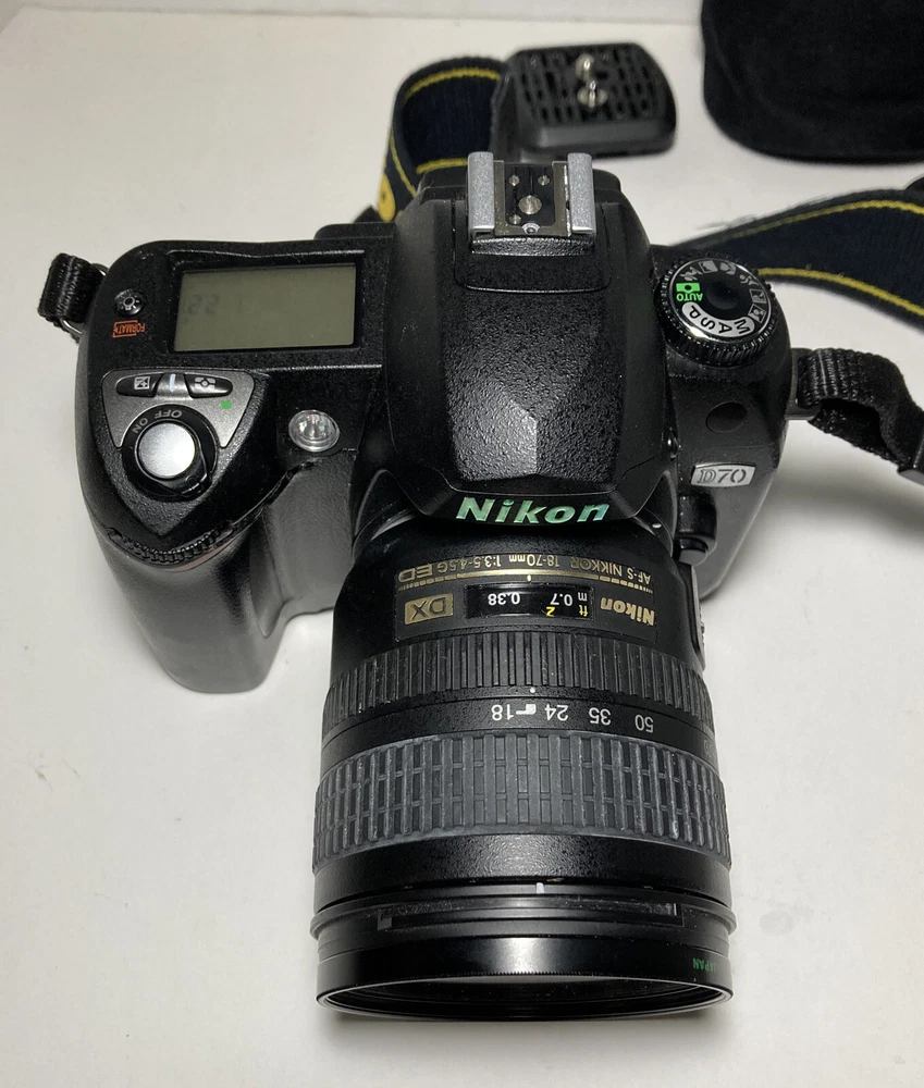 This Nikon D70 DSLR camera comes with an AF-S DX 18-70mm lens and has been tested to ensure proper functionality. It has a maximum resolution of 6.1 MP and features auto-focus capabilities for easy use. The camera is black in color and uses a lithium-ion battery for power. The Nikon D70 is part of the Nikon D series and weighs 21.2 oz. It includes USB connectivity for easy transfer of photos and is a great option for anyone in need of a reliable digital camera. The Nikon letters on the front of the camera have been colored in with a green marker. The camera includes everything pictured. The item will ship out safely and securely the same or next business day.