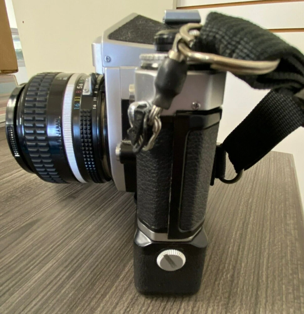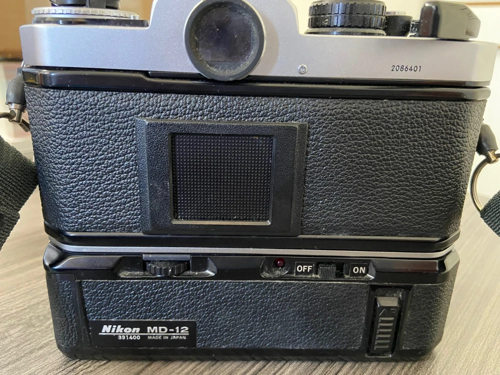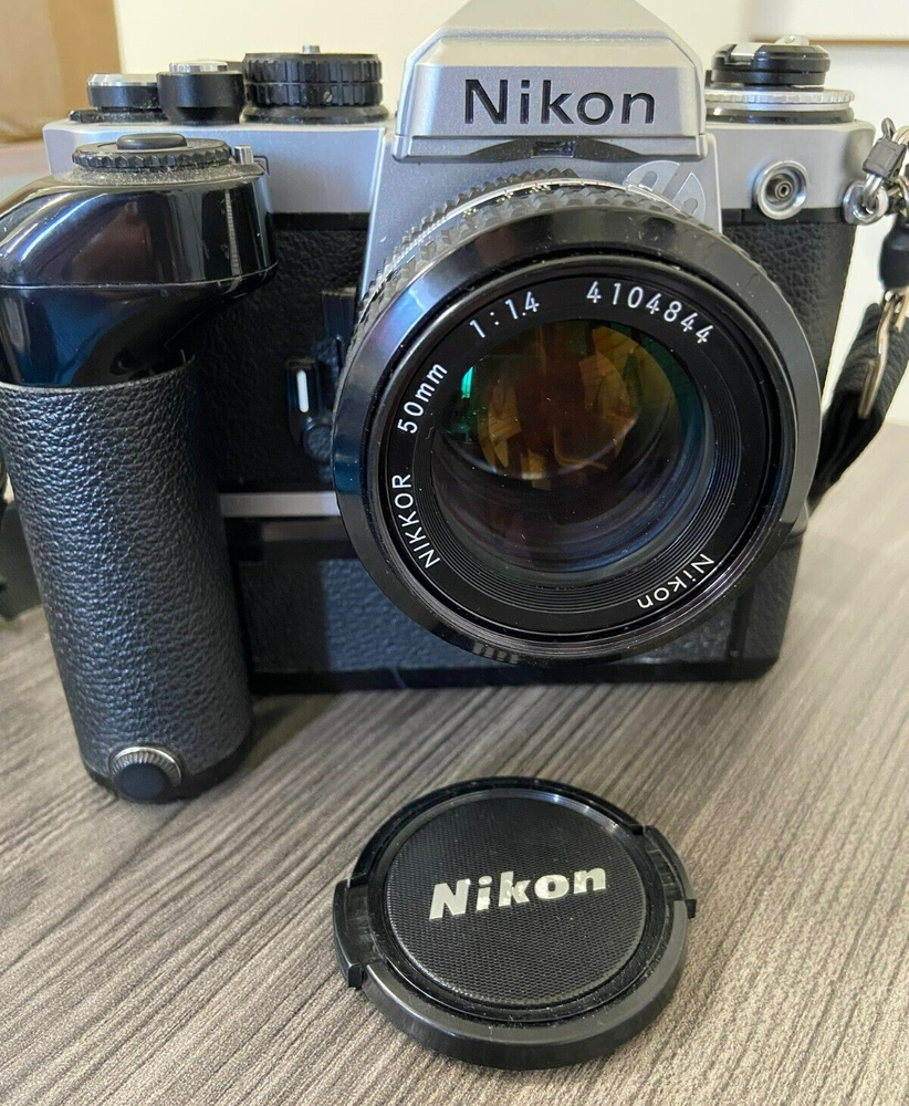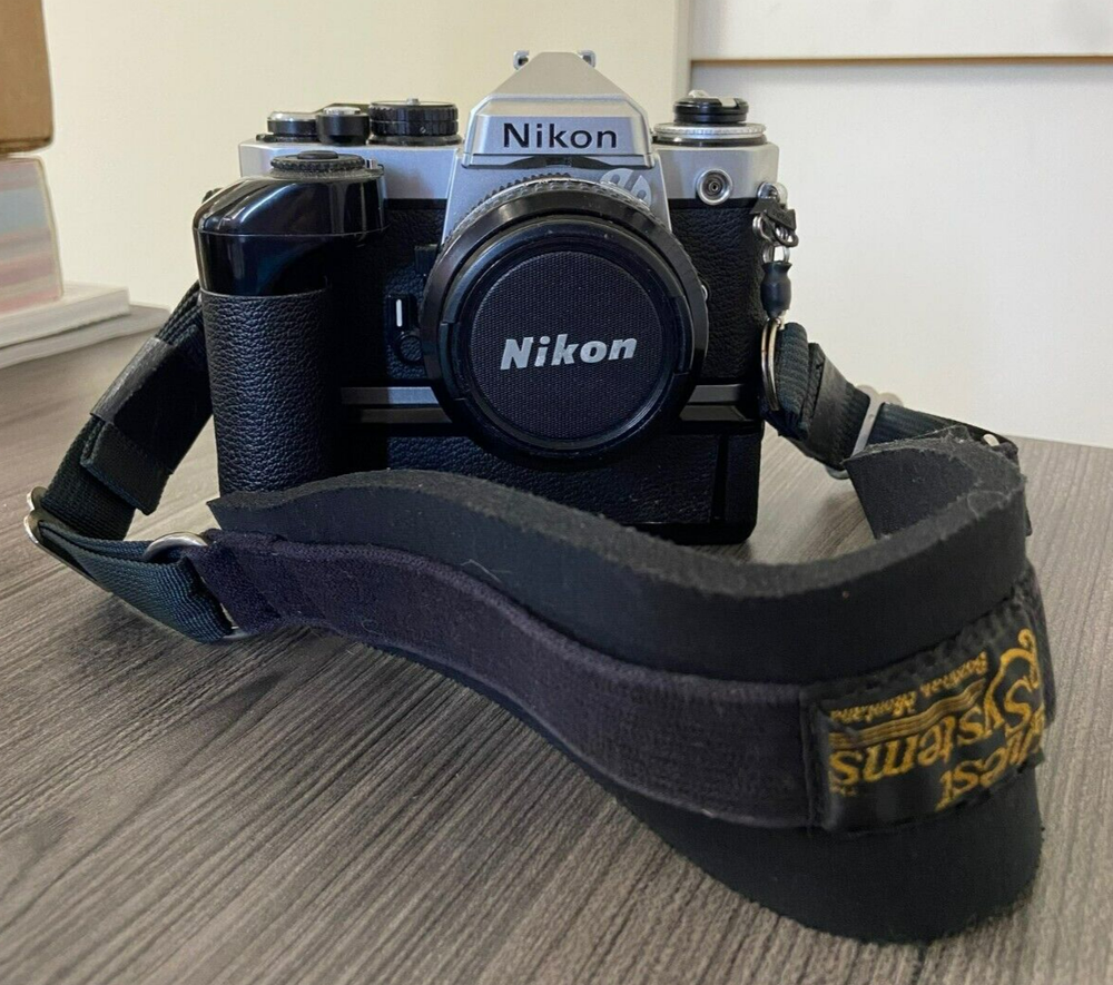 The product is a Nikon FE2 camera with an MD-12 motor drive, featuring a manual focus and a 35mm format. It is part of the Nikon FE2 series, made in Japan, and comes in a black/silver color scheme. The camera includes a strap and lens cap, but does not come with the original box or instructions. This setup is ideal for film photography enthusiasts looking for a reliable SLR camera system with the added convenience of a motor drive for capturing fast-paced moments. This item is sold as-is.