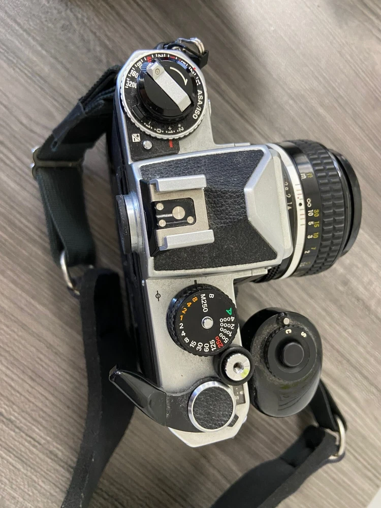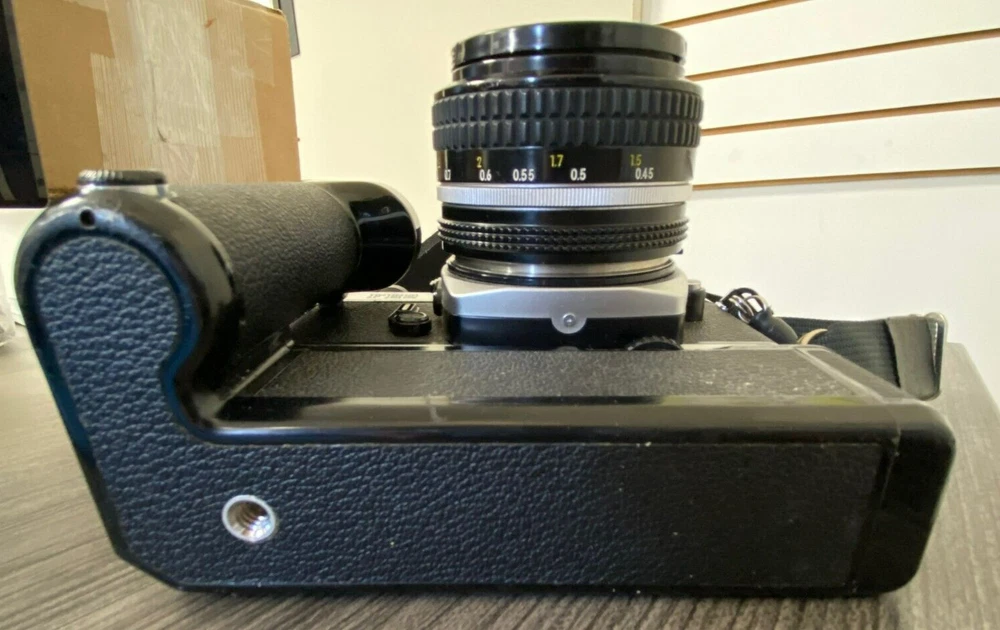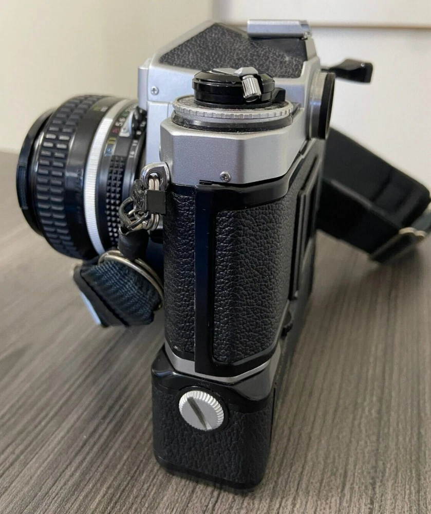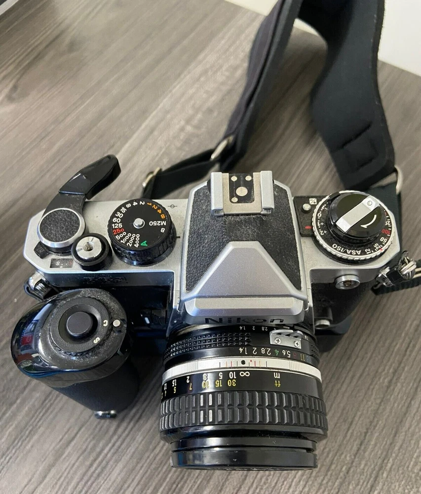 The product is a Nikon FE2 camera with an MD-12 motor drive, featuring a manual focus and a 35mm format. It is part of the Nikon FE2 series, made in Japan, and comes in a black/silver color scheme. The camera includes a strap and lens cap, but does not come with the original box or instructions. This setup is ideal for film photography enthusiasts looking for a reliable SLR camera system with the added convenience of a motor drive for capturing fast-paced moments. This item is sold as-is.