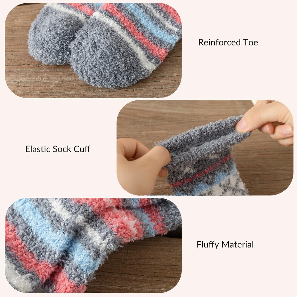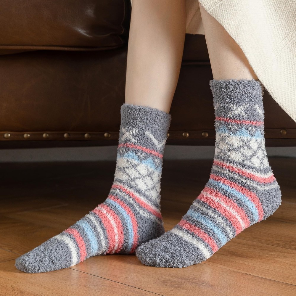 Fuzzy Socks for Women - Fuzzy Socks Fluffy Socks Cozy Socks Slipper Socks for Women, Winter Socks Womens Valentines Day Gifts for Her Women FUZZY SOCKS MATERIAL - Women's cosy socks without any string tangle! Our womens fuzzy socks are made of 95% polyester + 5% spandex with super soft coral velvet inner. Machine & hand wash. Fit US shoe size 6 - 10. Soft, durable and warm, very comfortable to wear SOCKS SIZE TIPS & COLOR - Our coral velvet fluffy socks women are suitable size 23.5 to 27 cm, suitable for women that fit shoe sizes from US 6 - 10, come with 5 pairs solid, fashion, cute novelty winter sleeping socks. You can replace a pair of socks every day. All of them are easy to match clothes COMFORTABLE TO WEAR - The plush stitching and elastic cuff enables the winter socks handy to slip on and take off, ensuring your socks not come off easily and bunch around your ankles, making your feet feel comfortable and warm. These fluffy socks for women are not easy to pilling or fade, can be worn for a long time LOVELY DESIGN SOCKS - The moderate thickness is nice for wearing during sleep, which can keep your feet warm and help you have a sweet dream. They're suitable for longtime-standing work as well. Women fuzzy socks are soft enough as sleeping socks as well as a great choice for slippers socks. You can also go out wearing it in heavy boots in the freezing winter BEST CHOICE - This women fuzzy socks are suitable for many situations, perfect for everyday wear, work, sleeping, boot, house, indoor, travelling, wear sleeping socks while you go to bed. Come with 5 pairs fuzzy socks, colorful socks add a unique element to any outfit. You can also choose the womens fuzzy socks pack as a Thanksgiving, Christmas, New Year, or Birthday present to your family and friends