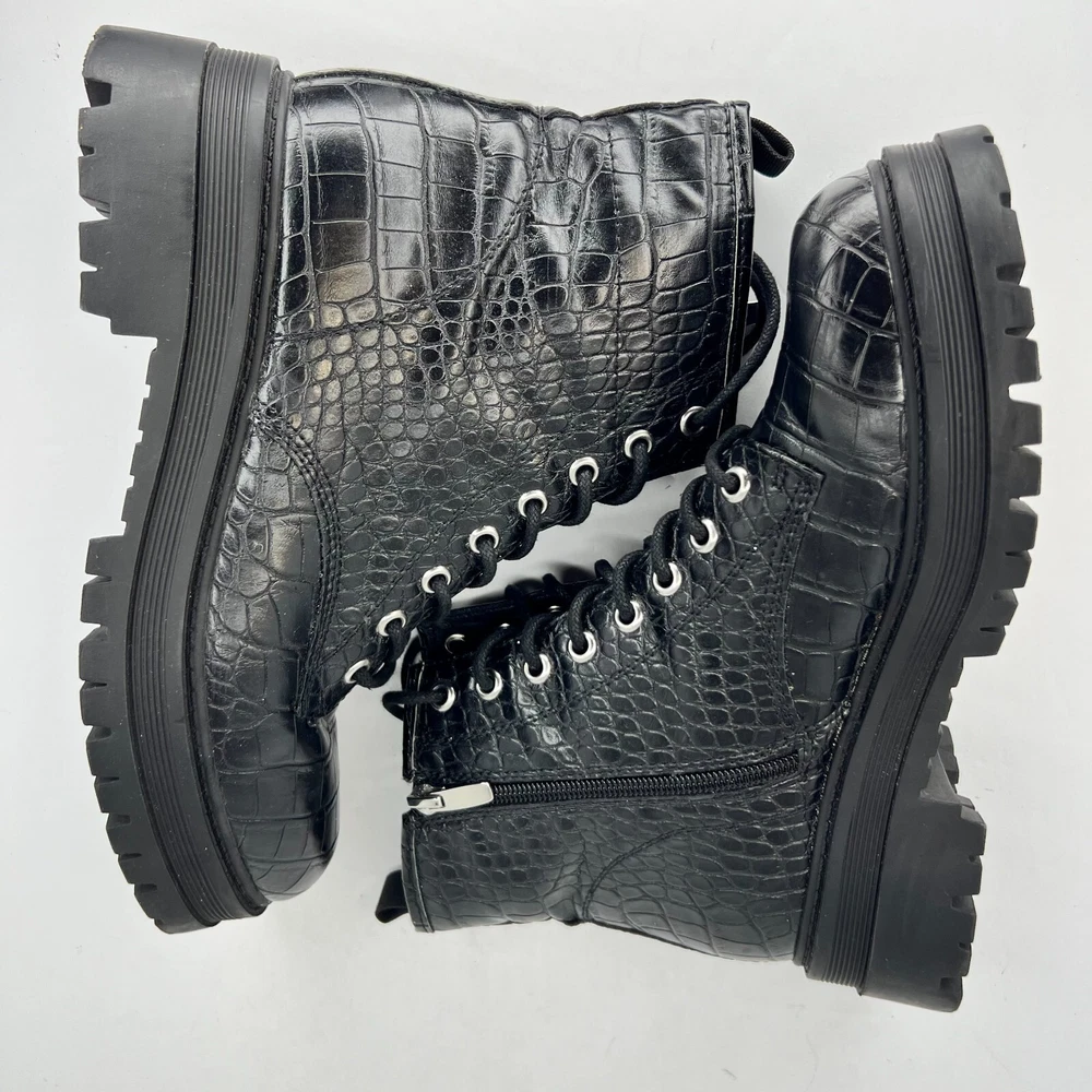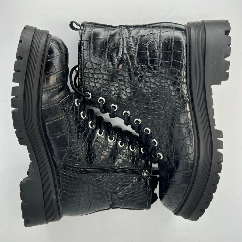 Elevate your style with these Nine West black croc print lace-up combat boots. Featuring a mid-calf shaft style and round toe shape, these boots are designed to provide both comfort and style. The boots are made with synthetic upper material and faux leather lining and outsole material, making them perfect for any season - winter, summer, fall, or spring. These boots have a solid pattern and a block heel style with a mid-heel height of 2-2.9 inches. The boots are branded with Nine West and are available in UK shoe size 4 and US shoe size 6.5. The boots are perfect for any woman who wants to add a touch of combat style to their wardrobe. 100% CUSTOMER SATISFACTION IS OUR GOAL! Our items are always carefully examined for condition, measured if necessary, and photographed in a climate controlled and smoke-free environment. We make every attempt to accurately describe and clearly picture the items we have for sale. Please, ALWAYS view all of the photos. We value your business and our goal is your complete satisfaction. FAST SHIPPING All items are packaged with care and shipped out the same or next business day via USPS, FEDEX, or UPS with tracking numbers so you are always informed. RETURNS We offer a 30-day return policy. All items must be unused and unopened in the condition in which they were received, with original packaging, and all accessories included for return. REVIEWS - CUSTOMER SATISFACTION - COMMUNICATION We aim to make you happy. After you receive your shipment, please leave a positive review . If you have concerns or questions about your order, please contact us so we can resolve the issue. We will do our best to make you satisfied. THANK YOU FOR YOUR BUSINESS!
