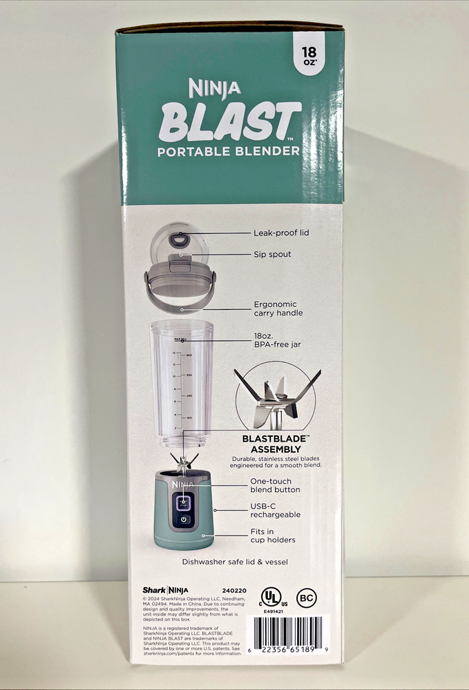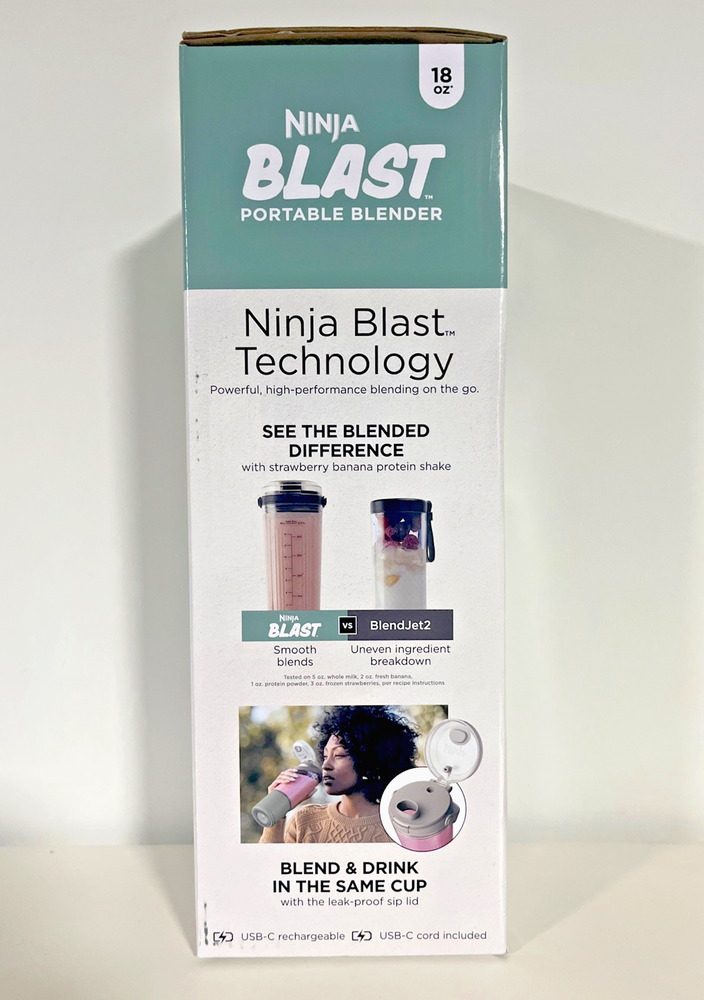 Ninja Blast 18oz Portable Blender with Flat Lid & Blade Cover - Mint Teal Aqua - SEALED BRAND NEW - FREE SHIPPING About this item NINJA BLENDING ANYWHERE: Blast through frozen ingredients with Ninja’s best portable blending power. Make perfectly smooth drinks anywhere you go. LARGE CAPACITY: Makes up to 18 oz. of your favorite blends. PREMIUM COLORS: Choose a color that best fits your style. EASY TO CARRY: Take your drink on the go with a comfortable, hinged carry handle. SIP LID: Easy-open sip lid lets you blend and drink in the same vessel. EASY TO CLEAN: The lid and vessel are BPA free and dishwasher safe. The blender can also self-clean with a 30 second blend cycle with water and a drop of dish soap. NINJA BLAST TECHNOLOGY: The ribbed vessel creates a vortex while the durable, stainless steel BlastBlade Assembly blasts through ice and frozen ingredients. FEATURES Water resistant USB-C, Sip spout, Dishwasher safe lid & vessel, Rechargeable with USB-C Cord Included.