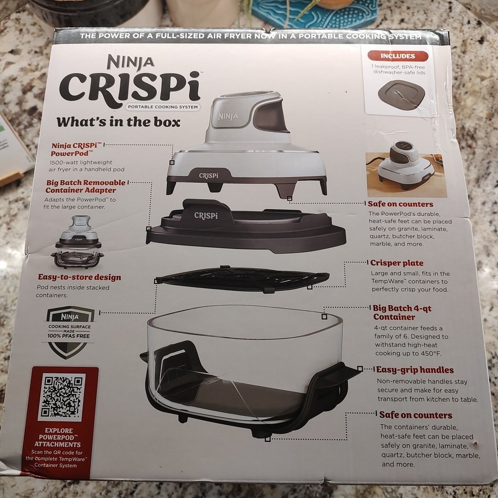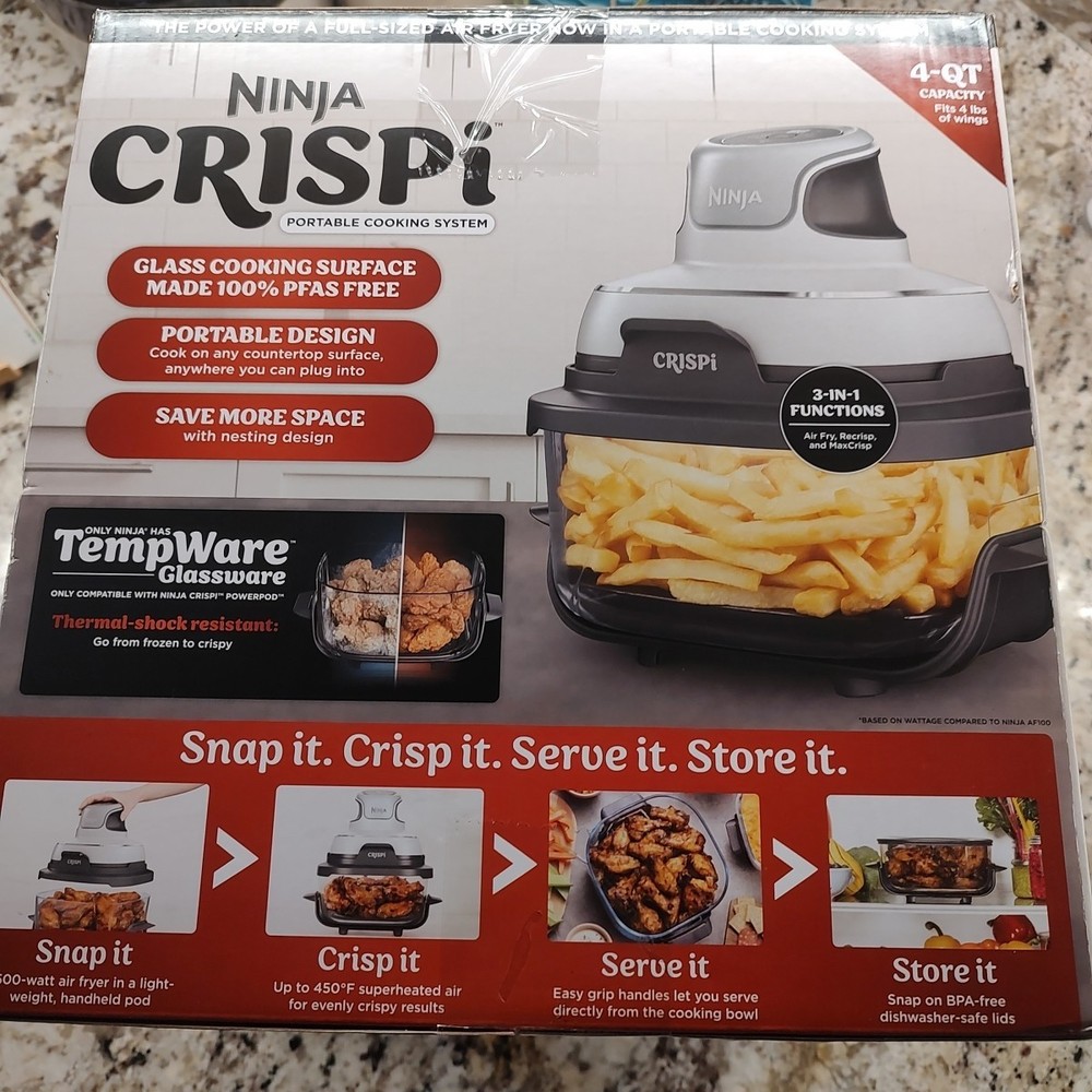 The Ninja Crispi 3-in-1 Portable Glass Air Fryer Cooking System is a versatile and convenient kitchen appliance. With a maximum temperature of 450°F and a capacity of 4 qt, this electric air fryer can handle a variety of cooking tasks. Its portable design makes it easy to use anywhere in your home, while the dishwasher-safe glass material ensures easy cleaning. The unit includes a lid, basket, base, and instruction manual, providing everything you need for delicious and healthier meals. With three settings/programs and a power of 1500 W, the Ninja Crispi is a reliable and efficient appliance for any kitchen.