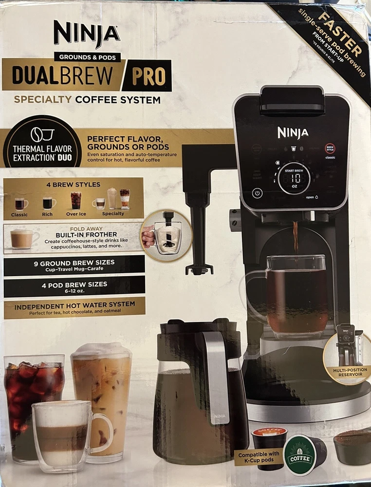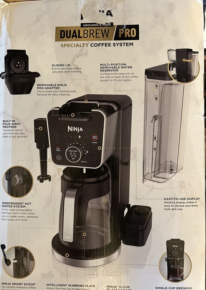 Brew your favorite coffee with ease using the Ninja DualBrew Pro Specialty 12-Cup Coffee Maker. This coffee maker features a water tank capacity of 60 oz and a power source of 1550 W, allowing you to enjoy your favorite coffee types such as espresso, latte macchiato, and cappuccino. The machine comes in a sleek black color and is made of glass and plastic materials. The Ninja CFP301 model includes a user manual, water tank, and coffee filters, making it easy to use and maintain. With a height of 15.54 inches, this coffee maker is perfect for any kitchen. Enjoy the perfect cup of coffee every morning with the Ninja DualBrew Pro Specialty Coffee Maker.