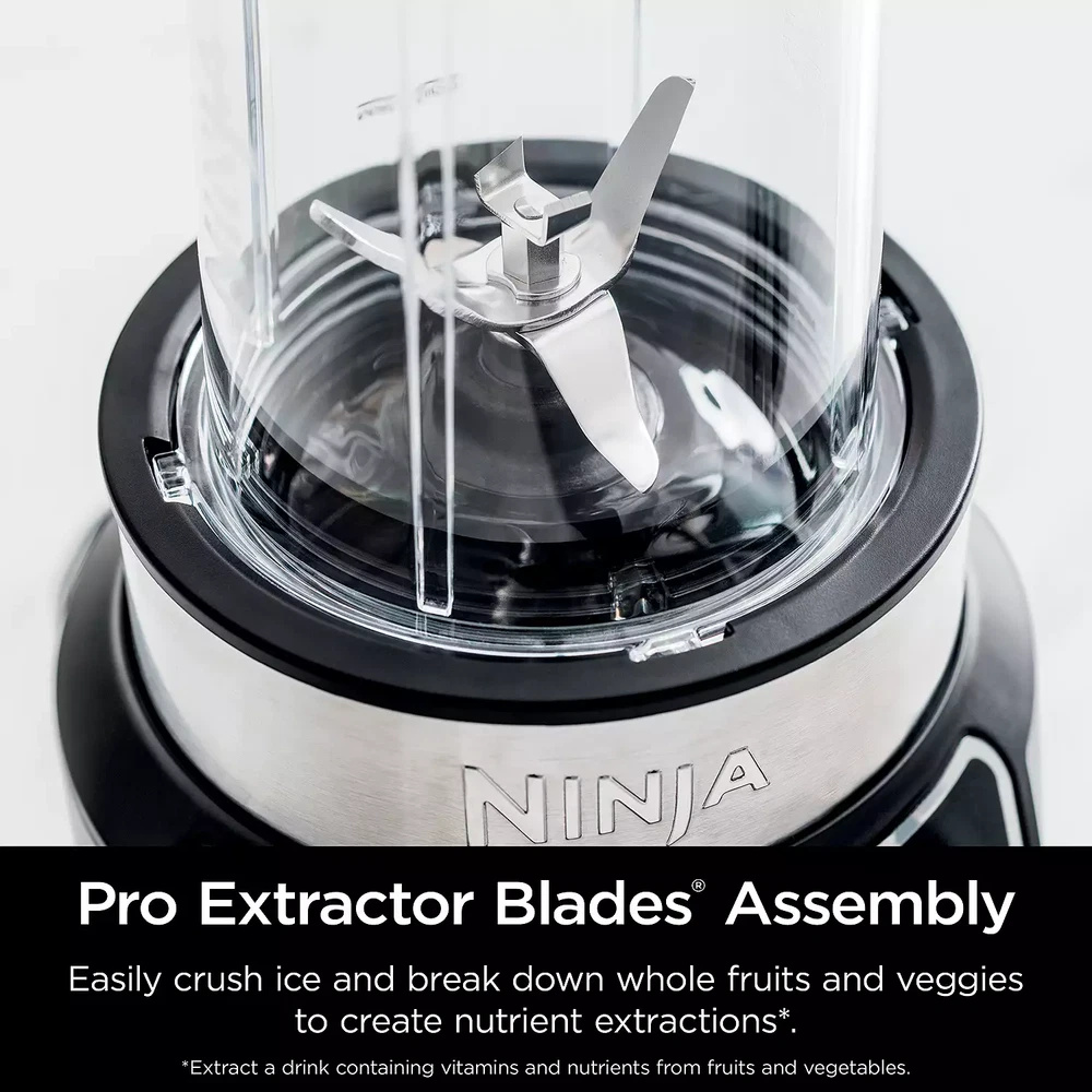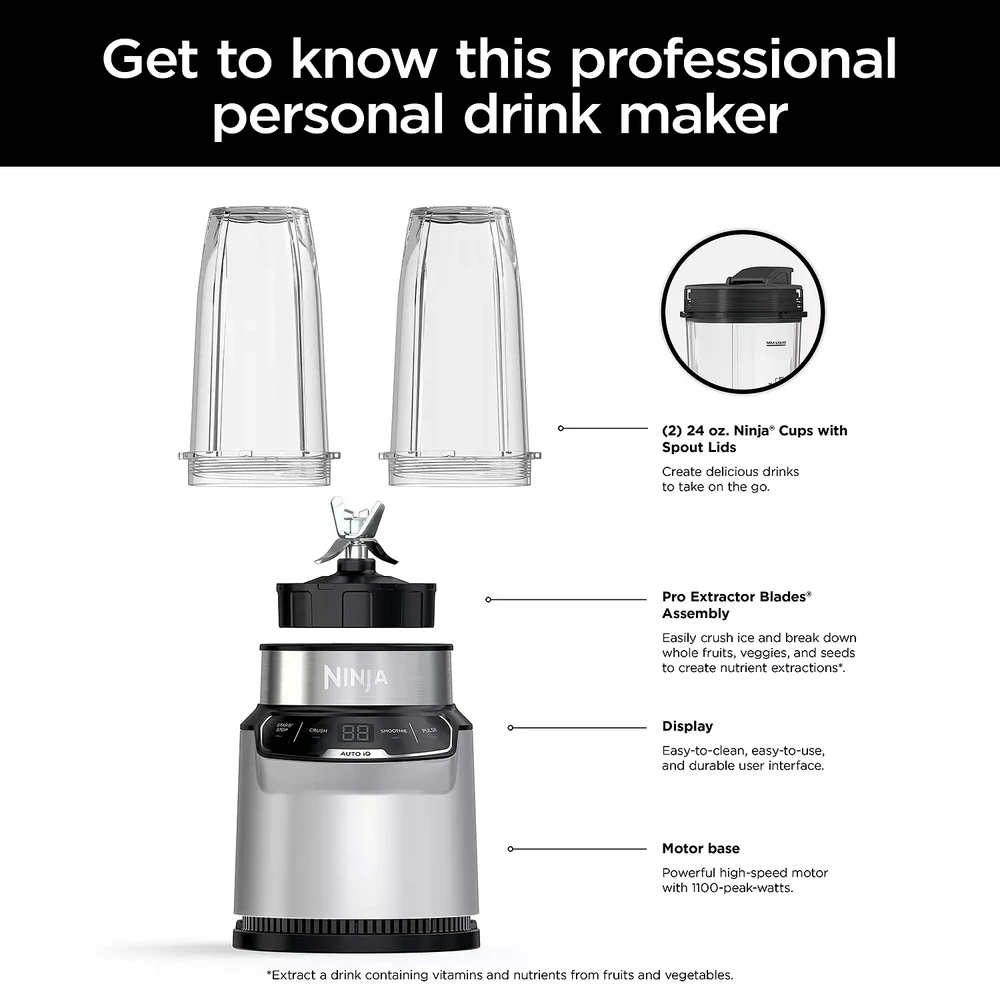 The Ninja Nutri-Blender Pro with Auto-iQ features a powerful 1100-peak-watt motor to pulverize tough ingredients. Two preset Auto-iQ Programs combine unique pulsing, blending, and pausing patterns to take the guesswork out of blending. Blend in your Ninja Single-Serve Cup and take your drink to go. PRODUCT FEATURES 1100-peak-watt motor provides the best of Ninja blending and powers through everything in the cup Two Auto-iQ® Programs provide one-touch intelligence and remove the guesswork Pro Extractor Blades Assembly easily crushes ice and breaks down whole fruits and veggies to create nutrient extractions Blend inside one of the two included Single-Serve Cups (24 oz.) and use the included spout lids to take your drink on the go Included recipe guide provides drink-making inspiration Clean up as easily as you blend with dishwasher-safe cups, lids and blade assembly WHAT'S INCLUDED 1100-peak-watt blender motor base, Pro Extractor Blades® assembly, 24-oz. single-serve cups, 2 spout lids & Inspiration Guide with 20 recipes PRODUCT CARE Manufacturer's 1-year limited warranty For warranty information please click here PRODUCT DETAILS Model no. BN401 1100 watts 31.5-in. cord length 24-oz. capacity 6.34"L x 6.93"W x 14.29"H