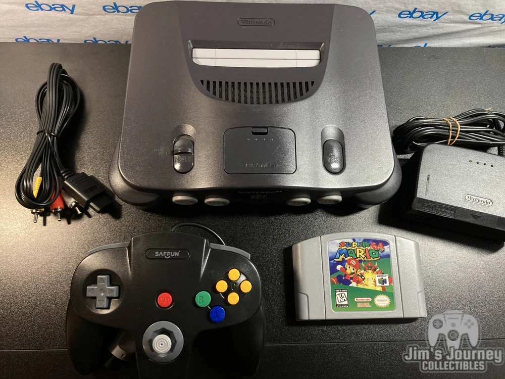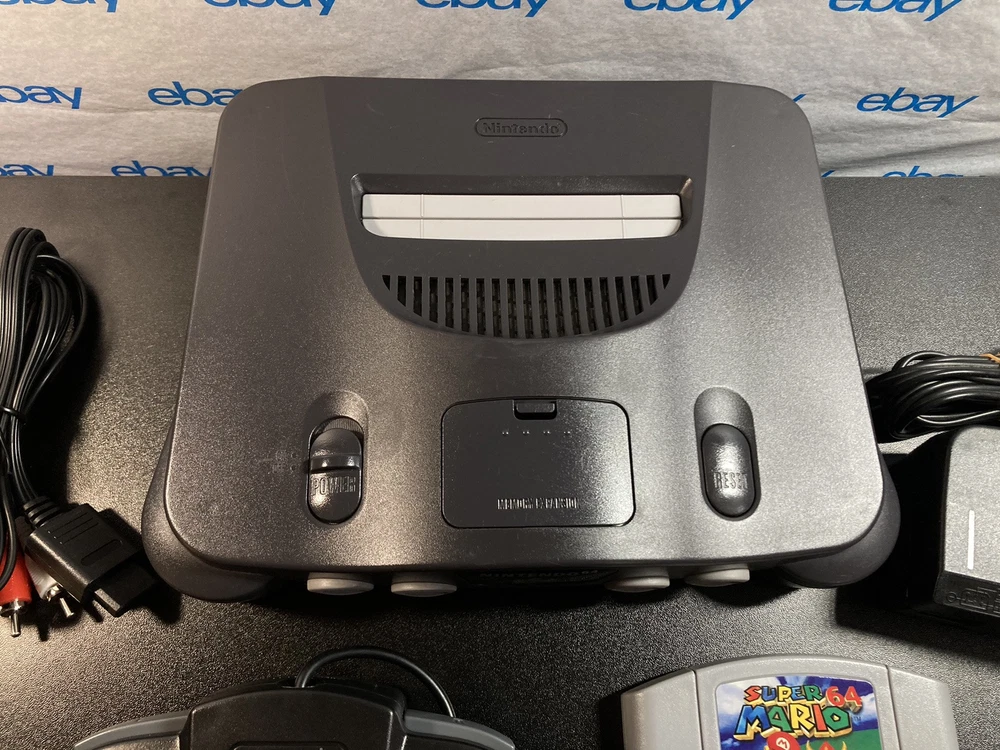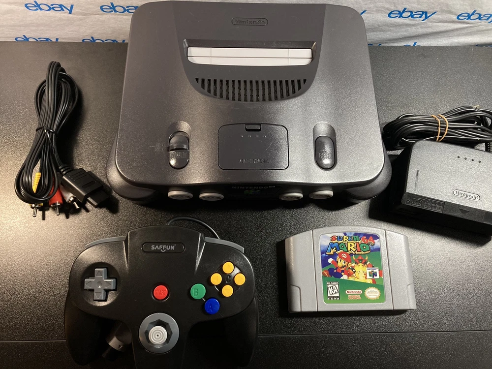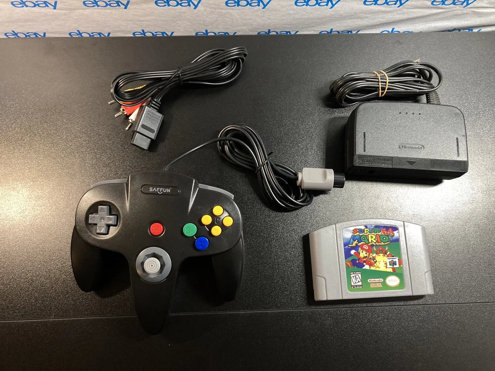 Nintendo 64 N64 Console with Super Mario 64, Black Controller, and Cables. Includes Power Cord, 3rd party av cables, and controller. The controller is a brand new Black 3rd party controller . This listing has 30 day free returns. Super Mario 64 is a new high quality copy. Shipped with USPS Priority Mail with same day handling before 11a.m. est on weekdays so you can play as soon as possible!!! Feel free to ask any questions you have! Every item will be packed carefully with bubble wrap like I would want to receive it!