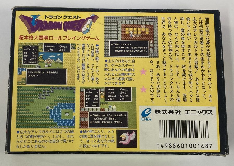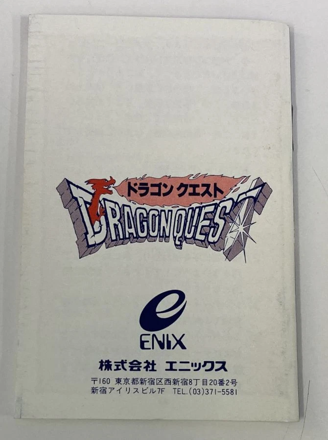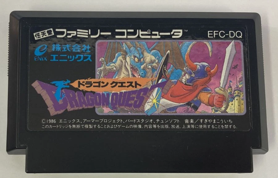Region Code: NTSC-J (Japan) Model: Dragon Quest gtin13: 4988601001687 Genre: Role-Playing Publisher: Enix Corporation Release Year: 1986 Country/Region of Manufacture: Japan Platform: Famicom Style: Game software Game Name: Dragon Quest MPN: EFC-DQ UPC: 4988601001687 Brand: Nintendo